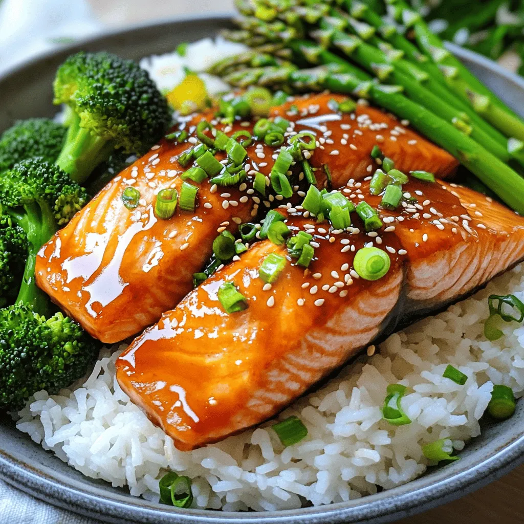 ![- 4 salmon fillets (about 6 ounces each) - 1/4 cup soy sauce (low-sodium) - 1/4 cup honey - 2 tablespoons rice vinegar - 1 tablespoon grated fresh ginger - 2 cloves garlic, minced - 1 tablespoon sesame oil The main ingredient is salmon. You want fresh fillets for the best taste. Low-sodium soy sauce adds flavor without too much salt. Honey gives a sweet touch that balances the sauce. Rice vinegar adds a nice tang, while ginger and garlic bring warmth. Sesame oil adds richness and depth. - 2 tablespoons green onions, finely chopped (for garnish) - 1 tablespoon sesame seeds (for garnish) - Steamed rice, for serving - Steamed broccoli or asparagus, for serving Garnishes can make your dish pop. Green onions add a fresh bite. Sesame seeds add crunch and look nice. For sides, steamed rice is perfect. It soaks up the sauce well. Broccoli or asparagus adds color and nutrition. These sides complete the meal and make it more filling. For the full recipe, check out the provided details. To make the teriyaki flavor pop, you need to mix the ingredients well. In a medium bowl, whisk together: - 1/4 cup low-sodium soy sauce - 1/4 cup honey - 2 tablespoons rice vinegar - 1 tablespoon grated fresh ginger - 2 cloves garlic, minced - 1 tablespoon sesame oil Mix until you have a smooth sauce. Low-sodium soy sauce is key. It keeps the dish from being too salty and allows the other flavors to shine. For marinating, place the salmon fillets in a resealable bag or shallow dish. Pour half of the marinade over them. Seal the bag or cover the dish. Let the salmon sit in the fridge for 30 minutes to 1 hour. This time helps the fish absorb the flavors. First, preheat your oven to 400°F (200°C). Once hot, remove the salmon from the marinade. Place it on a baking sheet lined with parchment paper. Brush the fillets with some of the remaining marinade. Bake the salmon for 12-15 minutes. You want it to be cooked through and flaky. In the last 2-3 minutes, turn on the broiler. Baste the salmon with more marinade. Broil until the top is caramelized and slightly crispy. Watch it closely to avoid burning. With these steps, you will have a simple and tasty teriyaki salmon that’s sure to impress! For the full recipe, check the section above. Understanding Cooking Times Cooking salmon can be simple when you know the times. For fillets, bake for 12 to 15 minutes at 400°F (200°C). Thicker pieces may need a bit longer. Always check the salmon's thickness. A good rule is to cook for about 4 to 6 minutes per half-inch of thickness. Checking for Doneness To check if your salmon is done, use a fork. Gently flake the thickest part. If it flakes easily and is opaque, it’s ready. You can also use a meat thermometer. Aim for an internal temp of 145°F (63°C). If you prefer it a bit less cooked, go for 125°F (52°C). Additional Marinade Ideas While the teriyaki marinade is great, you can mix it up. Try adding orange juice for sweetness or chili paste for heat. A splash of lime juice can brighten the flavor. You can also swap honey for maple syrup for a different sweetness. Alternative Ingredients for Varied Flavor Change up the salmon with different fish like trout or tuna. You can use coconut aminos instead of soy sauce for a soy-free option. Add fresh herbs like cilantro or basil for a pop of freshness. If you want a nutty flavor, toss in some crushed peanuts or walnuts. For the full recipe, check out the [Full Recipe]. {{image_2}} You can enjoy teriyaki salmon in many ways. The two most popular styles are grilled and baked. - Grilled Salmon: Grilling gives the salmon a smoky flavor. The high heat creates a nice char. Just brush the marinade on before grilling. Cook for about 4-6 minutes per side. Make sure to watch it closely! - Baked Salmon: Baking is easy and keeps your salmon moist. To bake, follow the full recipe. The oven cooks the salmon evenly. You end up with a tender, flavorful dish in about 15 minutes. Another fun way to enjoy teriyaki salmon is in a bowl. - Teriyaki Salmon Bowls: These bowls are great for a quick meal. Start with a base of rice or quinoa. Add your baked or grilled salmon on top. Then, load it up with your favorite veggies like broccoli, carrots, or bell peppers. Drizzle some extra teriyaki sauce for an added kick! If you have dietary needs, you can easily adjust this recipe. - Gluten-Free Options: To make this dish gluten-free, use tamari instead of soy sauce. Tamari has a similar taste but is gluten-free. This small swap allows everyone to enjoy the meal. - Low-Carb Variants: For a lower-carb meal, skip the rice. Instead, serve your salmon with steamed veggies. Zoodles (zucchini noodles) or cauliflower rice work great, too. They keep the meal light and healthy without losing the delicious flavors of teriyaki. These variations make teriyaki salmon a versatile meal that fits many diets. You can enjoy it your way! Refrigerating Cooked Salmon After cooking your teriyaki salmon, let it cool down. Place it in an airtight container. It will stay fresh in the fridge for up to three days. Make sure to store it in the main part of the fridge, not in the door. Freezing Recommendations If you want to keep it longer, freeze the salmon. Wrap it tightly in plastic wrap, then place it in a freezer bag. It can last for about three months in the freezer. Remember to label the bag with the date. Best Methods for Reheating Salmon When you are ready to eat, there are a few good ways to reheat your salmon. The oven is best for keeping it moist. Preheat your oven to 275°F (135°C) and place the salmon on a baking sheet. Heat it for about 15 minutes. You can also use a microwave. Just cover the salmon with a damp paper towel and heat in short bursts, checking often. Avoiding Dryness To prevent dryness, add a splash of water or broth when reheating. This will help keep it juicy. If using the microwave, heat it on low power. This gives it time to warm through without losing moisture. Can I use other types of fish? Yes, y