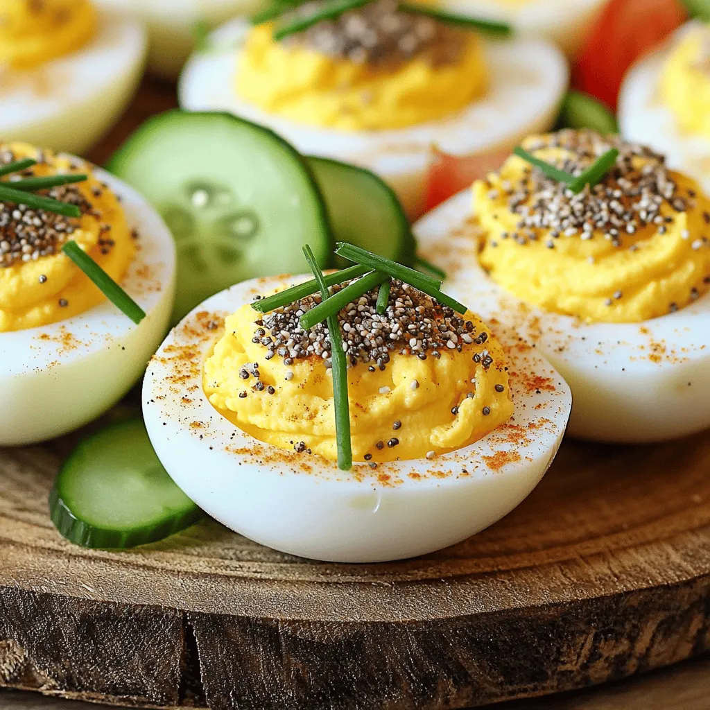 - 6 large eggs - 2 tablespoons mayonnaise - 1 teaspoon Dijon mustard - 1 teaspoon apple cider vinegar - Salt and pepper to taste - 2 tablespoons finely chopped chives - 2 tablespoons finely chopped red onion - 1 tablespoon everything bagel seasoning - Sliced cucumbers or tomatoes for garnish The main ingredients create a rich and creamy base. The eggs provide protein and texture. Mayonnaise adds creaminess while Dijon mustard gives it a little kick. Apple cider vinegar brightens the flavor. Don't forget to season with salt and pepper to taste! Flavor enhancers add depth to your deviled eggs. Chives bring a mild onion flavor. Red onion adds a bit of crunch and color. Everything bagel seasoning ties everything together with its mix of flavors. For a fresh touch, you can add garnishes. Sliced cucumbers or tomatoes make your dish pop. They also add a cool contrast to the creamy filling. You can find the full recipe above to guide you through the steps! - Bring a pot of water to a boil. - Carefully add the eggs and boil for 10-12 minutes. Boiling eggs seems simple, but timing is key. The right time will help you get hard-boiled eggs. If you boil them too long, the yolks will become dry and green around the edges. For perfect eggs, aim for that 10-12 minute mark. - Transfer eggs to an ice bath for 5-10 minutes. - Peel eggs under running water. Once the eggs are done boiling, a quick ice bath helps them cool fast. This makes peeling easier. I find that peeling under running water helps remove the shell without tearing the egg white. Plus, it keeps your hands clean! - Remove yolks and combine with mayonnaise, Dijon mustard, and apple cider vinegar. - Add chives, red onion, and half of the everything bagel seasoning. Next, we need to make that creamy filling. Remove the yolks and place them in a bowl. Add the mayonnaise, Dijon mustard, and apple cider vinegar. Mash everything until smooth. Then mix in chives, red onion, and half of the everything bagel seasoning for that amazing flavor. This mixture is what makes your deviled eggs shine. - Fill egg whites with the yolk mixture. - Sprinkle remaining everything bagel seasoning on top. - Optional garnishing with cucumber or tomato slices. Now comes the fun part! Fill each egg white half with the yolk mixture. I like to use a spoon, but a piping bag can make it look fancy. Once filled, sprinkle the remaining everything bagel seasoning on top. This adds an extra kick. If you want, add cucumber or tomato slices for a fresh touch. You can find the full recipe in the article to help you recreate this dish at home. Using older eggs makes peeling easier. Fresh eggs stick to the shell more. You can also add vinegar or baking soda to the boiling water. This helps the eggs peel off cleanly, making your deviled eggs look nice. You can get creative with your flavors. Try adding different herbs or spices to the filling. Fresh dill or smoked paprika can change the taste. You can also adjust how much everything bagel seasoning you add. More seasoning gives a bolder taste, while less keeps it mild. Pair your deviled eggs with fresh veggies. Carrots, celery, or bell peppers add crunch and color. These eggs work great as appetizers for parties. Arrange them on a platter for a beautiful display. You can also serve them with a dip for extra fun. {{image_2}} Want a kick in your deviled eggs? Add sriracha or hot sauce to the yolk mixture. This heat pairs well with the savory flavors of the everything bagel seasoning. Start by mixing in just a little and taste. You can always add more heat if you want! The spicy flavor makes these eggs a crowd-pleaser at any gathering. For a creamy twist, mix in some mashed avocado. This adds a rich texture that balances the crunch of the everything bagel seasoning. Simply mash ripe avocado with the egg yolks, mayonnaise, and seasonings. It gives a fresh taste and boosts the nutrients. Your guests will love this healthy variation. Bacon brings a savory crunch that enhances the filling. Chop crispy bacon bits and fold them into the yolk mixture. This adds a smoky flavor that complements the seasoning. You can sprinkle extra bacon on top for presentation. Everyone loves bacon, and this version will go fast! Try out these fun variations next time you make Everything Bagel Deviled Eggs. Each one offers a unique taste that keeps your guests coming back for more. For the complete recipe, check out the Full Recipe section. After your guests enjoy the Everything Bagel Deviled Eggs, you might have some left. Store these tasty bites in an airtight container. This helps keep them fresh and tasty. It’s best to eat them within 1-2 days for the best flavor and texture. Want to save time on party day? You can prep the filling ahead of time. Mix the yolks, mayo, mustard, vinegar, and seasonings. Store this filling in the fridge until you need it. Assemble the eggs just before serving. This keeps them fresh and looking great. Enjoy the full recipe for all the details! Yes, you can! Mustard adds flavor to your deviled eggs. Try yellow mustard for a milder taste. Spicy brown mustard gives it a kick. Even honey mustard can work if you like sweet flavors. Each option will change the taste a bit, so feel free to experiment. If you want a different base, you have options. Greek yogurt is a great choice. It adds creaminess and a tangy flavor. Sour cream works well too, giving a rich taste. You can also blend in mashed avocado for a creamy, healthy twist. Making these deviled eggs vegan is simple! Use silken tofu to create a smooth filling. Blend it until creamy and mix in your seasonings. Chickpea salad is another great option. Mash chickpeas and mix with mustard and spices for a tasty filling. Boiling eggs just right is key! For hard-boiled eggs, aim for 10-12 minutes. For soft-boiled, cook for about 6-7 minutes. Medium-boiled eggs take around 8-9 minutes. After boiling, always cool them in an ice bath to stop cooking. This helps with peeling too. Everything 