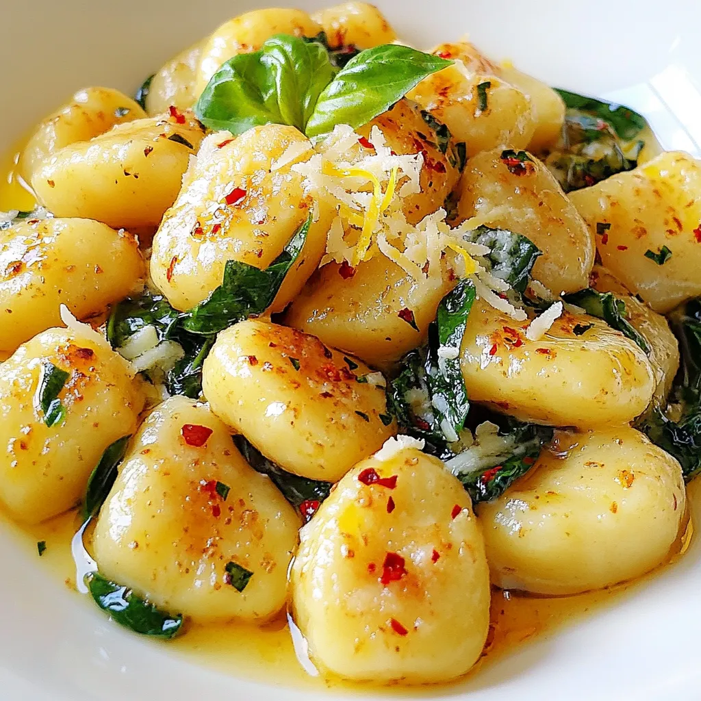 To make garlic butter gnocchi with spinach, you will need: - 1 pound potato gnocchi - 2 tablespoons unsalted butter - 4 cloves garlic, minced - 4 cups fresh spinach - Salt and pepper to taste - 1/2 cup grated Parmesan cheese - Zest of 1 lemon You can add some extra flavor with these ingredients: - 1/4 teaspoon red pepper flakes (for heat) - Fresh basil leaves for garnish If you have dietary needs, consider these substitutions: - For a vegan version, use plant-based butter and nutritional yeast instead of Parmesan. - If you're gluten-free, choose gluten-free gnocchi made from rice or corn. These ingredients create a simple yet tasty meal. The garlic and butter mix well with the soft gnocchi and fresh spinach. Feel free to adjust the flavors to suit your taste! {{ingredient_image_1}} First, fill a large pot with water. Add salt and bring it to a boil. Once boiling, add 1 pound of potato gnocchi. Cook them for about 2-3 minutes. They are ready when they float to the top. After they float, drain the gnocchi and set them aside. This step ensures the gnocchi will be soft and fluffy. Now, grab a large skillet and melt 2 tablespoons of unsalted butter over medium heat. Once the butter melts, add 4 cloves of minced garlic. Sauté the garlic for 1-2 minutes. You want it to smell nice but not brown. Next, stir in 4 cups of fresh spinach. Cook it until it wilts, about 2-3 minutes. If you like heat, add 1/4 teaspoon of red pepper flakes at this point. This will give the dish a nice kick! After the spinach wilts, add the cooked gnocchi to the skillet. Toss them gently to coat with the garlic and spinach mixture. Season with salt and pepper to taste. Remove the skillet from heat and mix in 1/2 cup of grated Parmesan cheese and the zest of 1 lemon. This adds a bright flavor that lifts the dish. Serve it right away, garnished with fresh basil leaves and extra Parmesan if you like. Enjoy your tasty Garlic Butter Gnocchi with Spinach! To cook gnocchi just right, start with boiling salted water. When the water bubbles, add the gnocchi gently. Watch closely; they cook fast. They need only about 2-3 minutes. When they float, they are done! Remove them quickly to keep them tender. Drain and set aside; they are ready for the next step. You can boost the flavor of your gnocchi dish easily. Try adding a splash of lemon juice for a bright taste. Fresh herbs like parsley or thyme can add depth too. For a little heat, sprinkle in red pepper flakes. The cheese adds creaminess and a savory kick. You can change it up based on your taste! Gnocchi with spinach is delicious on its own. To make it a full meal, pair it with grilled chicken or shrimp. A light salad with a tangy vinaigrette works well, too. For a cozy touch, serve it with crusty bread. Finish with a sprinkle of extra Parmesan and fresh basil for a lovely look! Pro Tips Fresh Spinach is Best: Use fresh spinach for the best flavor and texture. It wilts nicely and adds a vibrant color to the dish. Garlic Timing: Be careful not to overcook the garlic; sauté it just until fragrant to prevent bitterness. Adjusting Heat: If you like a little spice, adjust the red pepper flakes to your taste or use fresh chili for a different flavor profile. Lemon Zest for Brightness: The lemon zest adds a refreshing brightness to the dish, enhancing the overall flavor—don't skip it! {{image_2}} You can make this dish creamy by adding heavy cream. After you sauté the garlic and spinach, pour in about 1/2 cup of cream. Stir well and let it simmer for a few minutes. This adds a rich texture that pairs nicely with the gnocchi. If you want more flavor, add a little more cheese. Creamy garlic butter gnocchi is a rich delight! To make this dish more filling, try adding protein. Cook diced chicken or shrimp in the skillet before the garlic. Once they are done, add the garlic and spinach. This adds a hearty element to your meal. Season the protein with salt and pepper to enhance the taste. Adding protein makes this meal perfect for dinner! For a vegetarian twist, just skip the cheese or use a plant-based option. You can add extra veggies like mushrooms or bell peppers. For a vegan version, swap the butter for olive oil or vegan butter. Use nutritional yeast instead of Parmesan for a cheesy taste. These adaptations keep the dish fresh and exciting! To store leftovers, let the dish cool down first. Then, place the gnocchi in an airtight container. You can keep it in the fridge for up to three days. Make sure to cover it well to avoid drying out. When reheating, use a skillet for the best result. Heat a bit of butter over medium heat. Add the gnocchi and stir gently. This keeps the gnocchi soft and tasty. You can also add a splash of water to help steam it. Heat until warm, about five minutes. You can freeze gnocchi for later use. First, cook it as usual and let it cool completely. Then, spread the gnocchi on a baking sheet in a single layer. Freeze for about an hour. After that, transfer it to a freezer bag. It will stay good for up to three months. To cook, boil it straight from the freezer. Add a couple of extra minutes to the cooking time. Yes, you can use store-bought gnocchi. It saves time and effort. Look for fresh or frozen gnocchi in the pasta aisle. They often taste great and cook quickly. Just follow the package instructions for cooking times. You can use many greens instead of spinach. Kale, arugula, or Swiss chard work well. Each green gives a unique taste and texture. Just make sure to cook them until they wilt. This keeps the dish light and fresh. To make this dish gluten-free, choose gluten-free gnocchi. Many brands offer this option now. Check the package to ensure it’s gluten-free. The rest of the recipe is naturally gluten-free. Just be sure to watch for cross-contamination while cooking. This article covered making delicious gnocchi from scratch. We discussed key ingredients, steps, and easy tips. I shared ways to add flavor and suggested storage methods. You can enjoy