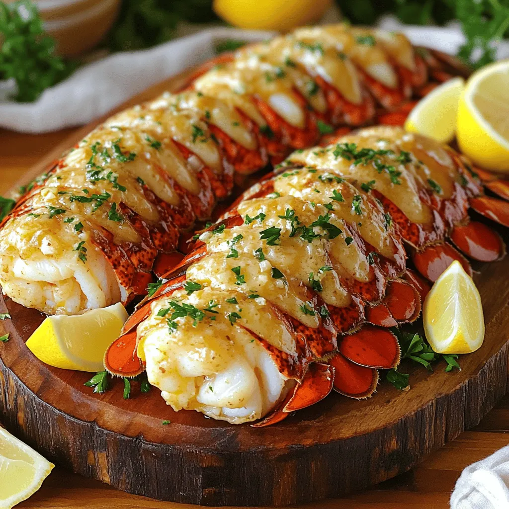 Here are the ingredients you need for garlic butter lobster tails: - 4 lobster tails - 1/2 cup unsalted butter - 4 cloves garlic, minced - 1 tablespoon fresh lemon juice - 1 teaspoon smoked paprika - 1 teaspoon sea salt - 1/2 teaspoon black pepper - 1 tablespoon fresh parsley, chopped (for garnish) - Lemon wedges (for serving) To make this dish, gather these tools: - Kitchen shears - Small saucepan - Baking dish - Brush for basting - Oven You can swap some ingredients if needed: - Use salted butter instead of unsalted for more flavor. - Fresh garlic can be replaced with garlic powder, but use less. - If you don’t have smoked paprika, regular paprika works too. - For a citrus twist, try lime juice instead of lemon juice. To start, get your lobster tails ready. Use kitchen shears to split them in half lengthwise. This step is key. It helps the flavors soak in better. After splitting, gently pull the meat out. Place it on top of the shell. This makes for a beautiful presentation. Next, we prepare the garlic butter sauce. Melt 1/2 cup of unsalted butter in a small saucepan over medium heat. Add 4 minced garlic cloves to the melted butter. Sauté for about 1-2 minutes. Be careful not to burn the garlic; this can ruin the flavor. Now, stir in 1 tablespoon of fresh lemon juice, 1 teaspoon of smoked paprika, 1 teaspoon of sea salt, and 1/2 teaspoon of black pepper. Let the mixture bubble for another minute. This sauce is rich and fragrant. Now it’s time to bake the lobster tails. Place them in a baking dish. Brush the tails generously with the garlic butter mixture. Make sure the meat is well-coated. Drizzle any leftover garlic butter on top. Bake in a preheated oven at 425°F (220°C) for 12-15 minutes. The lobster meat should be opaque and firm. You want the internal temperature to hit 140°F (60°C). Once cooked, take them out of the oven and let them cool a bit. Garnish with fresh parsley and serve with lemon wedges on the side. Enjoy this rich and savory delight! Select lobster tails that feel firm and heavy. Look for a smooth shell without cracks. The color should be vibrant, not dull. If possible, ask for tails from cold waters. They often have better flavor and texture. Fresh tails should smell like the sea, not fishy. Start with quality unsalted butter. It gives you full control over the dish's saltiness. Use fresh garlic for the best taste. Mince it finely to release more flavor. Adding lemon juice brightens the dish. Smoked paprika adds richness and depth to the butter. Mix these well for a balanced flavor. Cooking time can vary with tail size. Larger tails may need more time, while smaller ones cook faster. Always check the internal temperature. It should reach 140°F (60°C) for safe eating. If unsure, cut into the meat; it should be opaque and white. Adjust cooking time based on your oven's heat. {{image_2}} To add some heat, mix a teaspoon of red pepper flakes into your garlic butter. This spicy kick pairs well with the rich taste of lobster. You can also use hot sauce in the butter mix. Adjust the heat to fit your taste. A little spice can make your dish pop! For a fresh twist, try adding herbs to your garlic butter. Chop fresh basil, thyme, or dill and mix them in. These herbs will add layers of flavor to your lobster. You can also use dried herbs if fresh ones aren’t available. Just remember, dried herbs are more potent, so use less. Grilling or broiling lobster tails creates a nice char. For grilling, preheat the grill to medium-high heat. Brush the tails with garlic butter and grill for 6-8 minutes. Flip them halfway through for even cooking. If broiling, place the tails on a baking sheet and broil for 10-12 minutes. Both methods give a smoky flavor that is hard to resist. For the full experience, check the full recipe for all the details! After you enjoy your garlic butter lobster tails, store any leftovers right away. Place them in an airtight container. This helps keep the lobster fresh. I recommend eating leftovers within two days. The lobster can lose its texture if it sits too long. When you’re ready to enjoy your lobster again, reheat it gently. Preheat your oven to 350°F (175°C). Put the lobster tails in a baking dish. Add a little extra garlic butter on top. Cover the dish with foil to keep the moisture in. Heat for about 10 minutes, or until warmed through. You can also reheat in the microwave for 1-2 minutes. Just cover it to prevent drying out. If you want to save your lobster tails for later, freezing is a great option. Start by letting them cool completely. Wrap each tail in plastic wrap tightly. Then, place them in a freezer bag or airtight container. They can stay in the freezer for up to three months. When you’re ready to cook them, thaw in the fridge overnight before reheating. This method keeps the flavor and texture intact. For the full experience, check out the Full Recipe. You can tell lobster tails are cooked when the meat turns opaque. The shell also turns bright red. The internal temperature should hit 140°F (60°C). This ensures the lobster is safe to eat. If you check the meat and it feels firm, it’s ready. It's simple to check. Use an instant-read thermometer for best results. If you don’t have one, cut into the thickest part of the meat. If it is white and opaque, it is cooked. Yes, you can use frozen lobster tails. Just make sure to thaw them first. The best way to thaw is in the fridge overnight. If you're short on time, place them in cold water for about 30 minutes. Avoid using hot water, as it can cook the meat unevenly. Frozen lobster tails can still be tasty. Just follow the same cooking method as fresh tails. You may need to adjust the cooking time slightly, so check the internal temperature. Garlic butter lobster tails pair well with many sides. Here are some great options: - Creamy mashed potatoes - Grilled asparagus - Garlic bread - Steamed broccoli - Lemon rice Each of these sides complements the rich, buttery flavor of