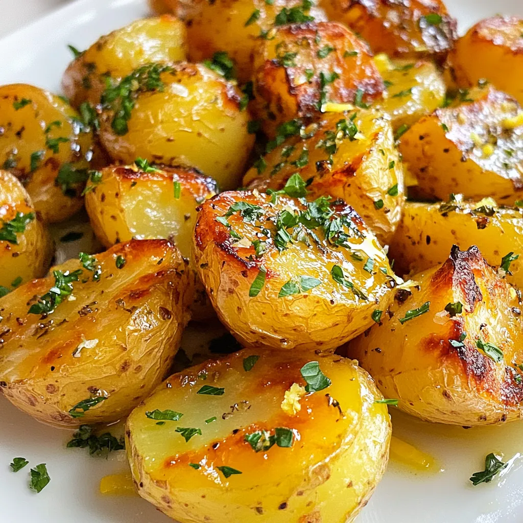 Add the cooked and dried potatoes to the skillet. Toss them in the garlic herb butter until they are well coated. Season with salt, black pepper, the zest of 1 lemon, and the juice of 1 lemon. Mix gently to combine everything. Next, transfer the potatoes onto a baking sheet lined with parchment paper. Spread them out in a single layer. Roast in the oven for 20 to 25 minutes. Flip the potatoes halfway through cooking. They should turn golden brown and crispy on the outside. When done, take them out and garnish with extra fresh herbs if you like.