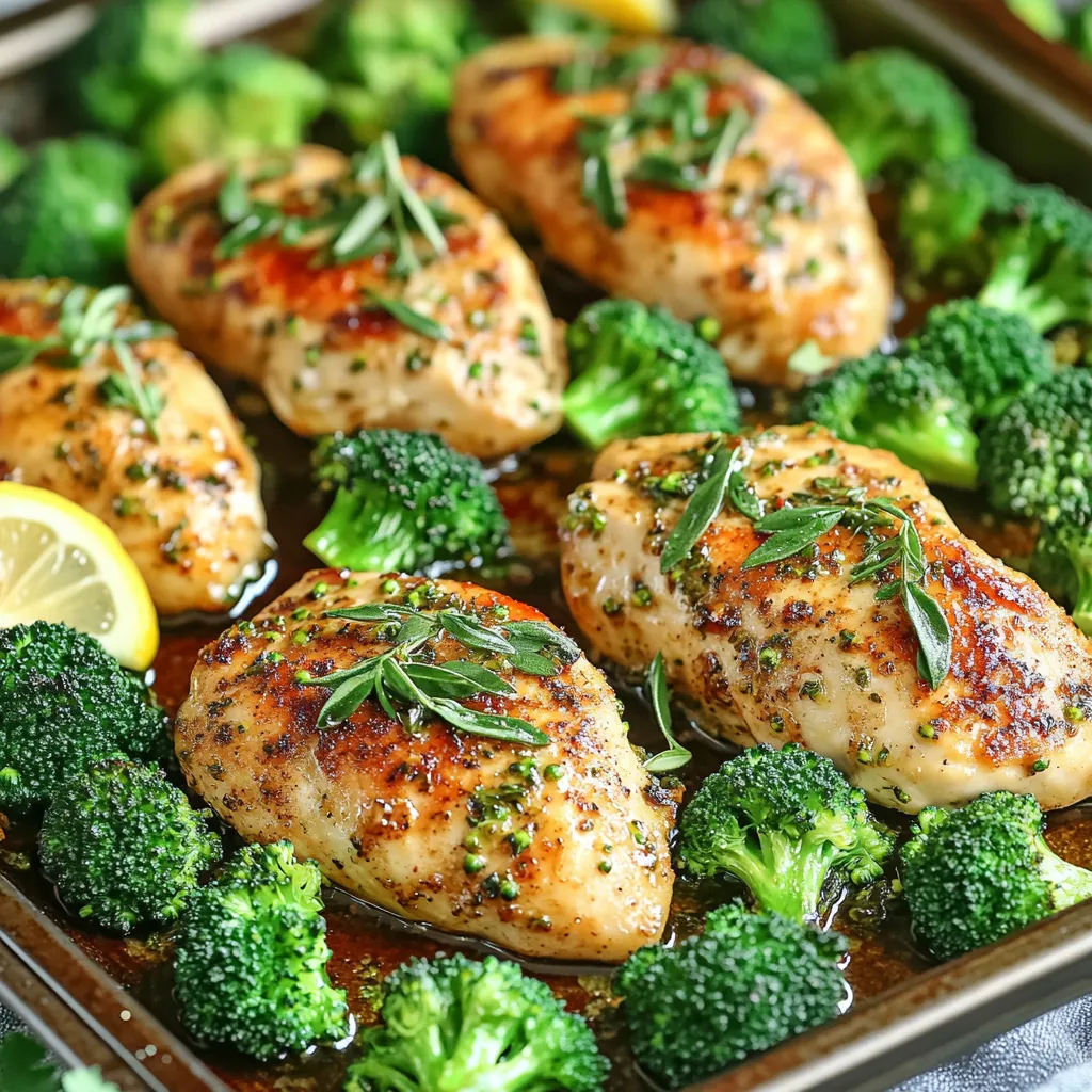 - 4 boneless, skinless chicken breasts - 1 pound broccoli florets - 4 cloves garlic, minced - 1 tablespoon fresh rosemary, finely chopped - 1 tablespoon fresh thyme, finely chopped The main stars of this dish are the chicken and broccoli. The chicken breasts give you protein, while the broccoli adds color and nutrients. Garlic and herbs bring great flavor to the mix. - 3 tablespoons olive oil - 1 teaspoon smoked paprika - 1/4 teaspoon red pepper flakes (optional) - Salt and pepper to taste - Zest of 1 lemon - 1 tablespoon lemon juice Using olive oil helps keep everything moist and tasty. The spices add warmth and depth. Lemon zest and juice brighten the dish, making it fresh and vibrant. You can skip the red pepper flakes if you prefer less heat. 1. First, preheat your oven to 400°F (200°C). This step is key for even cooking. 2. Next, prepare the marinade. In a small bowl, mix 2 tablespoons of olive oil, garlic, rosemary, thyme, smoked paprika, red pepper flakes, lemon zest, lemon juice, salt, and pepper. This mix adds a lot of flavor. - For effective marinating, make sure you coat the chicken well. Use a large bowl or a resealable bag. - Let the chicken marinate for at least 15 minutes. For more flavor, you can marinate it for up to 2 hours in the fridge. The longer it sits, the more the chicken absorbs the flavors. 1. While the chicken marinates, prepare the broccoli. In a separate bowl, toss the broccoli florets with the last tablespoon of olive oil, salt, and pepper. Coat them well. 2. Arrange the marinated chicken on one side of the baking sheet and the broccoli on the other side. Make sure they have space between them for even cooking. 3. Bake in the preheated oven for 25-30 minutes. Check that the chicken reaches an internal temperature of 165°F (75°C). The broccoli should be tender and slightly crisp. This process ensures you have juicy chicken and tasty broccoli in one dish. When making the marinade, you can change up the herbs. Try basil or parsley for a new twist. You can also add a dash of cumin for warmth. Use what you like to make it yours. To enhance flavor, let the chicken soak in the marinade for at least 15 minutes. If you have time, marinate it for up to 2 hours in the fridge. This helps the chicken absorb all the tasty goodness. Make sure every piece is well coated for the best flavor. Set your oven to 400°F (200°C). This high heat helps the chicken cook quickly and keeps it juicy. Line the baking sheet with parchment paper. This makes cleanup easy and helps the chicken and broccoli roast evenly. Space the chicken and broccoli apart on the sheet. This allows hot air to flow around them, cooking everything evenly. Check the chicken after 25 minutes. It should reach 165°F (75°C) for safe eating. The broccoli should be tender yet crisp. If you want a bit more color on the broccoli, broil it for a minute at the end. {{image_2}} You can mix things up with different veggies. Try adding bell peppers, carrots, or asparagus. These add color and flavor. For protein, you have choices! Instead of chicken, use turkey or firm tofu. Both options work well with the marinade. If you prefer seafood, shrimp is a tasty swap. Want to elevate your dish? Adding cheese can do the trick. Try parmesan or feta for a rich taste. Nuts like almonds or walnuts can add a nice crunch. For different spice profiles, think about changing the herbs. Use basil or oregano for a Mediterranean twist. If you like heat, add more red pepper flakes or cayenne pepper. This will give your dish a nice kick. To keep your Garlic Herb Chicken and broccoli fresh, follow these steps: - Refrigeration: Place leftovers in an airtight container. They will last in the fridge for 3-4 days. Make sure they cool down before sealing them. - Freezing: If you want to save for later, freeze them in a freezer-safe bag. Remove as much air as possible. They can stay good for up to 3 months. When you are ready to eat, thaw in the fridge overnight. You have two great options for reheating: - Microwave: This is fast and easy. Place your chicken and broccoli on a microwave-safe plate. Cover with a damp paper towel. Heat in short bursts, checking every minute. - Oven reheating: To keep it crispy, use the oven. Preheat to 350°F (175°C). Place the chicken and broccoli on a baking sheet. Heat for about 10-15 minutes until warmed through. Tips for retaining flavor and texture: - Add a splash of olive oil or a squeeze of lemon juice before reheating. This helps keep the flavors fresh. - Always check the chicken's temperature. It should be at least 165°F (75°C) to ensure it’s safe to eat. Garlic Herb Chicken and broccoli stay fresh for up to four days in the fridge. Store it in an airtight container to keep it tasty. When you reheat it, make sure to check that it is warm all the way through. This way, you can enjoy your meal over a few days without losing flavor. Yes, you can use frozen broccoli! Just note that frozen broccoli cooks faster than fresh. Add it to the pan during the last ten minutes of baking. This will help it stay bright and crisp. If you prefer, you can thaw it first. Just make sure to pat it dry to avoid excess water on your sheet pan. The chicken should reach an internal temperature of 165°F (75°C). Use a meat thermometer to check this. Insert it into the thickest part of the chicken breast. This ensures it is safe to eat and has cooked properly. Cooking it to this temperature keeps your dish safe and juicy! In this post, we covered how to make Garlic Herb Chicken and Broccoli. We discussed the main ingredients, including chicken, broccoli, garlic, and herbs. You learned how to prepare the marinade and tips for marinating. We also shared important cooking techniques for roasting. Explore variations to keep meals exciting, like ingredient swaps or flavor boosts. Remember, proper storage keeps leftovers fresh. Whether you're a beginner or a pro, this recipe is simple and tasty. Enjoy making this dish and share you