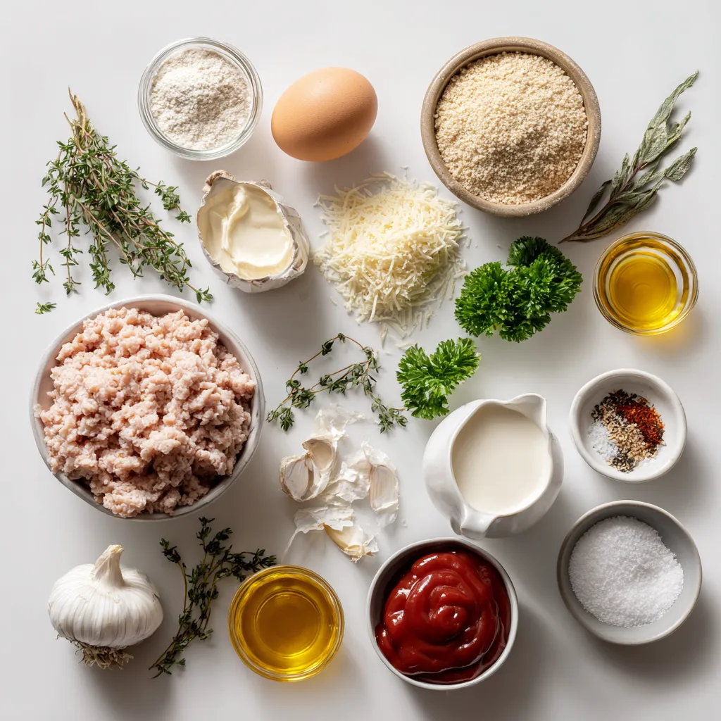 - In a large mixing bowl, combine the ground chicken, breadcrumbs, grated Parmesan cheese, chopped onion, minced garlic, parsley, thyme, oregano, Dijon mustard, egg, and milk.