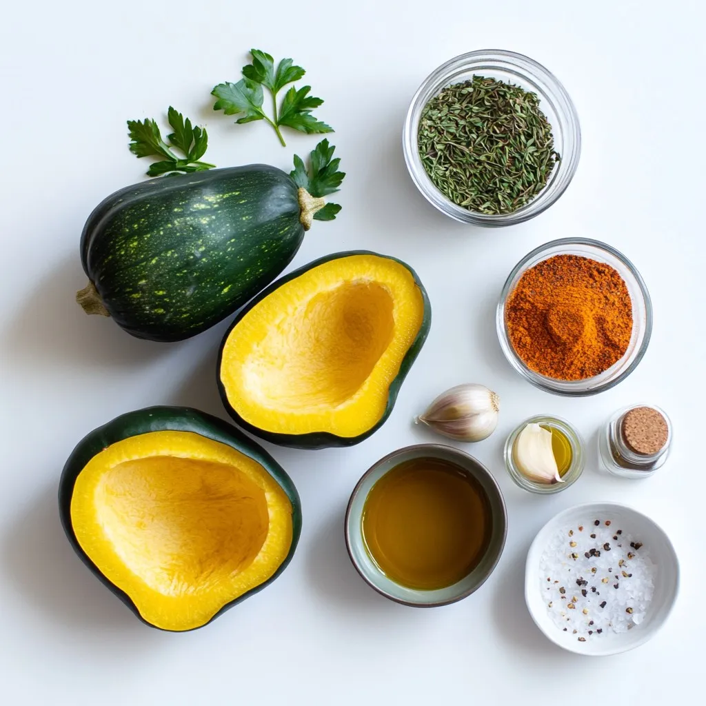 Acorn squash is sweet and nutty. It has a rich orange flesh. Garlic adds a bold flavor and aroma. Olive oil gives a nice, smooth texture and helps with roasting. Thyme and rosemary bring warm, earthy notes. Smoked paprika adds a slight kick and depth. Salt and pepper enhance all the flavors. Fresh parsley adds color and freshness as a garnish.
