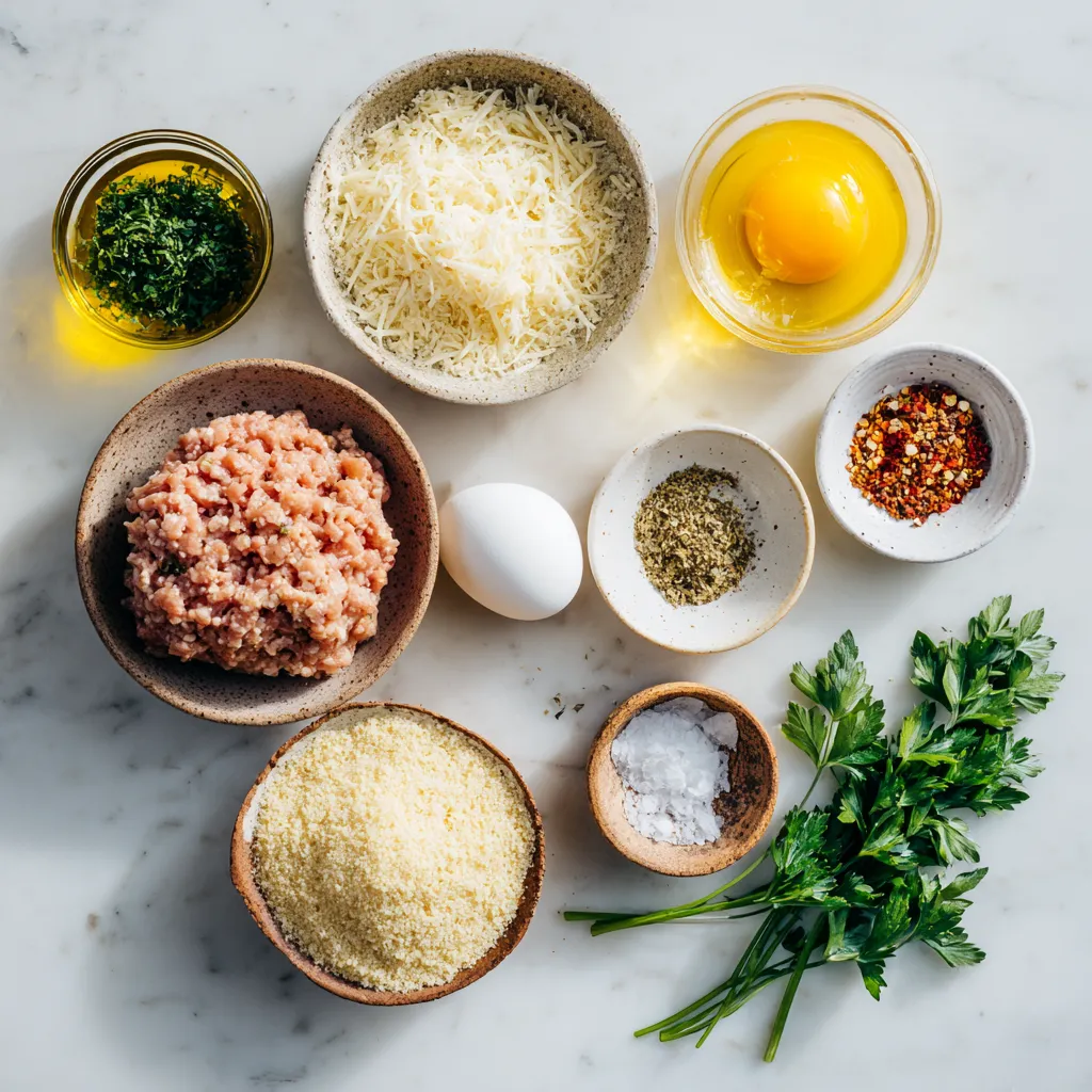 - In a large mixing bowl, combine the ground chicken, grated Parmesan cheese, breadcrumbs, minced garlic, chopped parsley, egg, oregano, salt, pepper, and red pepper flakes (if using).