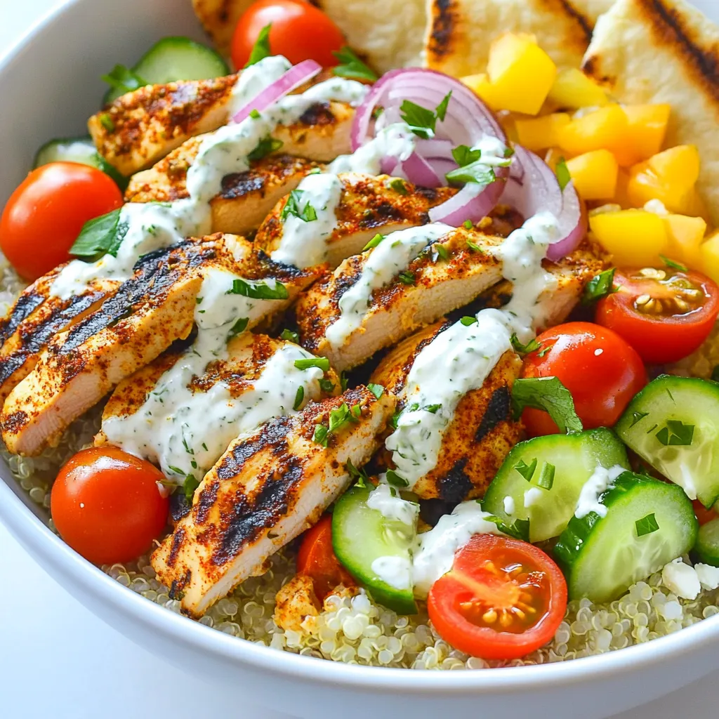 Now, it’s time to build your bowls. Start with a base of 1 cup of cooked quinoa in each bowl. Next, add the sliced grilled chicken on top. Then, layer in halved cherry tomatoes, diced cucumber, and thinly sliced red onion. Drizzle the tzatziki sauce generously over everything. For a beautiful finish, sprinkle fresh parsley on top and add crumbled feta cheese if you like. Serve with warm pita bread on the side for a complete meal.