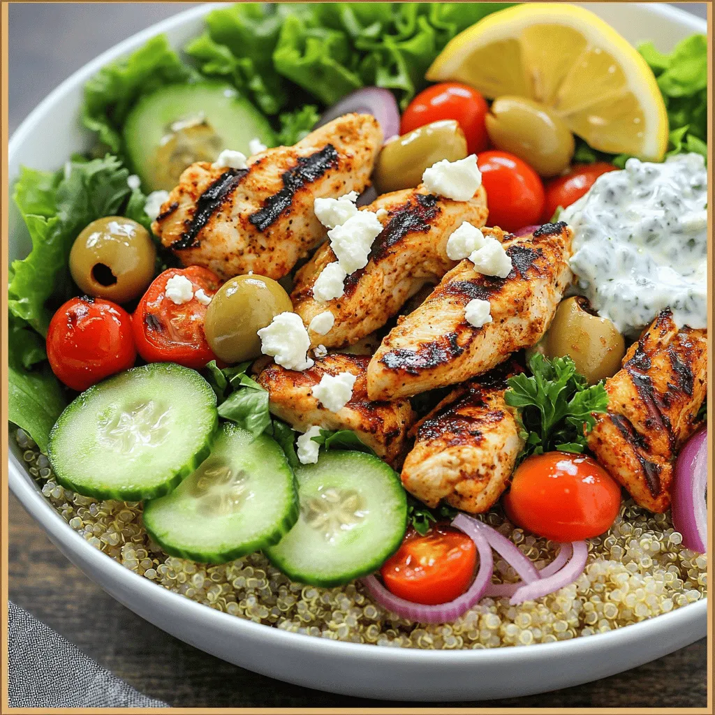 For a true Greek experience, I love topping my bowls with crumbled feta. Its tangy flavor pairs well with the chicken and veggies. Kalamata olives add a nice briny touch. Lastly, tzatziki sauce gives a creamy, cool finish that ties everything together. Don’t forget to serve your bowl in a vibrant dish for that extra pop!