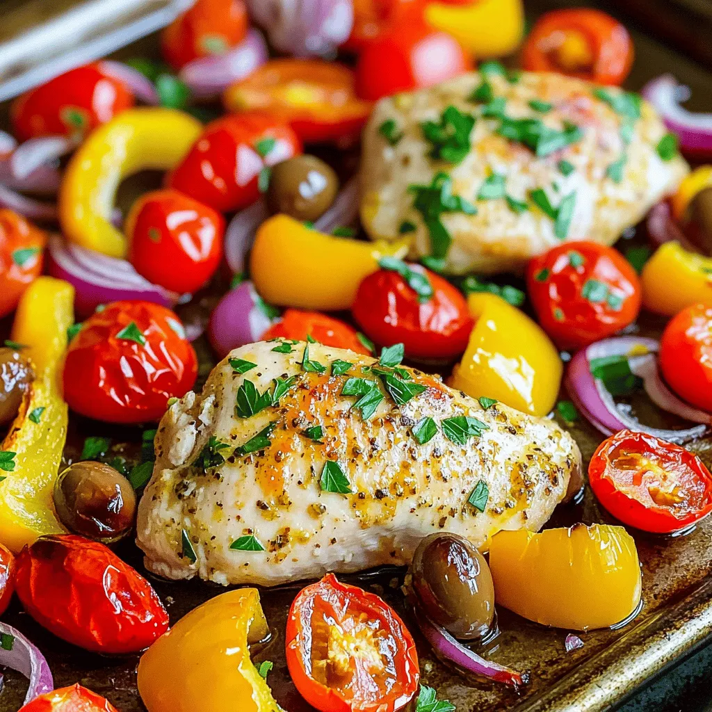 ![For this Greek Chicken Sheet Pan Dinner, you will need these main ingredients: - 4 boneless, skinless chicken breasts - 1 cup cherry tomatoes, halved - 1 red bell pepper, sliced - 1 yellow bell pepper, sliced - 1 medium red onion, cut into wedges - 1 zucchini, sliced - 1 cup kalamata olives, pitted - 3 cloves garlic, minced - 2 tablespoons olive oil - 2 teaspoons dried oregano - 1 teaspoon paprika - Juice of 1 lemon - Salt and pepper, to taste - Fresh parsley, chopped (for garnish) These fresh ingredients bring wonderful flavors and colors to the dish. The chicken is lean, while the veggies add crunch and sweetness. The olives give a salty bite, making this dish truly special. You can add extra flavor with these optional ingredients: - Additional herbs like thyme or rosemary - Substitute vegetables such as asparagus or carrots - Alternate proteins like shrimp or tofu Feel free to mix and match to suit your taste. Adding different herbs can change the flavor profile completely. Using other veggies keeps it fun and fresh. For a protein swap, shrimp cooks quickly and adds a different twist. You can find the full details in the [Full Recipe]. Preheating the oven and preparing the baking sheet Start by preheating your oven to 400°F (200°C). This step ensures even cooking. While the oven heats, take a large rimmed baking sheet and line it with parchment paper. This makes cleanup a breeze. Marinating the chicken In a large bowl, mix olive oil, minced garlic, dried oregano, paprika, lemon juice, salt, and pepper. This mix creates a flavorful marinade. Add the chicken breasts and toss them well. Make sure every piece gets coated. Let them marinate for about 20 minutes while you prepare the veggies. Arranging the chicken and vegetables After marinating, place the chicken breasts in the center of the baking sheet. Surround them with cherry tomatoes, sliced bell peppers, onion, zucchini, and kalamata olives. Drizzle any leftover marinade over the veggies to enhance their taste. Add a pinch of salt and pepper if you want. Roasting times and tips for optimal results Roast the pan in your preheated oven for 25 to 30 minutes. Check if the chicken is cooked through and the veggies are tender and a bit charred. If you have a meat thermometer, the chicken should reach 165°F (74°C). Once cooked, let it rest for 5 minutes. This helps keep the chicken juicy. Before serving, sprinkle fresh parsley on top for color and flavor. For the full recipe, check the section above. For the best flavor, marinate your chicken well. I suggest using a mix of olive oil, garlic, oregano, paprika, lemon juice, salt, and pepper. Let the chicken sit in the marinade for about 20 minutes. This short wait lets the flavors seep in without making it mushy. To check for doneness, cut a piece of chicken in the thickest part. It should be white and juicy inside, with no pink. You can also use a meat thermometer. The safe temperature for chicken is 165°F (75°C). Trust me, this simple check helps ensure a tasty meal. Getting the right texture for your veggies is key. Cut them into even pieces to ensure they cook at the same rate. I love using cherry tomatoes, bell peppers, onions, zucchini, and olives for this dish. They add color and taste. Combine flavors by placing vegetables around the chicken on the sheet pan. Drizzle the remaining marinade on top of them. This way, all the veggies soak up those great flavors. Cook until they are tender and slightly charred. This brings out their natural sweetness and adds a nice crunch. For the full recipe, check the details above. {{image_2}} You can change the flavor of your Greek chicken sheet pan dinner easily. Herbs and spices can make a big difference. For example, instead of oregano, try thyme or rosemary. These herbs add a unique twist. You can also add a touch of cumin for warmth or chili flakes for heat. If you want to change the marinade, you have options too. Swap lemon juice for red wine vinegar for a tangy taste. You can also use yogurt to marinate the chicken. This will make it tender and add a creamy texture. Experiment with these changes to find a flavor profile you love! Using different proteins can create a fun new dish. Shrimp can be a great swap for chicken. Just reduce the cooking time to about 10-15 minutes. Tofu is another great option for a plant-based meal. Press it to remove water, and then marinate it just like the chicken. You can also explore other vegetable combinations. Try adding asparagus or broccoli for a crunchy texture. Sweet potatoes can add a sweet flavor, too. Mix and match to find what works best for you. These swaps will keep your meals exciting and fresh. Check out the Full Recipe to see all the options! To keep your Greek Chicken Sheet Pan Dinner fresh, store leftovers right away. Place the chicken and veggies in an airtight container. Make sure to cool them to room temperature first. This way, you avoid extra moisture that can make food soggy. Refrigerate the leftovers for up to three days. If you want to keep them longer, consider freezing. For freezing, pack the meal in freezer-safe bags. Be sure to remove as much air as possible. Label each bag with the date. You can freeze the dish for up to three months. This method helps keep the flavors intact. When it’s time to enjoy your leftovers, reheating is key. The best way to do this is in the oven. Preheat your oven to 350°F (175°C). Place the chicken and veggies on a baking sheet. Cover with aluminum foil to keep them moist. Heat for about 15-20 minutes. If you prefer the microwave, use a microwave-safe plate. Heat in short bursts of one minute, stirring in between. This ensures even heating. To revive the flavors, drizzle a little olive oil and a squeeze of lemon juice on top before serving. This simple step brings back that fresh taste! How long to marinate chicken? You should marinate the chicken for about 20 minutes. This gives the flavors time to soak in. If you have more time, you can mar