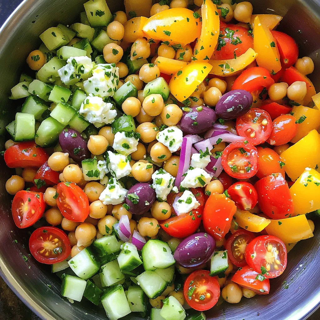 - 1 can (15 oz) chickpeas, drained and rinsed - 1 cup cherry tomatoes, halved - 1 cucumber, diced - 1/2 red onion, finely chopped - 1 bell pepper (any color), diced - 1/2 cup Kalamata olives, pitted and sliced - 1/2 cup feta cheese, crumbled - 3 tablespoons olive oil - 2 tablespoons lemon juice - 1 teaspoon dried oregano - Salt and pepper to taste - Fresh parsley for garnish This Greek chickpea salad shines due to its fresh ingredients. You can find chickpeas in any store. They provide protein and fiber. I love using canned chickpeas for quick prep. Rinse them well to remove any canning liquid. Next, I always choose bright cherry tomatoes. They add a sweet burst. Halve them so they mix well. Diced cucumber adds crunch and freshness. It makes every bite crisp. Red onion gives a sharp flavor. I chop it finely so it blends nicely. Bell peppers bring color and sweetness. Choose any color you like for fun! Kalamata olives add a briny taste. I slice them for easy eating. Crumbled feta cheese brings creaminess. It pairs well with all other flavors. For the dressing, I mix olive oil and lemon juice. This adds nice tang. Dried oregano gives an herbal kick. Don't forget salt and pepper to enhance all the flavors. Finally, fresh parsley makes a lovely garnish. It adds color and a hint of earthiness. You can find the full recipe at the end of this section. To make Greek Chickpea Salad, follow these clear steps. This salad is fresh, tasty, and easy to prepare. - Combine salad ingredients in a bowl: Start by adding the drained chickpeas, halved cherry tomatoes, diced cucumber, chopped red onion, diced bell pepper, and sliced Kalamata olives into a large bowl. Mix them gently with a spoon. - Prepare the dressing: In a separate small bowl, whisk together 3 tablespoons of olive oil, 2 tablespoons of lemon juice, 1 teaspoon of dried oregano, and a pinch of salt and pepper. This dressing adds great flavor. - Toss ingredients with dressing: Pour the dressing over the salad mixture. Toss everything together so that the dressing coats all the ingredients evenly. - Adjust seasoning to taste: Taste your salad. Add more salt, pepper, or lemon juice if you want more flavor. - Allow to marinate: Cover the bowl with plastic wrap or a lid and let it sit in the fridge for at least 30 minutes. This marinating time helps the flavors mix well. - Idea for garnishing with parsley: Before serving, chop some fresh parsley and sprinkle it on top. This adds color and a fresh taste. - Suggestions for serving temperature: Serve the salad chilled or at room temperature. Both ways taste great, so choose what you prefer. Make this Greek Chickpea Salad using the Full Recipe. It's a delightful dish that everyone will love! To make the dressing tangier, add more lemon juice. This brightens the salad. You can also add a splash of red wine vinegar. This will give it a nice kick. Marinating is key for flavor. Let the salad sit in the fridge for at least 30 minutes. This allows the ingredients to blend well. The more time it sits, the better it tastes. Greek Chickpea Salad pairs well with grilled meats or pita bread. It’s a great side dish for barbecues or picnics. For meal prep, this salad is perfect. You can pack it for lunch in jars. It stays fresh and tasty for a few days. Enjoy it at work or school. Check out the Full Recipe for all the details! {{image_2}} You can easily adapt Greek Chickpea Salad for different diets. To make it vegan, simply skip the feta cheese. You can replace it with vegan cheese or nutritional yeast for a cheesy flavor. For gluten-free options, this salad is a great choice as it contains no gluten ingredients. Always check labels to ensure any added items, like olives or dressings, are gluten-free. Feel free to switch up the beans! Black beans or kidney beans can work well too. If you want to try something different, lentils are a great choice. You can also add seasonal vegetables to make the salad more colorful. Try adding bell peppers in spring or roasted butternut squash in the fall. This keeps the dish fresh and exciting throughout the year. For the full recipe, refer to the earlier sections. To keep your Greek Chickpea Salad fresh, start by storing it in an airtight container. Make sure the lid seals well. This helps to keep air out and prevents wilting. If you have leftovers, place them in the fridge right away. - Separate dressing: Store the dressing apart from the salad. This keeps veggies crisp. - Use fresh herbs: Add herbs just before serving. They taste better fresh. Your salad stays good in the fridge for 3 to 5 days. After that, the veggies may start to lose their crunch. Check for any signs of spoilage before eating. - Freezing options: I do not recommend freezing this salad. The texture will change. However, you can freeze leftover chickpeas if needed. Just thaw them before using in a new dish. If you want to enjoy this salad later, stick to the fridge for best taste. For the full recipe, check out the Greek Chickpea Salad above! Can I make Greek Chickpea Salad ahead of time? Yes, you can make Greek Chickpea Salad ahead of time. It tastes even better after sitting for a few hours or overnight. This helps the flavors mix well. Just store it in the fridge in a covered bowl. Is this recipe suitable for meal prep? Greek Chickpea Salad is great for meal prep. It holds up well in the fridge. You can portion it into containers for easy grab-and-go meals. What are the health benefits of chickpeas? Chickpeas are very healthy. They are high in protein and fiber. This can help you feel full longer. They also have vitamins and minerals. Eating chickpeas can support heart health and digestion. Can I use dried chickpeas instead? Yes, you can use dried chickpeas. Just soak them overnight and cook until tender. This takes more time but can enhance flavor. How do I make this salad less salty? To make the salad less salty, reduce olives and feta cheese. You can also rinse the chickpeas well. Adding extra veggie