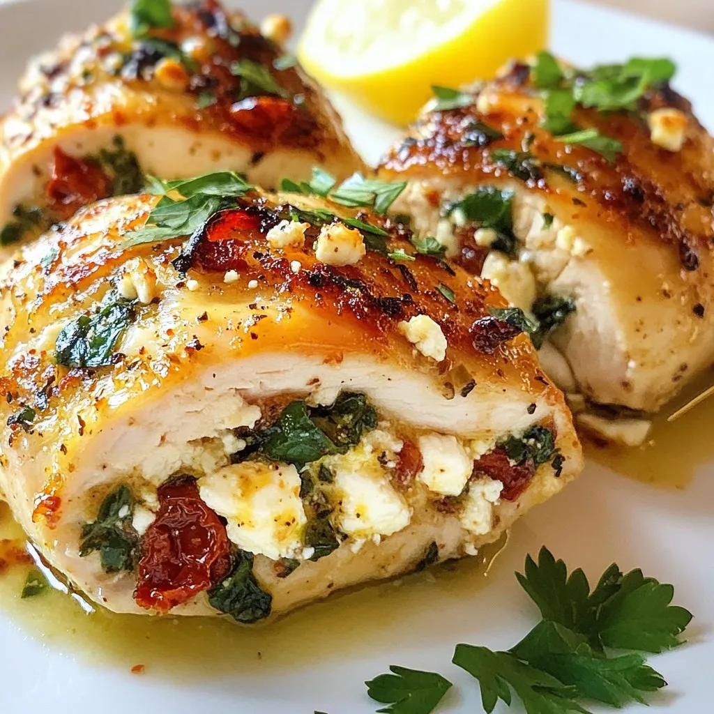 Delicious chicken breasts stuffed with a flavorful Greek filling of spinach, feta, and sun-dried tomatoes.