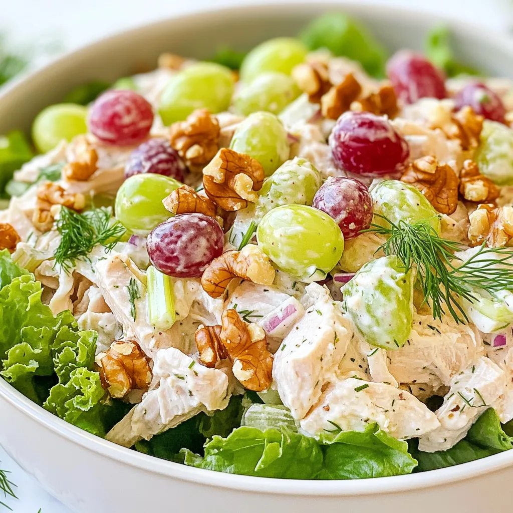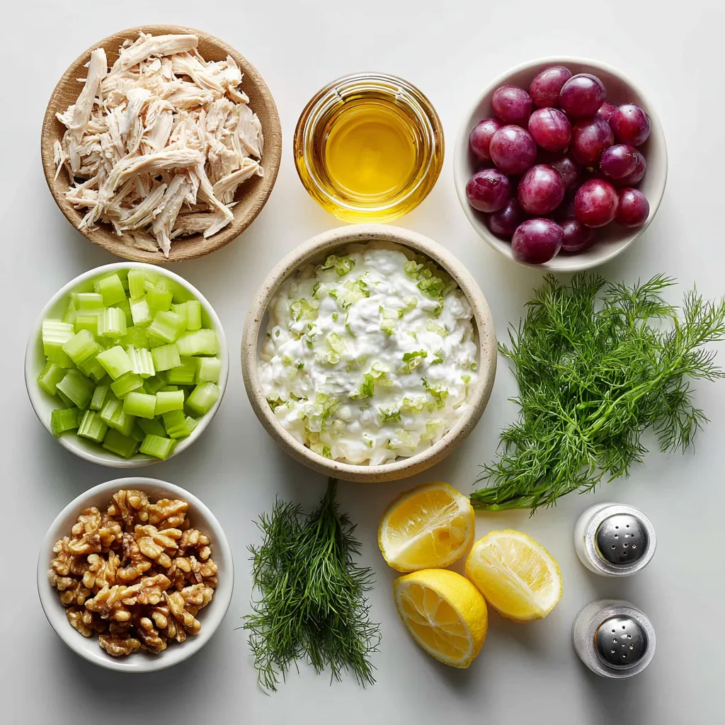 These ingredients create a blend of flavors and textures. The chicken provides protein, while Greek yogurt adds creaminess. Celery gives a nice crunch, and grapes add sweetness. Walnuts or almonds offer a nutty taste, and dill brings freshness. Honey and lemon juice balance the flavors with a hint of sweetness and acidity.