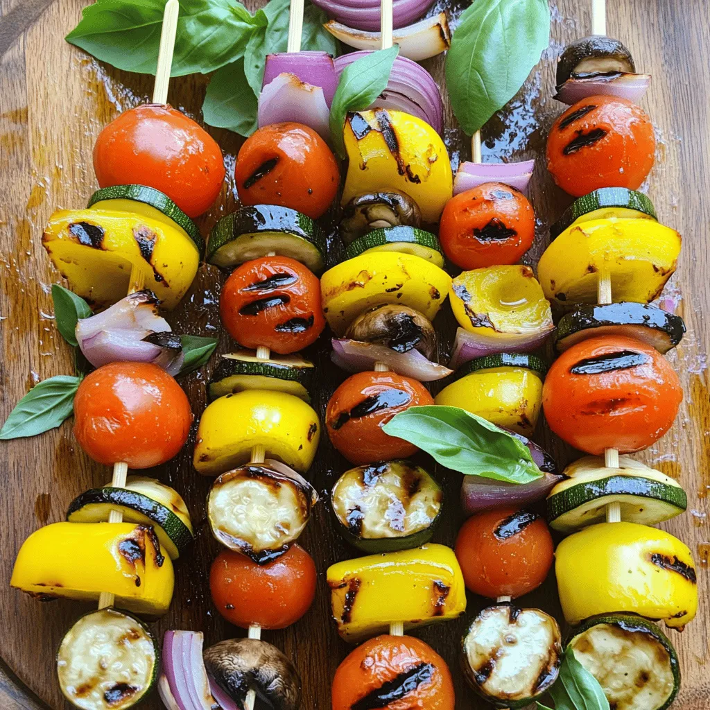 ![- 1 zucchini, sliced into thick rounds - 1 yellow bell pepper, cut into 1-inch pieces - 1 red onion, cut into wedges - 1 cup cherry tomatoes - 1 small eggplant, cubed - 1 cup button mushrooms, whole When I make grilled vegetable skewers, I love choosing fresh veggies. Each one brings its own taste and color. For the best results, slice the zucchini thick and cube the eggplant. This helps all the flavors blend well. - 1/4 cup olive oil - 2 tablespoons balsamic vinegar - 2 teaspoons garlic powder - 1 teaspoon smoked paprika - Salt and pepper to taste The marinade is key for great flavor. I mix olive oil and balsamic vinegar for a tangy base. Garlic powder and smoked paprika add depth. Don’t forget to sprinkle salt and pepper for balance. This mix makes the veggies shine. - Fresh basil leaves - Additional herbs Garnishes can elevate your dish. I like to add fresh basil leaves for a pop of color. You can also use other herbs that you enjoy. Herbs make each bite fresh and fragrant. They complete your grilled vegetable skewers beautifully. For the full recipe, check out the [Full Recipe]. To make great grilled vegetable skewers, start by slicing your vegetables. Cut the zucchini into thick rounds. This helps it stay firm on the grill. Chop the yellow bell pepper into 1-inch pieces. The red onion should be cut into wedges. For cherry tomatoes, leave them whole. Cube the eggplant into bite-sized pieces. Finally, keep the button mushrooms whole. This mix creates a colorful and tasty skewer. Now, let’s make the marinade. In a small bowl, mix together 1/4 cup of olive oil and 2 tablespoons of balsamic vinegar. Add 2 teaspoons of garlic powder and 1 teaspoon of smoked paprika. Don’t forget to add salt and pepper to taste. Whisk this together well. This marinade adds great flavor to your veggies. Once your vegetables are cut, place them in a large bowl. Pour the marinade over them and toss well. Make sure every piece is coated. Let them marinate for at least 15 minutes. While they soak, soak wooden skewers in water. This step stops them from burning on the grill. After marinating, thread the veggies onto the skewers. Alternate the types for a bright look. Your skewers are now ready for grilling! For great grilled vegetable skewers, your grill needs to be hot. Aim for medium-high heat, around 400°F. Cook them for about 8-10 minutes. Turn the skewers often. This helps the veggies cook evenly and get those lovely grill marks. If you use wooden skewers, soak them in water for 30 minutes before grilling. This step helps stop them from burning. If they burn, they can ruin the taste and look of your skewers. Soaking gives you better results and keeps your skewers intact. To make your skewers pop, use spices and herbs. I love garlic powder and smoked paprika for a tasty kick. Fresh herbs like basil brighten the dish. If you want to serve them, drizzle with olive oil and add a sprinkle of salt. You can even pair them with a zesty dip like tzatziki. For more ideas, check out the Full Recipe. {{image_2}} You can mix up the veggies in your skewers. If you want, try using broccoli, asparagus, or even carrots. Each vegetable brings its own taste and texture. For instance, mushrooms add a nice umami flavor. Try using eggplant instead of zucchini for a richer taste. You can also swap bell peppers with cherry tomatoes for a sweeter bite. This recipe is flexible, so have fun with it! Grilled vegetable skewers are great, but adding protein makes them even better. You can use cubed tofu or chicken to enhance the meal. Tofu absorbs flavors well, making it a tasty option. If you choose chicken, cut it into small, even pieces for even cooking. Marinate the protein with the vegetables for a unified flavor. This way, you create a satisfying dish that packs a punch. If you want a vegan twist, try different marinades. Use lemon juice, soy sauce, and maple syrup for a sweet and tangy flavor. You can also mix olive oil with herbs like rosemary and thyme. Coconut aminos work well for a soy-free option. These marinades add depth to your grilled veggies without dairy. Remember, the right marinade can make your skewers shine! For the full recipe, check out the details above. To keep your leftover skewers fresh, place them in an airtight container. This protects them from drying out. If you want to freeze them, wrap each skewer in plastic wrap. Then, put them in a freezer bag. This way, they stay tasty for later use. For reheating, the best method is to use the grill. Heat it to medium. Place the skewers on the grill for about 5 minutes. Turn them halfway to warm evenly. You can also use a microwave, but it may not keep the flavor as well. If you use a microwave, heat them in short bursts of 30 seconds. Grilled vegetable skewers last about 3 to 4 days in the fridge. If you freeze them, they can last for up to 3 months. Just remember, the sooner you eat them, the better the taste! Enjoy them chilled or warm for the best experience. Yes, you can use frozen vegetables. However, fresh veggies taste better. Frozen vegetables may lose some crunch. If you use them, thaw before skewering. Pat them dry to avoid excess moisture. This helps them grill better. You might need to adjust cooking time. Cook frozen veggies a bit longer. They may not get grill marks like fresh ones. Grilled vegetable skewers pair well with many dips. Tzatziki is a favorite. Its coolness balances the warm, grilled taste. Hummus also works nicely. It adds creaminess and flavor. You can try balsamic glaze for a sweet touch. Pesto is another great choice. It brings a fresh herb taste. Serve your skewers with any of these dips for extra flavor. You can grill vegetables in the oven too. Start by preheating your oven to 400°F (200°C). Arrange skewers on a baking sheet. Place them on the middle rack. Bake for about 15-20 minutes. Turn the skewers halfway through baking. This ensures even cooking. Keep an eye on them to avoid burning. Enjoy the same delicious flavor