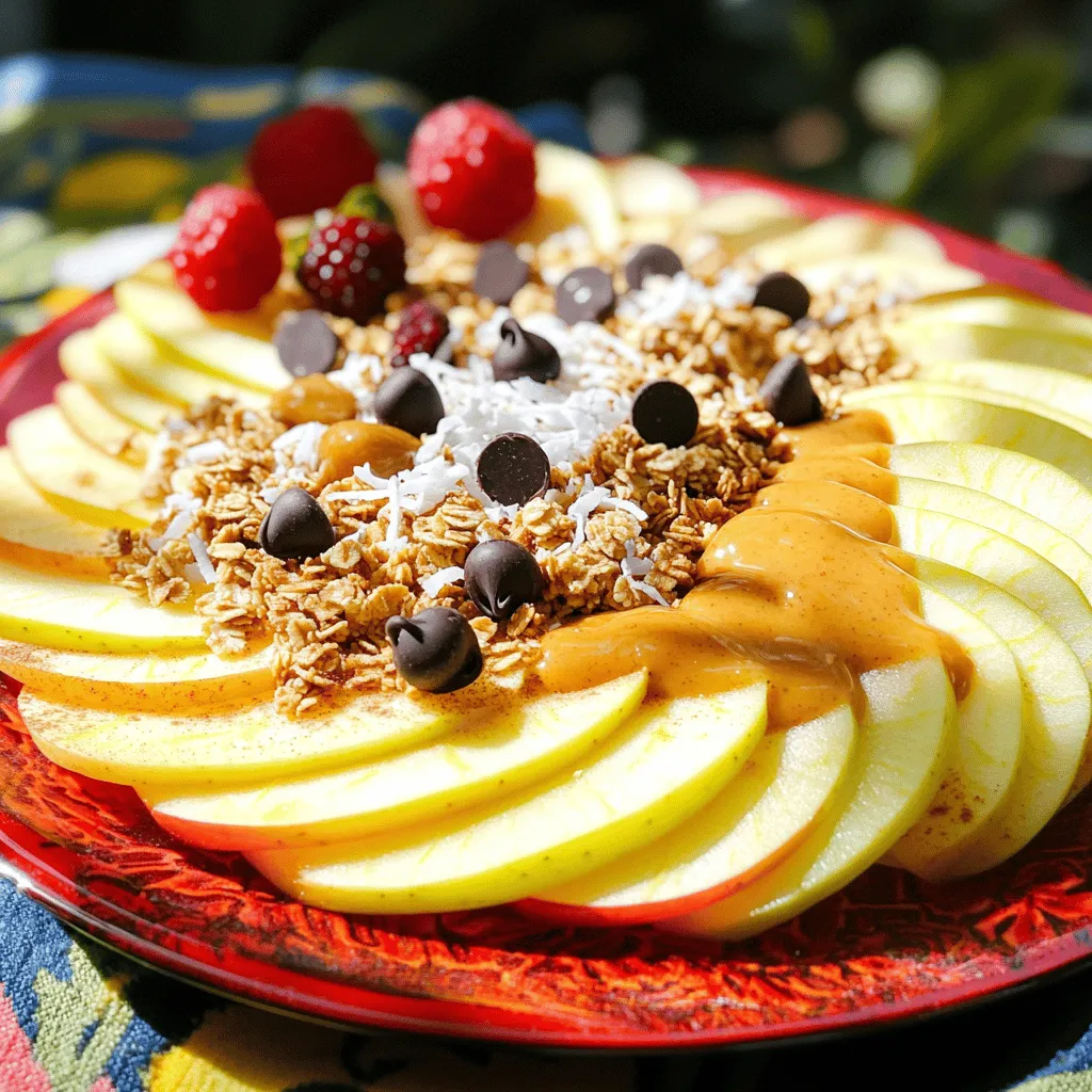 Now it’s time to layer your toppings! Drizzle the almond butter mix evenly over the apple slices. Each piece needs a little touch of sweetness. Next, sprinkle 1/4 cup of granola on top for that perfect crunch. Then, add 2 tablespoons of mini chocolate chips and 1/4 cup of shredded coconut. For a warm touch, finish with a pinch of cinnamon sprinkled over everything. If you want, add fresh berries on top for color and taste.Enjoy the fun and tasty experience of healthy apple nachos!