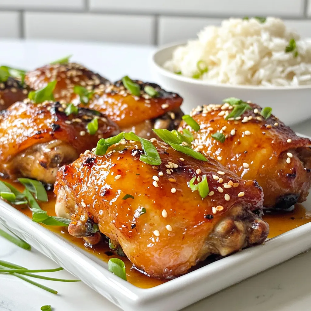 - 4 bone-in chicken thighs, skin-on - 1/3 cup honey - 4 cloves garlic, minced - 2 tablespoons low-sodium soy sauce - 1 tablespoon Dijon mustard - 1 tablespoon rice vinegar - 1 teaspoon grated fresh ginger - Salt and pepper to taste - 2 tablespoons sesame oil - 2 green onions, chopped - Sesame seeds - Mixing bowl - Whisk - Resealable plastic bag or shallow dish - Large oven-safe skillet - Oven - Meat thermometer {{ingredient_image_1}} To make the marinade, gather your mixing bowl. Add 1/3 cup of honey, 4 minced garlic cloves, 2 tablespoons of low-sodium soy sauce, 1 tablespoon of Dijon mustard, 1 tablespoon of rice vinegar, and 1 teaspoon of grated fresh ginger. Sprinkle in some salt and pepper. Whisk everything together until it blends well. This mix gives the chicken a sweet and savory flavor. Take 4 bone-in chicken thighs and place them in a resealable plastic bag or a shallow dish. Pour your marinade over the chicken, ensuring each piece is well-coated. Seal the bag or cover the dish tightly. Refrigerate it for at least 30 minutes. If you want a deeper flavor, marinate for up to 2 hours. This step is key for tasty chicken. Preheat your oven to 400°F (200°C). While it heats, grab a large oven-safe skillet and add 2 tablespoons of sesame oil. Heat it on medium-high heat. Remove the chicken from the marinade, allowing excess liquid to drip off, but keep the marinade for later. Place the chicken thighs skin-side down in the skillet. Sear them for about 5-7 minutes until they turn golden brown. Flip the thighs and sear the other side for another 5 minutes. After searing, pour the reserved marinade over the chicken thighs. Transfer the skillet to your preheated oven. Bake for 25-30 minutes, or until the chicken reaches an internal temperature of 165°F (75°C). The skin should look caramelized and delicious. Once done, let the chicken rest for a few minutes before serving. This helps keep the juices inside. Feel free to garnish with chopped green onions and sesame seeds. Serve it all on a large platter, drizzling any extra sauce from the skillet on top for a beautiful finish. Enjoy your flavorful meal! To get the best taste from your honey garlic chicken thighs, marinate them well. A good marinade blends sweet honey with savory garlic, soy sauce, and hints of ginger. I like to let the chicken soak for at least 30 minutes. If you have time, two hours deepens the flavor even more. This mix makes the meat juicy and packed with taste. Start by searing the chicken in sesame oil. This step creates a crispy skin. Heat the oil over medium-high heat. Cook the chicken skin-side down for 5 to 7 minutes. When it turns golden brown, flip it and sear the other side for 5 more minutes. This technique seals in juices. After searing, bake the chicken in the oven with the reserved marinade. Bake until it reaches 165°F. This ensures the chicken is tender and fully cooked. One common mistake is not marinating long enough. Skipping this step means missing out on flavor. Another mistake is cooking at too high a heat. High heat can burn the skin before the chicken cooks through. Lastly, don’t rush the resting time after baking. Letting the chicken rest for a few minutes keeps it juicy. Follow these tips for a perfect dish every time. Pro Tips Marination Time: Allow the chicken to marinate for at least 2 hours, or overnight if possible, to enhance the flavors. Heat Control: Ensure your skillet is hot enough before adding the chicken to achieve a nice sear, which helps to lock in moisture. Resting Period: Let the chicken rest for a few minutes after baking to allow the juices to redistribute, resulting in juicier meat. Garnish Thoughtfully: Fresh herbs and a sprinkle of sesame seeds not only enhance the presentation but also add a fresh flavor contrast. {{image_2}} You can switch up the protein in this recipe. Try using bone-in chicken breasts or drumsticks. For a twist, use pork chops or tofu for a vegetarian option. Each protein absorbs the honey garlic flavor well. Just adjust the cooking time based on the protein you choose. Remember, chicken needs to hit 165°F to be safe. Feel free to get creative with the marinade. You can replace honey with maple syrup for a different sweetness. Use balsamic vinegar instead of rice vinegar for a richer taste. If you like a kick, add red pepper flakes or chili paste. These changes let you customize the flavor to your liking. Serve honey garlic chicken thighs on a large platter. Drizzle leftover sauce from the skillet over the top. Pair this dish with steamed jasmine rice or stir-fried vegetables. You can also add a fresh salad for crunch. Don't forget to sprinkle sesame seeds and green onions for a pop of color! To store leftover chicken thighs, let them cool first. Place the chicken in an airtight container. Make sure to cover it tightly. Store it in the fridge for up to three days. Label the container with the date. This way, you won't forget when you made it. If you want to enjoy it later, consider freezing. To freeze the chicken thighs, follow these steps. Cool the chicken completely. Wrap each thigh in plastic wrap or foil. Place the wrapped thighs in a freezer-safe bag. Squeeze out as much air as possible. Label the bag with the date. You can freeze them for up to three months. When you’re ready to eat, just thaw them in the fridge overnight. When reheating, keep the chicken juicy and tasty. Preheat your oven to 350°F (175°C). Place the chicken in a baking dish. Add a splash of water or broth to keep it moist. Cover the dish with foil. Heat for about 20-25 minutes. Check that the internal temperature reaches 165°F (75°C). You can also reheat in the microwave for quick meals. Just cover it with a damp paper towel to avoid dryness. To check if chicken thighs are done, use a meat thermometer. Insert it into the thickest part of the thigh. The safe internal temperature is 165°F (75°C). If you do not have a thermometer, cut into the chicken. The juices should r