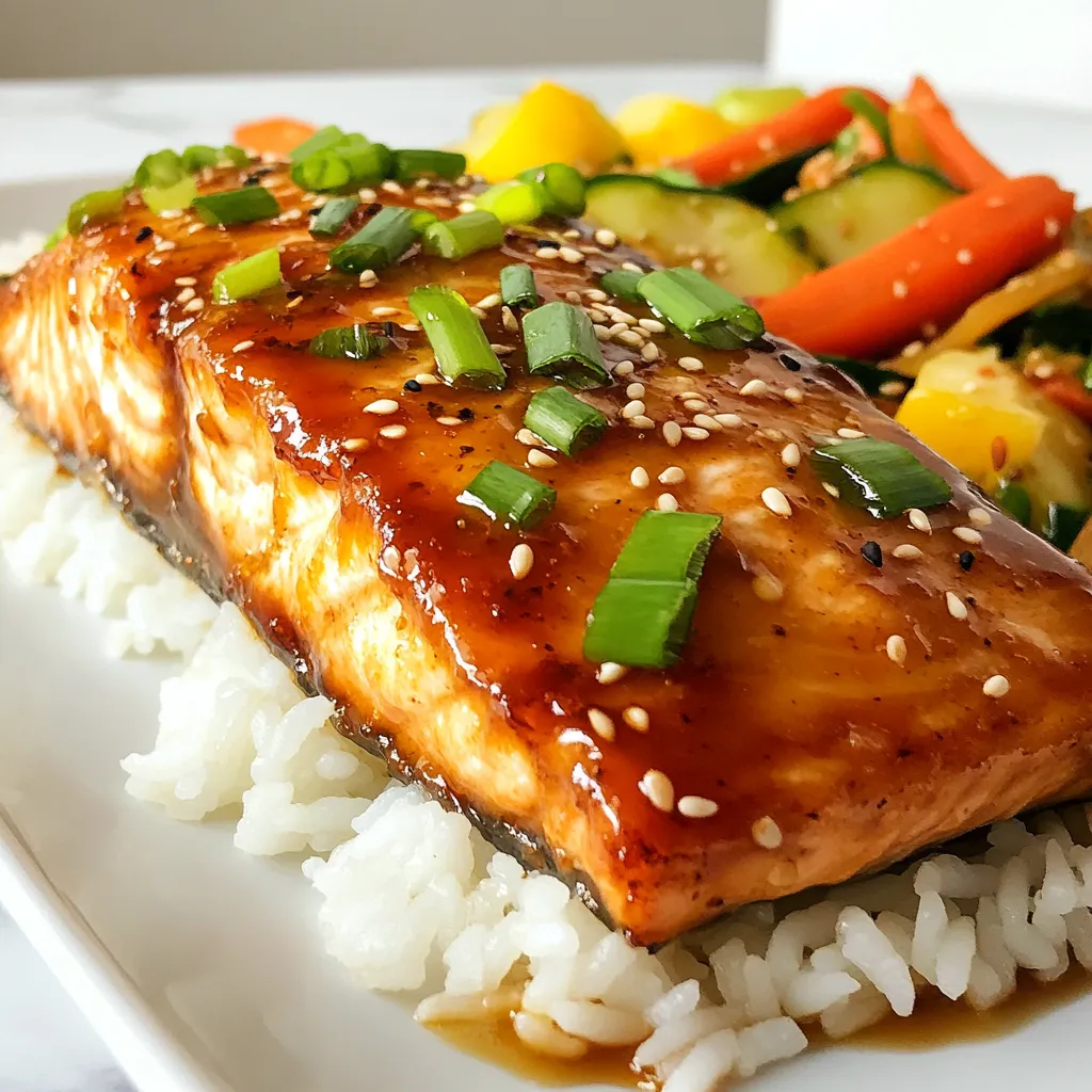 After cooking, remove the salmon from heat. Let it rest for a minute. Drizzle the reserved glaze over the top. For a nice touch, garnish with chopped green onions and sesame seeds. Serve the glazed salmon on a warm plate. Pair it with steamed rice and sautéed vegetables. Drizzle extra glaze over the veggies for added flavor. Enjoy your beautiful and tasty meal!