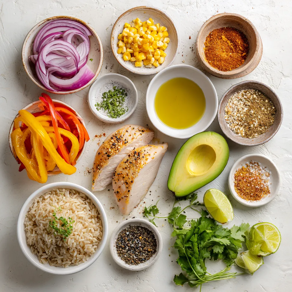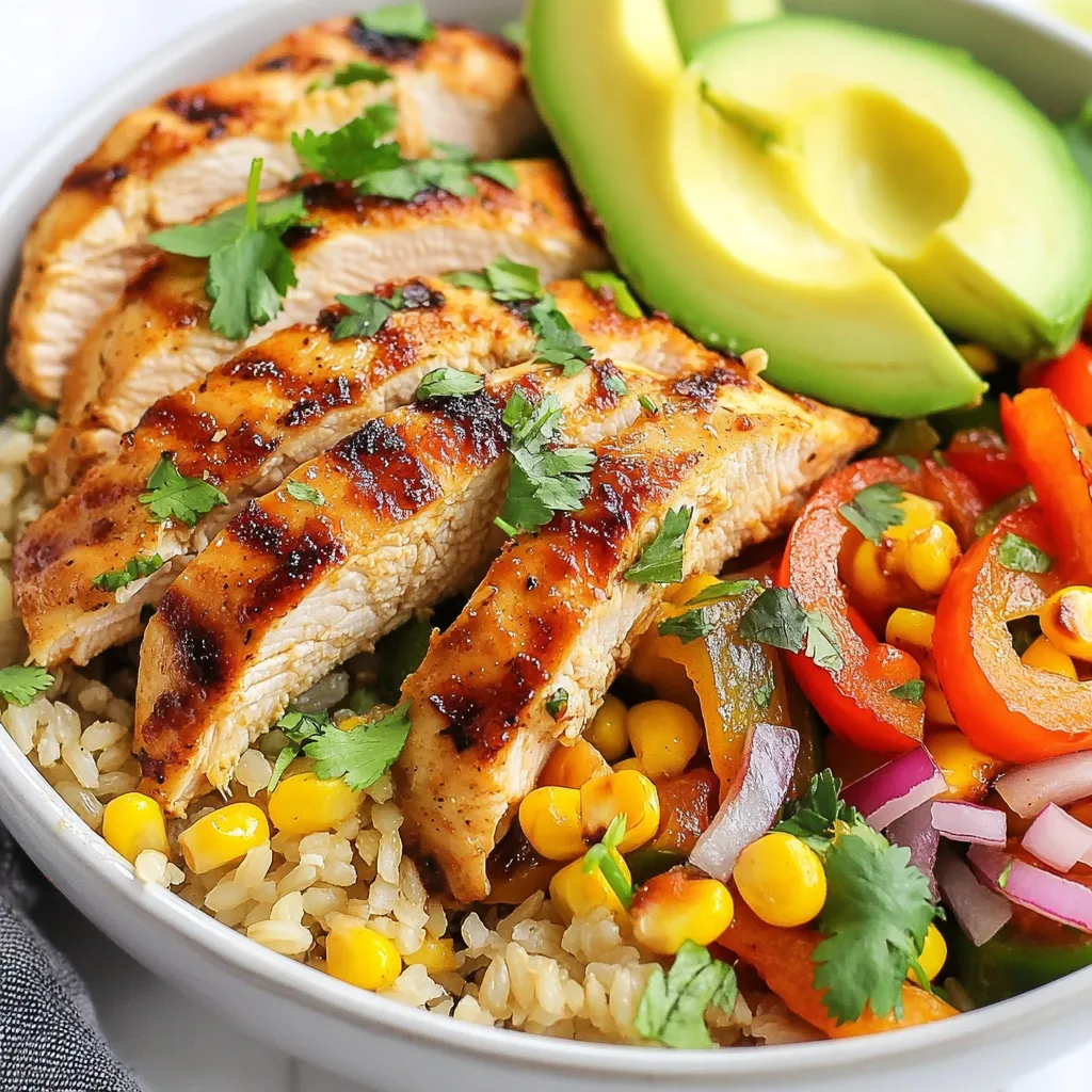 - To assemble the bowls, start with a base of cooked brown rice or quinoa. Top it with the sliced chicken, sautéed peppers and onions, corn, and avocado.