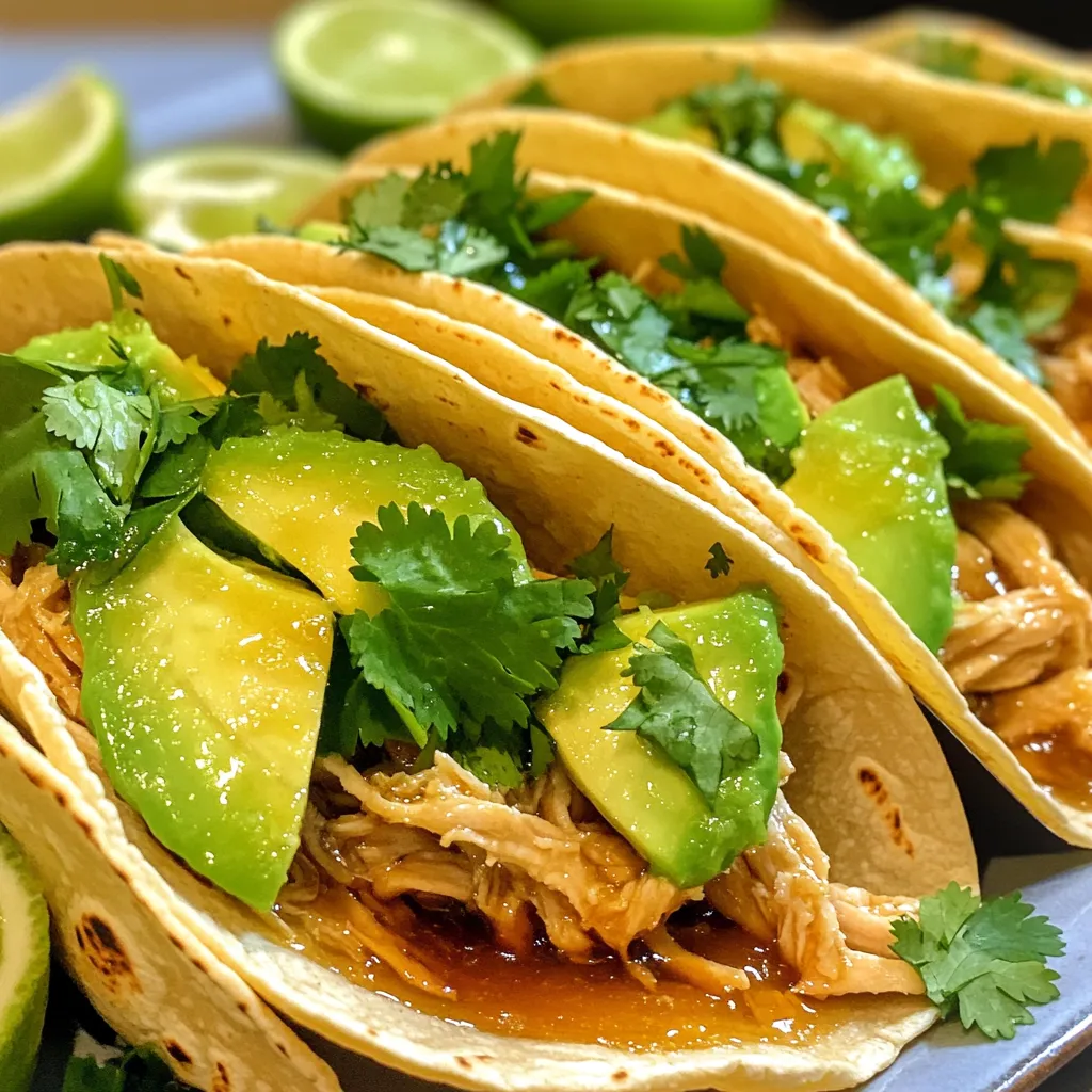 To assemble the tacos, take a warm tortilla and add a generous amount of the honey lime shredded chicken. Top it with fresh chopped cilantro and avocado slices if you like. Squeeze some lime juice on top for extra zing. Serve right away with lime wedges on the side. Enjoy your delightful meal!