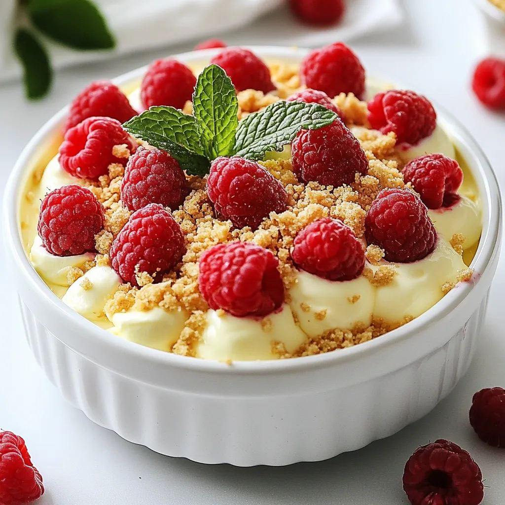 - Before serving, sprinkle the top with graham cracker crumbs and garnish with additional raspberries and fresh mint leaves.