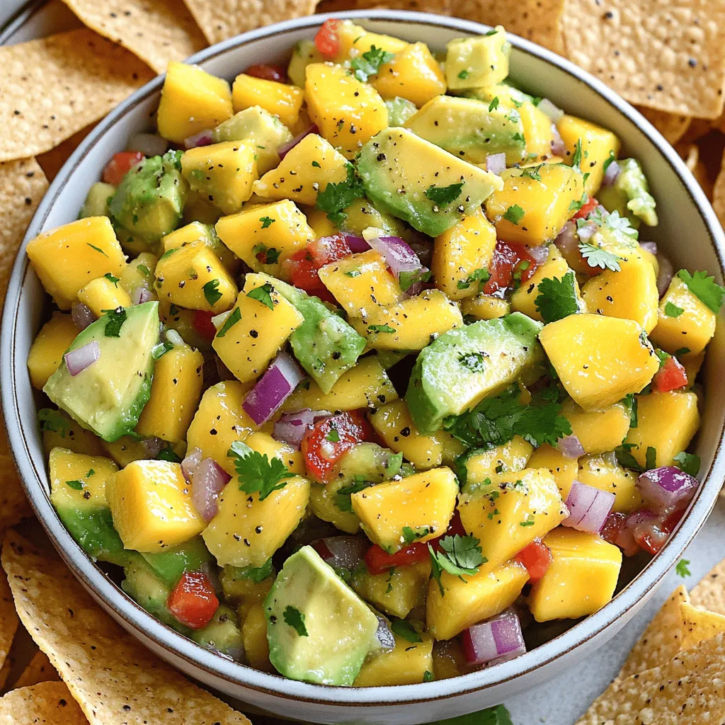 To make this fresh and tasty dip, you will need: - 1 large ripe mango, diced - 2 ripe avocados, diced - 1 small red onion, finely chopped - 1 red bell pepper, finely chopped - 1 jalapeΓ±o pepper, deseeded and minced - 1/4 cup fresh cilantro, chopped - Juice of 2 limes - Salt and pepper to taste - 1 tablespoon olive oil These ingredients blend together for a colorful and vibrant salsa. The mango gives a sweet touch, while the jalapeΓ±o adds a bit of kick. If you can’t find one of the key ingredients, here are some swaps: - Mango: Use peach or pineapple for a different fruit flavor. - Avocado: Try using diced cucumber for a lighter option. - Red onion: Yellow onion or green onion works well, too. - JalapeΓ±o: Use a bell pepper for no heat or a serrano for more spice. - Cilantro: If you dislike cilantro, parsley is a good substitute. These substitutions keep the salsa fresh while allowing you to adapt to what you have. When picking mangoes, look for fruit that gives slightly when pressed. They should smell sweet and fragrant. Choose avocados that are dark green and yield to gentle pressure. Avoid ones with dark spots or wrinkles. For the best flavor, use ripe fruit in your salsa. Always taste your fruits first; they set the tone for the whole dish. If you want the full recipe, check out the Mango Avocado Salsa Delight πŸ₯­πŸ₯‘. To make mango avocado salsa, start with fresh ingredients. Begin by dicing one large ripe mango. Make sure it is sweet and juicy. Next, take two ripe avocados and dice them. Use a sharp knife to slice carefully. In a large mixing bowl, combine the diced mango and avocado. Then, finely chop one small red onion and add it to the bowl. For a touch of color, finely chop one red bell pepper. Next, take one jalapeΓ±o pepper. Remove the seeds and mince it. Add this to the mix, adjusting for your spice level. Now, chop a quarter cup of fresh cilantro. Toss it in for a burst of flavor. Squeeze the juice from two limes over the mixture. This adds brightness and balances the sweetness. Drizzle in one tablespoon of olive oil. Gently toss everything together without mashing the avocados. Season with salt and pepper to taste. Let the salsa sit for about ten minutes. This helps the flavors mix well. For the full recipe, refer to the previous section. Dicing fruits and vegetables can be easy with the right method. First, always use a sharp knife. A dull knife can slip and cause accidents. Start by cutting off the ends of the fruit. This creates a flat surface for safety. When dicing mango, slice around the pit. Use your knife to score the flesh in a grid pattern. Then, scoop out the pieces with a spoon. For avocados, cut in half and remove the pit. Use a spoon to scoop out the flesh. For onions and bell peppers, slice them into strips first. Then, chop across the strips to create small pieces. Keep the pieces uniform for even mixing and cooking. To enhance the flavor of your salsa, consider adding extra ingredients. A dash of cumin can give it a warm, earthy taste. For a zesty kick, add a splash of apple cider vinegar. If you like a fresh twist, try adding diced pineapple or mango. This adds sweetness and pairs well with the avocado. For a more savory bite, consider adding diced tomatoes or corn. Experiment with fresh herbs too. Chopped mint or basil can bring unique flavors. Remember to taste as you go. Adjust the lime juice, salt, and pepper as needed. This will ensure your mango avocado salsa is just right. When you serve mango avocado salsa, presentation matters. Use a bright bowl to show off the colors. Garnish with more cilantro on top for a fresh look. Serve it with crispy tortilla chips. You can also top grilled chicken or fish for added flavor. Keep it chilled before serving for the best taste. To boost the flavor of your salsa, try adding more herbs. Fresh mint adds a nice twist. For extra crunch, mix in diced cucumber. A dash of honey can enhance the sweetness of the mango. If you love spice, add more jalapeΓ±o or even a pinch of cayenne pepper. These simple tweaks can make your salsa stand out. Avoid over-mashing the avocados. You want them to stay chunky for texture. Don’t skip the lime juice; it brightens the flavors. If you add too much salt, it can overpower the dish. Always taste as you go. Lastly, let your salsa sit for a bit. This allows the flavors to blend nicely. For the full recipe, check out the Mango Avocado Salsa Delight πŸ₯­πŸ₯‘. {{image_2}} You can add different fruits to your salsa for a twist. Pineapple and papaya work great. Both fruits bring sweetness and a tropical vibe. Try mango with diced pineapple for a fruity explosion. You could also mix in kiwi for a tangy touch. Each fruit adds unique flavors that keep your salsa fresh and exciting. Adjust the heat in your salsa for your taste. If you like it mild, skip the jalapeΓ±o. Instead, use a sweet bell pepper for a crunch. If you want more heat, add a serrano pepper. You can also try a sprinkle of cayenne pepper for an extra kick. Experimenting with heat makes the salsa more personal and fun. For a creamy twist, mash one avocado and mix it in. This gives the salsa a smooth texture. You can also add Greek yogurt or sour cream for creaminess. These additions make the salsa rich and satisfying. Use this creamy version as a dip or spread for wraps and sandwiches. Enjoy your Mango Avocado Salsa Delight! For the complete recipe, check the Full Recipe. To keep your leftover salsa fresh, put it in an airtight container. This helps keep air out and stops it from going bad. Store the container in the fridge. Leftover salsa will stay good for 2 to 3 days. Make sure to check it before using. You can freeze salsa for longer storage. Use a freezer-safe container or a plastic bag. Just leave some space for expansion. Salsa can last up to three months in the freezer. When you're ready to use it, defrost it in the fridge overnight. Look for signs of spoilage in your salsa. If you 