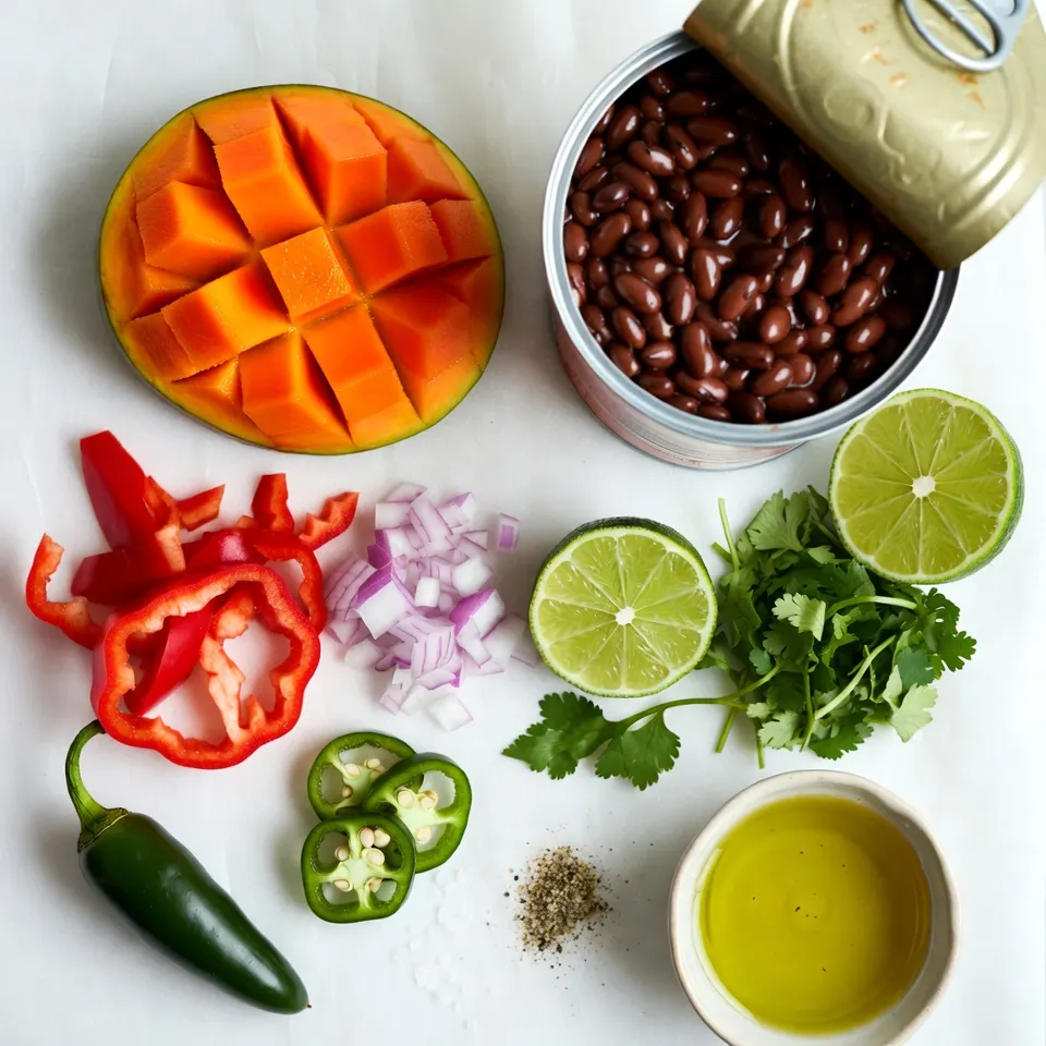 To make Mango Black Bean Salsa, start by mixing the ingredients. In a large bowl, combine the diced mango, black beans, finely chopped red bell pepper, and red onion. Don’t forget to add the minced jalapeño for some heat. This mix of ingredients gives you a colorful base.
