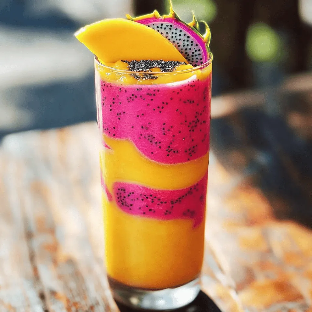 Give your smoothie a taste. If you want it sweeter, add a bit more honey or agave syrup. Blend briefly to mix it in. Now, pour your smoothie into tall glasses. For a nice look, garnish each glass with a slice of fresh mango or dragonfruit. You can also sprinkle some chia seeds on top for extra flair. Enjoy your vibrant and nutritious smoothie!