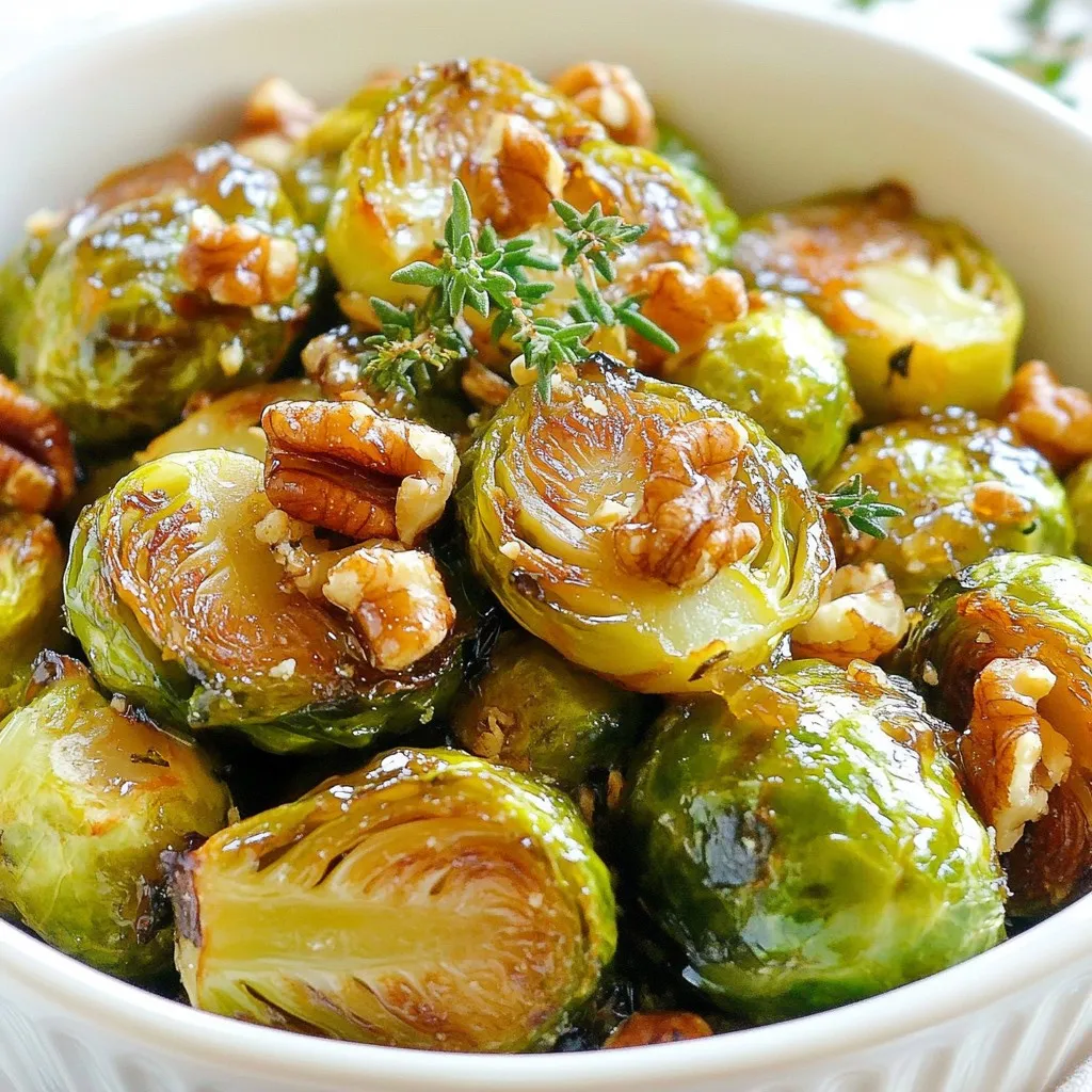A delicious side dish featuring Brussels sprouts coated in a sweet maple glaze.