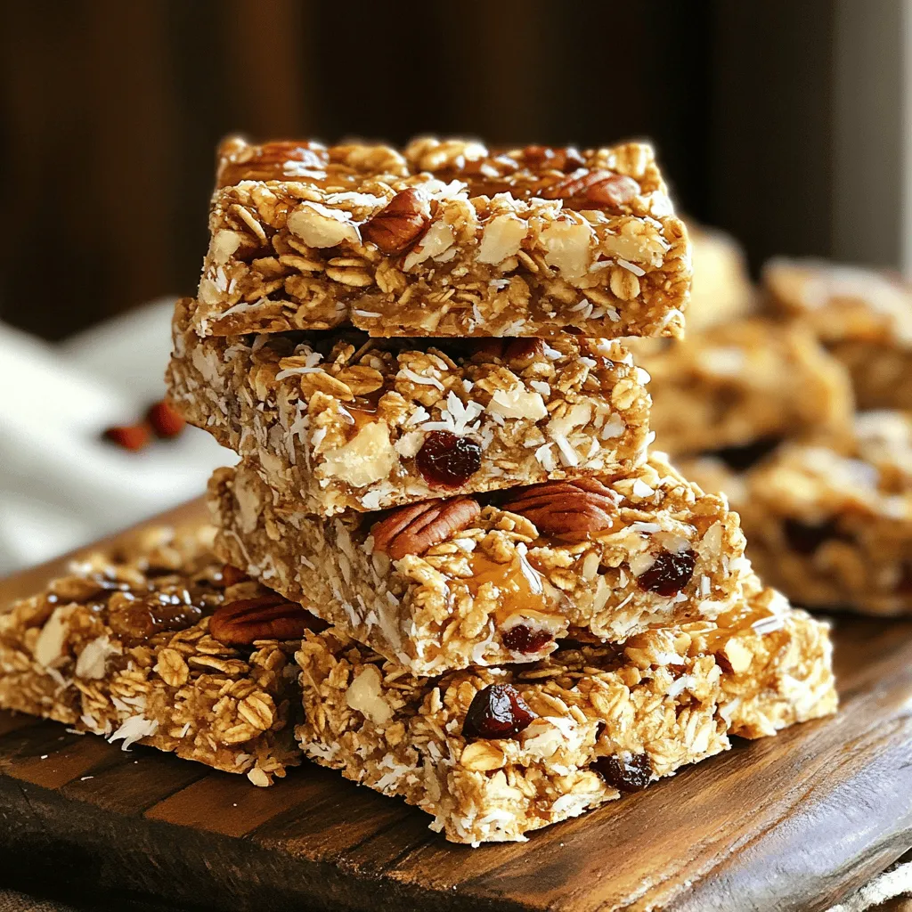 ![To make these tasty maple pecan granola bars, you need a few key items. Here’s what you’ll gather: - 2 cups rolled oats - 1 cup pecans, chopped - 1/2 cup unsweetened shredded coconut - 1/2 cup honey or maple syrup - 1/4 cup coconut oil, melted - 1/2 cup almond butter - 1/4 cup brown sugar (optional for added sweetness) - 1/2 teaspoon vanilla extract - 1/4 teaspoon salt - 1/2 cup mixed dried fruits (like cranberries or raisins) These ingredients bring together sweet flavors and crunchy textures. The oats form the base, while the pecans add a rich, nutty taste. Coconut gives a hint of tropical flavor. Honey or maple syrup binds it all together. You can customize your granola bars with fun add-ins. Here are some great options: - Chia seeds or flaxseeds for extra fiber - Dark chocolate chips for a sweet touch - Pumpkin seeds for a crunchy bite - Cinnamon or nutmeg for warm spice These add-ins not only boost taste but also improve nutrition. Feel free to mix and match based on your taste! Understanding the nutrition in your snack is key. Each bar holds important benefits. Here’s a quick look at what you get from one serving: - Calories: Approximately 200 - Protein: About 5g - Fiber: Roughly 3g - Healthy fats: Includes omega-3s from nuts and seeds - Natural sugars: From honey or maple syrup These bars offer energy and nutrients. They are a perfect choice for breakfast or a midday snack. You can feel good about enjoying them! For the complete recipe, check the [Full Recipe]. Start by getting your oven ready. Set it to 350°F (175°C). Next, grab an 8x8-inch baking pan. Line it with parchment paper. Make sure the paper hangs over the sides a bit. This helps when you take the bars out later. In a big bowl, add the rolled oats, chopped pecans, and shredded coconut. Stir these ingredients well. In another bowl, mix the honey or maple syrup, melted coconut oil, almond butter, vanilla extract, and salt. If you want it sweeter, add brown sugar. Whisk this mixture until it is smooth and well combined. Now, pour this wet mix over the dry mix. Stir until every piece is coated. Check for any dry spots. Finally, fold in the dried fruits gently. Transfer the mixture into the prepared pan. Press it down with a spatula so it is even and compact. Bake in the preheated oven for 20-25 minutes. Look for a nice golden brown color on the edges. After baking, let the pan cool for at least 15 minutes. Use the parchment paper to lift it out. Place it on a wire rack until it cools completely. Once cool, cut it into bars with a sharp knife. Check the [Full Recipe] for more details! To get the best texture, use rolled oats. They give a chewy base. Chopping pecans helps them mix well, adding crunch. For a touch of sweetness, consider adding brown sugar. This step is optional but can enhance the flavor. If you like a hint of coconut, use unsweetened shredded coconut. It adds a nice chewiness without too much sugar. One common mistake is not pressing the mixture firmly. If you do not press it down, the bars may crumble. Make sure to mix the wet and dry ingredients well. This ensures even flavor and texture. Also, avoid overbaking. Keep an eye on the edges. They should be golden brown, not dark. Dark edges mean burnt bars, which you want to avoid. To help the bars stay together, use enough binding agents. Almond butter and honey (or maple syrup) are key. They act like glue for the ingredients. Press the mixture firmly into the pan. The tighter you pack it, the better it will hold. Allow the bars to cool completely before cutting them. This step is crucial for maintaining shape. For a personal touch, drizzle a bit of maple syrup on top for extra flavor. {{image_2}} You can switch up the nuts in your bars. Use walnuts, almonds, or cashews. Each nut adds its own flavor. You can also add seeds like pumpkin or sunflower. They add crunch and nutrients. Mix and match to find your favorite blend! Adding fruit can change the taste of your bars. In summer, try dried mango or apricots. In fall, use dried apples or figs. These fruits add sweetness and make your bars special. Feel free to adjust the amount based on your taste. To make your granola bars gluten-free, choose certified gluten-free oats. This ensures no cross-contamination. You can also use nut flours instead of regular flour. Almond flour or coconut flour work well. This keeps the bars soft and tasty. For the complete recipe, check out the Full Recipe section! To keep your maple pecan granola bars fresh, store them in an airtight container. This helps keep moisture out and maintains their crispness. Place parchment paper between layers if you stack them. This prevents sticking. Keep the container in a cool, dry place. Avoid direct sunlight, as heat can make the bars soft. If you want to save some for later, freezing is a great option. Wrap each bar tightly in plastic wrap. Then, place them in a freezer-safe bag. Remove as much air as possible from the bag. When you’re ready to eat them, thaw at room temperature for a few hours. You can also microwave them for about 15 seconds if you want them warm. When stored properly, your granola bars will last about a week at room temperature. In the fridge, they can last up to two weeks. If frozen, they can stay good for up to three months. Always check for any signs of spoilage before eating. Enjoy your homemade snack, knowing it’s fresh and tasty! To make maple pecan granola bars vegan, simply replace honey with maple syrup. Use almond butter instead of any dairy-based spreads. Make sure your ingredients are free from animal products. This way, you can enjoy a tasty snack that fits your diet. Yes, you can substitute maple syrup for honey in this recipe. Maple syrup adds a rich sweetness and works well with pecans. Use the same amount, so it’s a one-to-one swap. This change also makes the bars vegan-friendly. You can find ready-made maple pecan granola bars at most grocery stores. Look in the snack or health food aisle. M