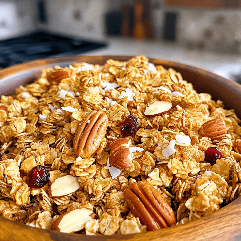 ![- 3 cups rolled oats - 1 cup pecan halves, chopped - 1/2 cup sliced almonds - 1/2 cup unsweetened shredded coconut - 1/2 cup maple syrup - 1/4 cup coconut oil, melted - 1 teaspoon vanilla extract - 1/2 teaspoon cinnamon - 1/4 teaspoon nutmeg - 1/4 teaspoon salt - 1/2 cup dried cranberries (or your choice of dried fruit) - 1/4 cup chia seeds (optional for added nutrition) The main ingredients create the heart of your granola. Rolled oats give it a chewy base. Chopped pecans add a nice crunch and flavor. Sliced almonds bring a different nutty taste. Shredded coconut adds sweetness and a tropical touch. Next, for the wet ingredients, maple syrup is vital. It sweetens your granola and gives it that rich flavor. Melted coconut oil helps everything stick together. Vanilla extract adds a warm, inviting aroma. Spices and add-ins make your granola special. Cinnamon and nutmeg bring warmth and depth. Salt balances the sweetness and enhances flavors. Dried cranberries give a pop of color and chewiness. Chia seeds are optional but boost nutrition and provide omega-3s. For the Full Recipe, refer back to the beginning. Enjoy making this nutritious snack! First, preheat your oven to 350°F (175°C). This prepares it for baking. Next, line a large baking sheet with parchment paper. This helps your granola not stick to the sheet. In a large bowl, combine: - 3 cups rolled oats - 1 cup pecan halves, chopped - 1/2 cup sliced almonds - 1/2 cup unsweetened shredded coconut - 1/2 teaspoon cinnamon - 1/4 teaspoon nutmeg - 1/4 teaspoon salt Stir these ingredients together well. This mix gives your granola flavor and crunch. In another bowl, whisk together: - 1/4 cup coconut oil, melted - 1/2 cup maple syrup - 1 teaspoon vanilla extract Pour this mixture over your dry ingredients. Mix until everything is coated. Then, spread the granola mixture evenly on the baking sheet. Bake the granola in your preheated oven for 20-25 minutes. Stir halfway through baking for even browning. It should turn golden brown. Once done, remove it and let it cool on the baking sheet. It will become crunchier as it cools. Once cooled, stir in 1/2 cup dried cranberries or your choice of dried fruit. Now, your maple pecan granola is ready! For the complete recipe, check out [Full Recipe]. To get that nice crunch, bake your granola evenly. Stir it halfway through baking. This helps it brown evenly. If you don’t stir, some parts might burn while others stay soft. After baking, let it cool completely. This cooling time is key. The granola will get crunchier as it cools. You can change how sweet your granola is by adjusting the maple syrup. If you like it sweeter, add more syrup. If you want it less sweet, use less syrup. Start with half a cup and taste it before baking. You can always add a bit more if you want. Remember, the flavor will deepen as it bakes. Store your granola in an airtight container. This keeps it fresh and crunchy. Glass jars or plastic containers work well. Make sure they are sealed tightly. Your granola can last up to two weeks when stored properly. If you want it to last longer, keep it in the fridge. Enjoy it as a quick snack, breakfast, or topping on yogurt. Check out the Full Recipe for more tips. {{image_2}} You can switch out pecans for other nuts. Walnuts, almonds, or hazelnuts work great. Each nut adds a unique taste and crunch. If you want a milder flavor, use sliced almonds. For a richer taste, walnuts can be your go-to. Hazelnuts add a fun twist with their distinct taste. Feel free to mix and match for your perfect blend! Adding spices can take your granola to the next level. Cinnamon and nutmeg are great, but you can also try cardamom or ginger. You might like to add vanilla or almond extract for a flavor boost. If you enjoy chocolate, mix in cocoa or cacao powder. This adds richness and a deep flavor. Dried fruits can really brighten up your granola. Try adding raisins, apricots, or even figs. Each dried fruit adds sweetness and texture. For fresh toppings, consider berries, bananas, or apples. Fresh fruits make it more vibrant and tasty. You can mix dried and fresh fruits for a fun combo! For the complete recipe, check the [Full Recipe]. Oats and nuts are packed with nutrients. Oats provide fiber, which helps digestion. They also contain antioxidants that can lower cholesterol. Nuts, like pecans and almonds, have healthy fats. These fats support heart health and help keep you full. Coconut adds a unique flavor and healthy fat, too. It contains medium-chain triglycerides (MCTs), which may boost energy. Chia seeds are tiny powerhouses. They are rich in omega-3 fatty acids, protein, and fiber. This helps keep you satisfied longer. You can enjoy this granola in many ways. Try it as a snack straight from the jar. You can also mix it with yogurt for a quick breakfast. Add fresh fruits for extra vitamins. Pour some milk over it for a crunchy cereal. One serving of this granola has about 200 calories. It contains around 8g of protein and 10g of healthy fats. You will also get about 30g of carbs, including fiber. This balance makes it a great snack or breakfast option. For the full recipe, check the earlier section. Homemade granola lasts about two weeks. Store it in an airtight container. Keep it in a cool, dry place. If you want it to last longer, store it in the fridge. This helps keep it fresh and crunchy. Yes, you can! Just use gluten-free oats. Many brands offer gluten-free options. Check the labels to be sure. If you want to add other grains, try quinoa flakes or puffed rice. Absolutely! You can add your favorite spices. Try nutmeg, ginger, or cardamom. You can also switch up the nuts. Walnuts or almonds work great. Dried fruits like raisins or apricots add a nice touch too. Yes, kids can help! They can mix dry ingredients. Measuring and pouring are fun tasks. Older kids can help with stirring and spreading the granola on the baking sheet. It’s a great way to bond and teach them cooking skills. There ar