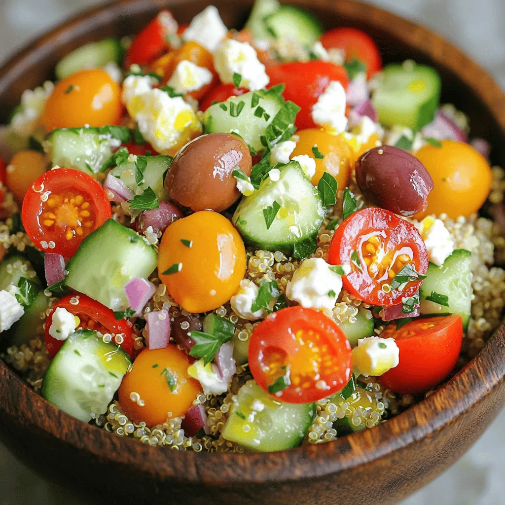 This salad is great for many events. For a picnic, serve it in a big bowl. It looks colorful and inviting. For a dinner party, place it in smaller bowls. Garnish with extra parsley for a pop of color. If you’re having a barbecue, pair it with grilled meats. The fresh flavors balance well with smoky dishes. You can also serve it as a light lunch. Just add some bread or pita on the side.Enjoy making your Mediterranean Quinoa Salad!