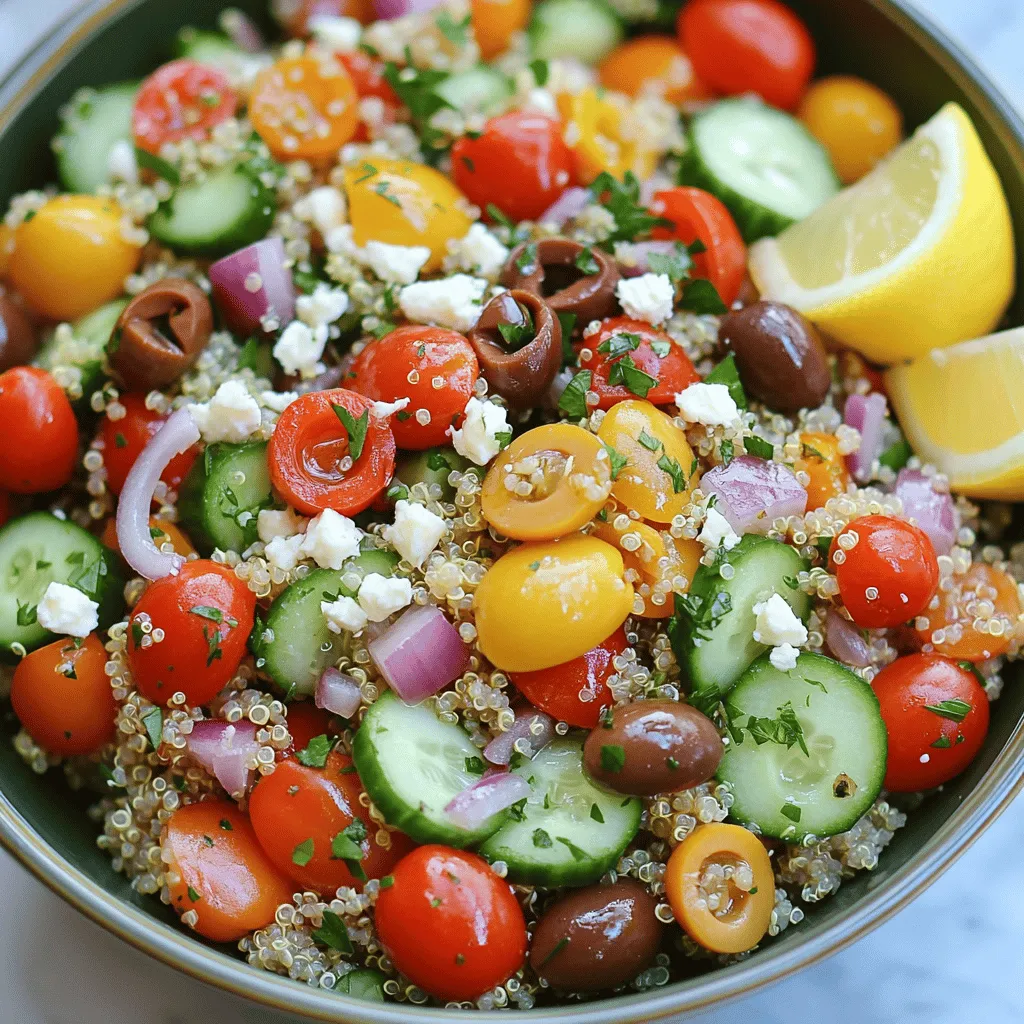 For this Mediterranean quinoa salad, you'll need a variety of fresh and tasty items. The main star is quinoa. It’s a nutty grain packed with protein. I use one cup of rinsed quinoa. You’ll also need two cups of water or vegetable broth to cook it. Other key ingredients include: - Cherry tomatoes for sweetness. - A cucumber for crunch. - Red bell pepper for color. - Red onion for a sharp bite. - Kalamata olives for saltiness. - Feta cheese for creaminess. You probably have some of these items in your kitchen. I use extra virgin olive oil and lemon juice for the dressing. Both add great flavor. You’ll also need dried oregano, salt, and pepper to season the salad. These pantry staples make creating the dressing easy and delicious. Fresh produce makes this salad bright and healthy. Chop up one cup of cherry tomatoes, a diced cucumber, and a diced red bell pepper. I also finely chop half a red onion for a nice kick. Freshness shines through with parsley. I like to add a quarter cup of chopped fresh parsley. It gives a vibrant touch and enhances the flavor. For the full recipe, you can check the details above. Enjoy making this delicious Mediterranean quinoa salad! Start by rinsing 1 cup of quinoa under cold water. This removes the bitter coating called saponin. Next, in a medium saucepan, bring 2 cups of water or vegetable broth to a boil. Add the rinsed quinoa and a pinch of salt. Lower the heat, cover the pot, and let it simmer for about 15 minutes. The quinoa will absorb the liquid and become fluffy. Once done, remove it from heat and let it cool. While the quinoa cools, grab a large mixing bowl. Add 1 cup of halved cherry tomatoes, 1 diced cucumber, and 1 diced red bell pepper. Then, toss in 1/2 finely chopped red onion, 1/2 cup of sliced kalamata olives, and 1/2 cup of crumbled feta cheese. Finally, sprinkle in 1/4 cup of chopped fresh parsley. This mix brings color and crunch to your salad, making it vibrant and fresh. In a small bowl, whisk together 1/4 cup of extra virgin olive oil, 2 tablespoons of lemon juice, 1 teaspoon of dried oregano, and salt and pepper to taste. This dressing adds a zesty flavor that brightens the salad. Taste it, and adjust the seasoning if needed. You want it to be flavorful but not overpowering. Once the quinoa has cooled, fluff it with a fork to separate the grains. Add it to the bowl with the mixed vegetables. Pour the dressing over the salad and gently mix everything together until well combined. Make sure every ingredient is coated in that tasty dressing. Cover the salad and refrigerate for at least 30 minutes. This helps the flavors meld together, making the salad even better. For the full recipe, check out the details above. Enjoy your Mediterranean Quinoa Salad! To boost the taste of your Mediterranean quinoa salad, try adding fresh herbs. Fresh mint or basil adds a nice twist. You can also include a pinch of red pepper flakes for a bit of heat. Don't forget to adjust the lemon juice to your liking. A bit more can brighten the dish. Cooking quinoa is simple, but there are a few key tips. Always rinse your quinoa before cooking. This removes the bitter coating called saponin. Use a ratio of 1 cup quinoa to 2 cups water or broth. Bring it to a boil, then lower the heat and cover. Let it simmer for about 15 minutes. Once it's done, let it sit covered for another 5 minutes. This makes the quinoa fluffy and light. Serve your salad chilled or at room temperature. For a pretty presentation, use a large bowl or individual plates. Garnish with extra parsley and a lemon wedge. This adds color and a fresh touch. You can also pair it with grilled chicken or fish for a complete meal. For a fun twist, serve it in lettuce cups for a crunchy bite. Check out the Full Recipe for more ideas! {{image_2}} You can change ingredients in your Mediterranean quinoa salad. For example, swap out cherry tomatoes for diced bell peppers. You could also use cucumber instead of zucchini for a crunch. If you don’t like feta cheese, try goat cheese or leave it out entirely. Instead of kalamata olives, use green olives for a different taste. These swaps let you personalize the salad to fit your likes. The dressing can change the whole salad. If you want a zestier flavor, use balsamic vinegar instead of lemon juice. You could try adding some Dijon mustard for a creamy texture. For a spicy kick, mix in a pinch of red pepper flakes. You can even make a yogurt-based dressing for a creamy touch. These options keep your salad fresh and exciting. Adding protein makes this salad more filling. You can include grilled chicken or shrimp. If you want a vegetarian option, try chickpeas or black beans. Tofu is another great choice for a plant-based boost. These proteins pair well with the fresh veggies and enhance the flavors of the dish. Check out the Full Recipe for more ideas on how to make this salad your own! After making your Mediterranean quinoa salad, let it cool completely. Once it's cool, transfer it to an airtight container. Store it in the fridge for up to 3 days. The flavors get better as it sits. Just make sure to stir it before serving. You can freeze this salad, but it may change texture. To freeze, place it in a freezer-safe container. It will last for about 1 month. When you’re ready to eat, thaw it overnight in the fridge. The veggies might be softer, but the taste remains good. If you want to warm it up, do so gently. Use the microwave on low heat. Stir every 30 seconds to heat evenly. You can also serve it cold, which many people enjoy. For a fresh touch, add a squeeze of lemon before serving. If you want to know how to make this salad, check out the Full Recipe. Quinoa is a small grain that comes from South America. It is a complete protein, meaning it has all nine essential amino acids. This makes quinoa great for muscle health. It is also high in fiber, which helps digestion. Quinoa is rich in vitamins and minerals, including magnesium, iron, and B vitamins. Eating 