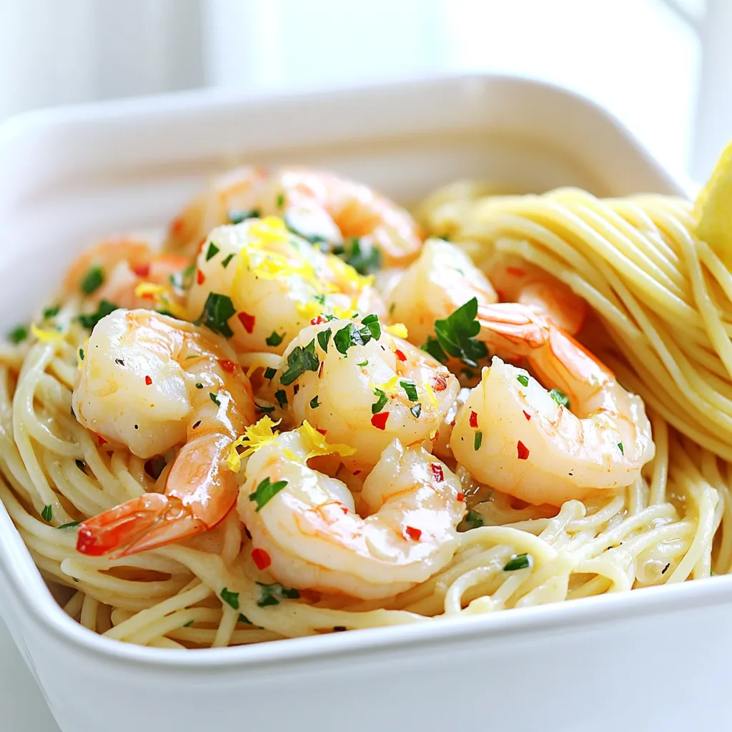 To make Minute Garlic Shrimp Scampi, gather these simple ingredients: - 1 pound large shrimp, peeled and deveined - 4 tablespoons unsalted butter - 4 cloves garlic, minced - 1 tablespoon olive oil - 1 teaspoon red pepper flakes (adjust to taste) - 1 lemon, zested and juiced - ¼ cup fresh parsley, chopped - Salt and pepper to taste - 8 ounces spaghetti or linguine (optional, for serving) You can swap some fresh ingredients if needed. For shrimp, frozen shrimp works great. Just thaw it first. If you lack fresh garlic, use garlic powder. About 1 teaspoon is enough. No fresh parsley? You can use dried parsley, but use less—about 1 tablespoon. For lemon, bottled lemon juice is fine, but fresh juice tastes best. If you want less spice, skip the red pepper flakes or use a dash of paprika instead. Here are some tools to help you make the dish: - A large skillet for sautéing - A pot for boiling pasta (if using) - A sharp knife and cutting board for chopping - A spatula for mixing - Measuring cups and spoons for accuracy These tools will make your cooking smooth and easy. Enjoy the process as you create this tasty dish! First, gather your shrimp and pasta. If you choose to use pasta, cook it according to the package. Make sure to reserve ½ cup of the pasta water before draining. This helps create a nice sauce later. While the pasta cooks, peel and devein the shrimp if needed. Rinse them under cold water and pat them dry. This step helps the shrimp cook evenly. In a large skillet, heat the olive oil and 2 tablespoons of butter over medium heat. Once the butter melts, add the minced garlic and red pepper flakes. Sauté for 1-2 minutes until the garlic smells good. Be careful not to burn it, as burnt garlic tastes bitter. Next, toss in the shrimp, and season with salt and pepper. Cook the shrimp for about 2-3 minutes on each side. They should turn pink and opaque when done. Now, lower the heat and squeeze in the lemon juice and zest. Add the remaining butter and chopped parsley. Stir everything together until the butter melts and blends with the shrimp. If you cooked pasta, add it to the skillet. Use the reserved pasta water to create a light sauce. Toss until everything is mixed well. Taste it and adjust seasoning if needed. Serve the dish hot, and enjoy your lovely Garlic Shrimp Scampi! When picking shrimp, look for ones that are pink and firm. They should have a clean smell, not fishy. Fresh shrimp have a slight sheen and should feel cold to the touch. Buying shrimp that are frozen is also a great option. Just make sure they are properly thawed before cooking. To cook garlic just right, always start with medium heat. Add the minced garlic to the hot butter and oil mix. Sauté it for 1-2 minutes until it smells great. Watch closely! Burnt garlic turns bitter fast. If you’re unsure, take it off the heat early. You can always return it for a moment longer. If you like spice, add more red pepper flakes. Start with a small amount and taste. You can always add more for a kick! Other great ways to enhance flavor are adding lemon zest or fresh herbs. Try fresh basil or chives to switch it up. Experiment with these options to find your perfect balance. {{image_2}} To make a creamy garlic shrimp scampi, add heavy cream. Start by adding ½ cup of cream to the pan after you add the lemon juice and zest. This will create a rich sauce. Stir well to blend it in. This adds a nice, smooth texture and taste to the dish, making it even more satisfying. You can boost nutrition by adding vegetables. Some great choices include spinach, cherry tomatoes, or bell peppers. Add these to the skillet when you cook the garlic. They will soften but still keep their color. This also adds a pop of color to your dish, making it more appealing. For a gluten-free option, skip the pasta. Instead, serve the shrimp over zucchini noodles or cauliflower rice. Both options are low in carbs and full of flavor. If you want to keep it low-carb, just focus on the shrimp and sauce. You will still enjoy a tasty meal without the extra carbs. To keep your garlic shrimp scampi fresh, store leftovers in an airtight container. This helps to lock in flavor and moisture. Place the container in the fridge. Make sure to consume the shrimp within two days for the best taste. When reheating, avoid the microwave if you can. Use a skillet over low heat instead. This method warms the shrimp gently, keeping them tender. Add a splash of lemon juice or a bit of butter to keep the flavor bright. Stir often to avoid sticking. If you want to freeze your shrimp scampi, it’s best to do it before adding pasta. Place the shrimp and sauce in a freezer-safe bag. Remove as much air as possible before sealing. When ready to eat, thaw in the fridge overnight. Heat gently in a skillet to enjoy. Shrimp cook quickly. In total, it takes about 5 to 6 minutes. When you heat shrimp in a hot skillet, they turn pink and opaque. This shows they are done. If you overcook them, they can get tough. So, keep an eye on them as they cook. Yes, you can! Garlic Shrimp Scampi tastes great on its own. If you skip the pasta, serve it with rice or on a bed of veggies. You can even add it to salads for a fresh twist. The flavors of garlic, lemon, and shrimp shine through. There are many options to enjoy with Garlic Shrimp Scampi. Here are a few ideas: - Garlic bread to soak up the sauce - A light salad with mixed greens - Steamed broccoli or asparagus for a healthy side - Rice or quinoa for a hearty meal These sides pair well and make your meal complete. Choose what you like best! This blog post covered the ingredients, steps, tips, variations, and storage for perfect Garlic Shrimp Scampi. You learned how to choose shrimp and cook garlic just right. Adapting the recipe lets you try new flavors and suit any diet. Remember to store leftovers well for great taste later. With this knowledge, you can enjoy a delicious meal anytime. Keep cooking and have fun in the kitchen!