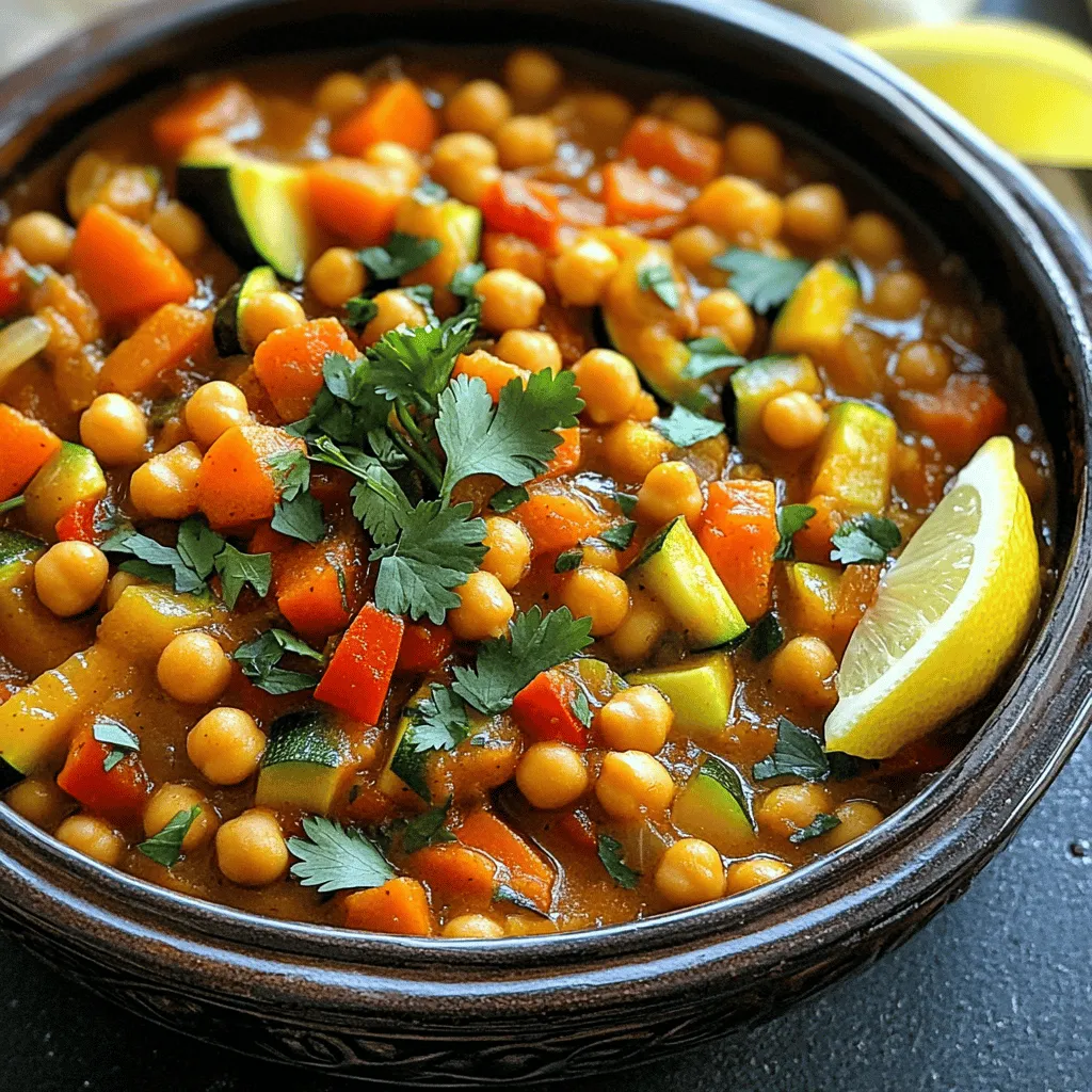 ![To make a delicious Moroccan Chickpea Tagine, gather these fresh ingredients: - 2 tablespoons olive oil - 1 large onion, finely chopped - 3 cloves garlic, minced - 1-inch piece of ginger, grated - 1 teaspoon ground cumin - 1 teaspoon ground coriander - 1 teaspoon ground cinnamon - 1 teaspoon smoked paprika - 1 can (15 oz) chickpeas, drained and rinsed - 1 large carrot, diced - 1 red bell pepper, chopped - 1 zucchini, chopped - 1 can (14 oz) diced tomatoes - 1 cup vegetable broth - 1/2 cup dried apricots, chopped - Salt and pepper to taste - Fresh cilantro or parsley for garnish - Lemon wedges for serving Each ingredient plays a key role. Olive oil adds richness. The onion, garlic, and ginger create a fragrant base. Spices like cumin and coriander give warmth. Chickpeas provide protein and texture. Carrots and bell peppers bring color and crunch, while zucchini adds moisture. Diced tomatoes and vegetable broth create a savory sauce. Dried apricots add sweetness to balance the spices. Don't forget to season with salt and pepper. Fresh herbs, like cilantro or parsley, add a burst of flavor. Lemon wedges brighten each bite. For the full recipe, check out the [Full Recipe]. With these ingredients, you'll craft a hearty and flavorful tagine that warms the soul. To start, I heat olive oil in a large tagine or Dutch oven over medium heat. I add the finely chopped onion. Sauté it until it becomes soft and translucent, about 5 minutes. Next, I stir in minced garlic and grated ginger. This mixture cooks for another minute, filling your kitchen with an amazing aroma. Then, it’s time to add the spices. I toss in ground cumin, ground coriander, ground cinnamon, and smoked paprika. I stir well to coat the onions with these spices. This step helps release their rich flavors. Now, I add the chickpeas, diced carrot, chopped red bell pepper, and zucchini. I mix all the ingredients together, ensuring even distribution. After that, I pour in the diced tomatoes and vegetable broth. I give everything a good stir and bring the mixture to a gentle simmer. Lastly, I add the chopped dried apricots. I cover the tagine or pot with a lid, reduce the heat to low, and let it simmer for about 25-30 minutes. This allows the vegetables to become tender and the flavors to meld beautifully. The order of spices is crucial for flavor. I always add spices after the onions are soft. This step brings out their best taste. I also watch the heat levels. If the tagine bubbles too much, I lower the heat. Slow cooking helps develop rich, deep flavors. For garnishing, I like to use fresh cilantro or parsley. This adds a pop of color and freshness. When I serve the tagine, I place it in the cooking vessel. This keeps it warm and looks great on the table. It's best enjoyed with warm couscous or crusty bread for dipping. A squeeze of lemon brightens the dish and enhances the flavors. For the full recipe, don’t forget to check the link provided earlier. To make your Moroccan Chickpea Tagine shine, consider adding or swapping vegetables. Try sweet potatoes or eggplant for a new twist. You can also add greens like spinach or kale for extra nutrients. Spices can take your dish to the next level. While cumin, coriander, and cinnamon are great, adding turmeric or cardamom can give it more depth. A pinch of cayenne can add a nice kick if you love heat. Choosing the right cookware is key. A tagine pot is traditional and helps blend flavors. A Dutch oven works well too, giving you the same great taste. Both options trap heat and moisture, making your meal tender. For easier prep, use a sharp knife and a sturdy cutting board. A good peeler is helpful for your vegetables. Also, have measuring spoons and cups ready for your spices. This will save you time and keep your kitchen organized. For the full recipe, refer to the earlier sections. {{image_2}} You can easily make this Moroccan Chickpea Tagine vegan and gluten-free. The ingredients are already plant-based. Just check that your vegetable broth is gluten-free. For a protein boost, try adding tofu or tempeh. Both options soak up the flavors well. Simply cube the tofu or tempeh and add it with the chickpeas. This change makes your meal more filling and satisfying. Different regions offer unique twists on this dish. For example, in some areas, people add sweet potatoes or squash. These ingredients add a nice sweetness and texture. You can also explore local spices or herbs. For instance, adding harissa gives it a spicy kick. Alternatively, use fresh mint or dill for a fresh taste. Each region’s twist makes this dish fun and exciting to make. To keep your Moroccan Chickpea Tagine fresh, store it in the fridge. Use an airtight container. This helps keep the flavors and moisture intact. You can also divide it into smaller portions. This way, it’s easy to grab a quick meal later. - Best practices for storing tagine: - Let the tagine cool to room temperature before storing. - Avoid leaving it out for more than two hours. - Container recommendations: - Use glass or BPA-free plastic containers for easy storage. - Consider using freezer bags for portion control. When it comes to reheating, your goal is to keep the flavor and texture. Use low heat on the stove or a microwave. Stir occasionally to ensure even heating. - Safely reheating for best flavor and texture: - If using a microwave, cover the container loosely. This helps steam the food. - Heat until it reaches 165°F (74°C) to ensure it’s safe to eat. - Tips for freezing portions: - Freeze the tagine in single servings for quick meals. - Lay the bags flat in the freezer. This saves space and helps them freeze faster. By following these tips, you can enjoy your Moroccan Chickpea Tagine long after cooking it. Check out the Full Recipe for more details on preparation! What is a tagine and how is it different from a stew? A tagine is a dish and also a cooking pot. It has a conical lid and is made of clay. The shape keeps steam inside. This h