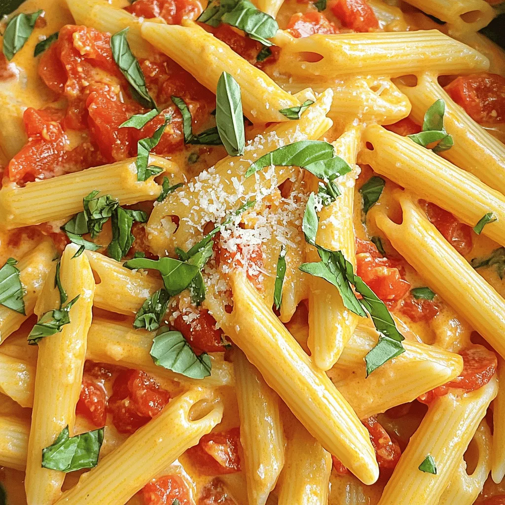 ![- 12 oz (340 g) pasta (penne or fusilli) - 2 tablespoons olive oil - 1 small onion, finely chopped - 3 garlic cloves, minced - 1 can (14 oz) crushed tomatoes - 3 cups vegetable broth - 1 cup heavy cream or coconut cream - 1 teaspoon dried oregano - 1 teaspoon sugar - Salt and pepper, to taste - 1 cup fresh basil leaves, chopped - ½ cup grated Parmesan cheese (optional) When I make One Pot Creamy Tomato Basil Pasta, I always start with the main ingredients. You need pasta, olive oil, and onion. The pasta can be penne or fusilli, whichever you like best. The olive oil adds richness, and the onion gives a nice base flavor. Next, I add the additional ingredients: garlic, crushed tomatoes, and vegetable broth. Garlic brings a lovely aroma. The crushed tomatoes add sweetness and depth, while the broth gives the dish its body. For the creamy components, I use heavy cream or coconut cream. This choice brings a smooth texture. I also add dried oregano and sugar. Oregano adds a warm, earthy note, and sugar balances the acidity of the tomatoes. Finally, don’t forget the seasoning and garnish. You need salt and pepper to taste. Fresh basil leaves give a burst of flavor. If you want, sprinkle some grated Parmesan cheese on top. This adds a salty finish to the dish. For the full recipe, check the details above. Enjoy creating this simple delight! Start by heating the olive oil in a large pot over medium heat. Once hot, add the finely chopped onion. Sauté the onion for about 3 to 4 minutes. You want it to soften and become slightly translucent. Next, add the minced garlic. Cook it for 1 minute until it gives off a nice, fragrant smell. This step builds a strong flavor base. Now, stir in the crushed tomatoes and vegetable broth. Mix in 1 teaspoon of dried oregano, 1 teaspoon of sugar, and season with salt and pepper. Bring this mixture to a gentle boil. Once boiling, add the pasta. Stir well to coat the pasta in the sauce. Cover the pot and let it cook for 10 to 12 minutes. Stir occasionally. The pasta should be al dente and most of the liquid absorbed. When the pasta is ready, reduce the heat to low. Stir in 1 cup of heavy cream or coconut cream. Mix until everything is well combined and creamy. Add the chopped basil and grated Parmesan cheese if you like. Taste the dish and adjust the seasonings as needed. Serve it hot, garnished with extra basil and cheese if desired. Enjoy your One Pot Creamy Tomato Basil Pasta! For the full recipe, check the ingredients list above. To get perfect al dente pasta, keep these tips in mind: - Use plenty of water and salt when boiling. - Stir the pasta often while it cooks. - Check the pasta a minute or two before the package time ends. If you find too much liquid left, don’t fret! Here’s how to fix it: - Turn up the heat to help it evaporate. - If needed, add a splash of cream to thicken it. To enhance the flavors in your dish, try these ideas: - Add a pinch of red pepper flakes for heat. - Use fresh herbs like thyme or parsley as options. - Consider adding a squeeze of lemon for brightness. When it comes to basil, choose wisely: - Sweet basil is a classic choice. - Thai basil gives an exciting twist to the flavor. Pair your creamy tomato basil pasta with these sides: - A light green salad with lemon dressing. - Garlic bread for a tasty crunch. For garnishes, consider these ideas to elevate your dish: - Extra basil leaves add color and flavor. - Grated cheese gives a nice touch and richness. For the full recipe, see [Full Recipe]. {{image_2}} You can make this dish dairy-free by using coconut cream instead of heavy cream. Coconut cream adds a rich, creamy texture without dairy. The taste will have a slight coconut hint, which pairs well with tomatoes and basil. You can also use vegan cheese alternatives, like nutritional yeast or cashew cheese. These options give a cheesy flavor without the dairy. Adding protein can make this meal more filling. Chicken, shrimp, or chickpeas work great. For chicken or shrimp, cook them first in the pot, then set aside. Add them back in when you mix in the cream. This keeps the flavor rich and balanced. For chickpeas, simply rinse and add them in with the pasta. This way, they soak up the sauce's flavors without changing the dish. You can easily add more veggies to this recipe. Spinach or bell peppers are excellent choices. Chop them small so they mix well with the pasta. Add spinach in the last few minutes of cooking. It wilts down nicely and adds color. For bell peppers, add them at the start with the onions. This way, they cook until tender and sweet. More veggies make the dish healthier and more colorful. To store leftovers, place One Pot Creamy Tomato Basil Pasta in an airtight container. Make sure it cools down first. This helps keep it fresh. You can keep it in the fridge for up to three days. After that, it may lose flavor and quality. When reheating, the best method is to use the stove. Heat it in a pot over low heat. Stir often to avoid sticking. If it looks dry, add a splash of vegetable broth or cream. This keeps the pasta moist and tasty. You can also use a microwave. Heat it in short bursts, stirring in between. To freeze One Pot Creamy Tomato Basil Pasta, let it cool fully. Then, place it in freezer-safe bags or containers. Remove as much air as possible. It can last up to three months in the freezer. When you're ready to eat, thaw it overnight in the fridge. Reheat it on the stove, adding a bit of liquid to keep it creamy. Enjoy your easy meal again! For more details, check the Full Recipe. To make this pasta, you need a few steps. Start by heating olive oil in a pot. Sauté chopped onion for about 3-4 minutes until soft. Then, add minced garlic and cook for 1 more minute. Next, stir in crushed tomatoes and vegetable broth. Bring this to a gentle boil. Add your pasta to the pot and stir well. Cover and cook for about 10-12 minutes. Stir occasionally until the pasta is al dente. Then reduce the heat and add heavy
