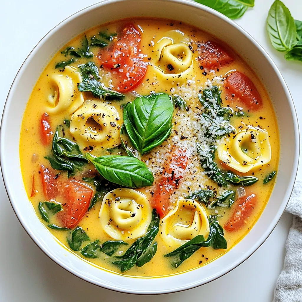To make One-Pot Creamy Tomato Spinach Tortellini Soup, gather these simple ingredients: - 2 tablespoons olive oil - 1 medium onion, diced - 2 cloves garlic, minced - 1 can (14 oz) diced tomatoes - 4 cups vegetable broth - 1 teaspoon dried basil - 1 teaspoon dried oregano - 1/2 teaspoon red pepper flakes (optional) - 9 oz fresh or frozen cheese tortellini - 2 cups fresh spinach, roughly chopped - 1 cup heavy cream or coconut milk (for a dairy-free option) - Salt and pepper to taste - Grated Parmesan cheese (for serving, optional) - Fresh basil leaves for garnish (optional) Each ingredient plays a role in creating a rich, creamy soup. The olive oil gives flavor and helps cook the onion and garlic. The onion adds a sweet note, while the garlic brings depth. The diced tomatoes add acidity and texture. Vegetable broth serves as a base, making the soup hearty. Herbs like basil and oregano infuse warmth. Red pepper flakes can add a little heat if you like a kick. Cheese tortellini brings a delightful chewiness. Spinach adds color and nutrients. Heavy cream or coconut milk gives that creamy texture we love. Lastly, salt and pepper enhance all the flavors. Feel free to customize your soup with optional garnishes. Parmesan cheese and fresh basil make great toppings, adding flavor and a fresh touch. Enjoy gathering these ingredients for a delicious meal! 1. Sauté onion and garlic Start by heating the olive oil in a large pot over medium heat. Add the diced onion. Sauté it for about 5 minutes. Wait until it turns translucent. Then, add the minced garlic. Cook it for 1 more minute. You will smell a nice aroma! 2. Add tomatoes and broth Next, stir in the can of diced tomatoes along with their juices. Then pour in the vegetable broth. Add the dried basil, dried oregano, and red pepper flakes if you want some heat. Bring this mix to a boil. 3. Incorporate tortellini and cook Once it boils, lower the heat to a simmer. Add the cheese tortellini. Cook according to the package instructions. This usually takes about 3 to 5 minutes. Keep an eye on them until they are tender. 4. Stir in spinach and cream Now, add the chopped spinach and the heavy cream or coconut milk. Cook for another 2 to 3 minutes. You want the spinach to wilt and the soup to warm through. - Adjust seasoning for taste Always taste your soup before serving. Add salt and pepper as needed. This step is key to making your soup flavorful. - Monitor cooking times for tortellini Do not overcook the tortellini. Check them a minute before the time is up. They should be soft but not mushy. To make this soup shine, use fresh ingredients. Fresh herbs and veggies give great taste. If you like spice, add red pepper flakes. Just a pinch adds warmth without being too hot. You can adjust it to your taste. Pair your soup with crusty bread or a fresh salad. Bread soaks up the creamy broth, while salad adds a crunchy texture. For a lovely touch, serve the soup in a nice bowl. Top with grated Parmesan and fresh basil leaves. This makes the dish look as good as it tastes! {{image_2}} You can easily change this soup to fit your needs. If you want a dairy-free option, swap heavy cream for coconut milk. It adds a rich, creamy texture without any dairy. This keeps the soup smooth and flavorful. For those who need gluten-free meals, look for gluten-free tortellini. Many brands offer great options. Just make sure to check the labels. With these swaps, anyone can enjoy this delicious soup. Want to make your soup even better? You can add other vegetables. Carrots and bell peppers work great. Just chop them up and toss them in with the onions. They add color and taste. You can also boost the protein in your soup. Cooked chicken or beans add a nice touch. If you use beans, try chickpeas or white beans. They mix well with the tomato and spinach flavors. These changes keep your soup exciting and nutritious. To keep your One-Pot Creamy Tomato Spinach Tortellini Soup fresh, use a few simple steps. First, let the soup cool to room temperature. Then, transfer it to an airtight container. Store it in the fridge for up to three days. If you want to keep it longer, freeze it. Pour the soup into freezer-safe containers, leaving some space at the top. This allows for expansion as it freezes. You can freeze it for up to three months. When it’s time to enjoy your soup again, reheating properly is key. The best method is to use a pot on the stove. Pour the soup into the pot and heat over medium heat. Stir it often to keep it smooth. If you notice it’s too thick, add a splash of broth or water. You can also use the microwave if you prefer. Just place the soup in a microwave-safe bowl. Heat it in short bursts, stirring in between, until it’s hot. Avoid boiling it, as that can change the texture. Can I use frozen tortellini? Yes, you can use frozen tortellini. Just add it to the pot directly. It cooks fast and will thaw in the soup. Follow the package instructions for timing. This makes cooking easy and quick. How can I make this soup vegetarian? To make this soup vegetarian, use vegetable broth instead of chicken broth. All other ingredients are already plant-based. This keeps the flavors rich while staying meat-free. You can also add more veggies for added nutrition. What can I substitute for heavy cream? For a lighter option, use coconut milk. It gives a creamy texture without dairy. Almond milk or cashew cream are great choices too. Just pick what you like best. This soup has about 300 calories per serving. It contains 15 grams of fat and 10 grams of protein. - Calories: 300 - Fat: 15g - Protein: 10g The ingredients provide many health benefits. Spinach is rich in iron and vitamins. Tomatoes add antioxidants, which are great for your skin. Tortellini gives you energy with carbs. Overall, this soup is tasty and healthy! This blog post covered a delicious tortellini soup recipe. We looked at key ingredients, step-by-step prep, and cooking tips. You learned how to customize the s