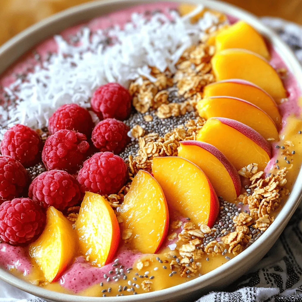 Once blended, pour the smoothie into a bowl. You can make it look nice by adding toppings. Use sliced fresh peaches, fresh raspberries, granola, chia seeds, and shredded coconut. Arrange them in a fun way to make it pretty. Enjoy your Peach Melba smoothie bowl right away for the best taste!