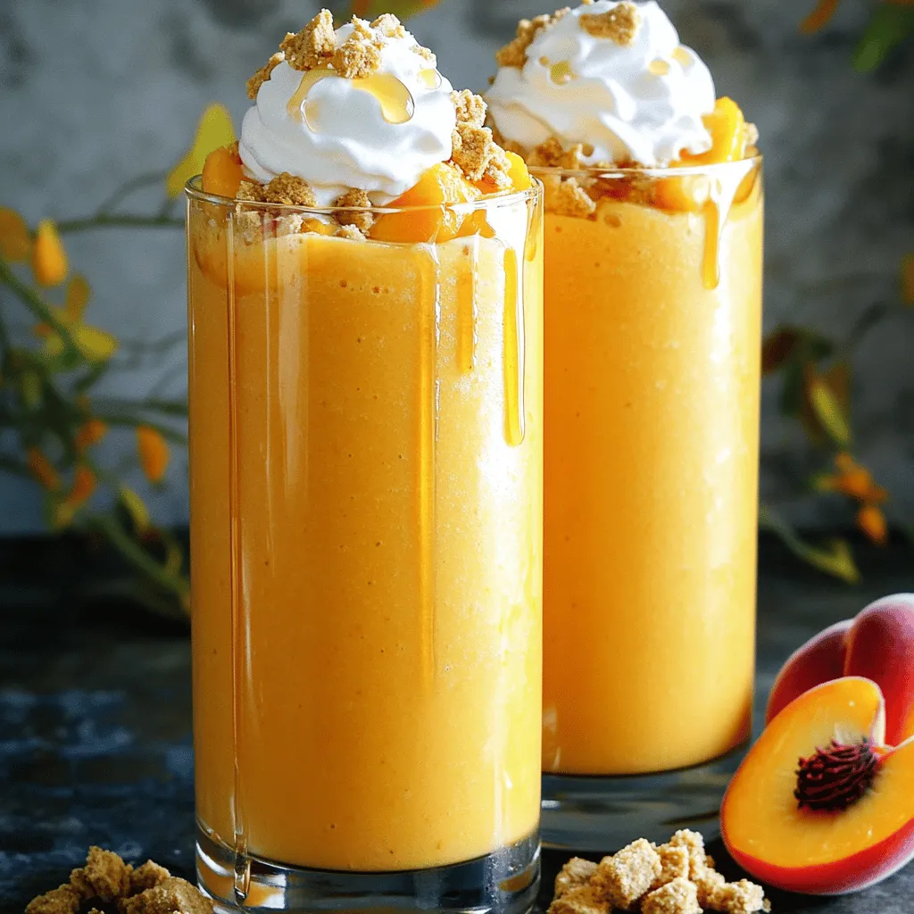 ![- 2 ripe peaches - 1 banana (frozen) - 1 cup Greek yogurt (preferably vanilla) To make a Peach Pie Smoothie, you need fresh ingredients. Start with two ripe peaches. They should smell sweet and feel slightly soft. Next, grab a frozen banana. It adds creaminess and a nice chill. Finally, include one cup of Greek yogurt. I like using vanilla-flavored yogurt for extra sweetness. - Honey or maple syrup - Cinnamon and nutmeg - Rolled oats You can enhance your smoothie with a few optional ingredients. Honey or maple syrup gives it a sweet touch. A pinch of cinnamon and nutmeg adds warmth and spice. If you want more texture, consider adding rolled oats. They help make the smoothie filling and hearty. - Whipped cream - Crushed graham crackers When serving, consider some fun toppings. A dollop of whipped cream makes it feel like dessert. Crushed graham crackers can mimic that pie crust flavor. They add a nice crunch that pairs well with the smoothness of the drink. For the complete recipe, check the [Full Recipe]. 1. Start by washing the peaches under cold water. 2. Cut the peaches in half, remove the pit, and chop them into small pieces. 3. Grab a frozen banana from your freezer. If you don't have one, peel and slice a banana, then freeze it for later use. 1. In a blender, combine the chopped peaches, frozen banana, Greek yogurt, and almond milk. 2. Add in honey, cinnamon, nutmeg, rolled oats, and vanilla extract. 3. Blend on high speed until the mix is smooth. Check for any chunks. 4. If the smoothie is too thick, slowly add more almond milk until you reach your desired thickness. 1. Taste your smoothie. If it needs more sweetness, add a little more honey. Blend briefly. 2. Pour the smoothie into tall glasses. 3. For a fun touch, top each glass with whipped cream and a sprinkle of crushed graham crackers for that pie flavor. 4. Enjoy your tasty peach pie smoothie right away! For the full recipe, see the details above. Best types of peaches Use ripe, juicy peaches for the best flavor. Look for peaches that smell sweet and have a slight give when pressed. Freestone peaches are easier to prepare since the pit comes out easily. Using Greek yogurt vs. regular yogurt I recommend Greek yogurt for this smoothie. It adds creaminess and protein. Regular yogurt is fine too, but it may make the smoothie thinner. Choose vanilla-flavored Greek yogurt for added sweetness. How to adjust thickness If your smoothie is too thick, add more almond milk. Start with a little and blend. You want a nice, drinkable consistency. If you like it thicker, add more oats or yogurt. Tips for creaminess Frozen banana is key for a creamy texture. It blends well and adds natural sweetness. If you want extra creaminess, try adding a touch of avocado or a dollop of nut butter. Ideal glassware Serve your peach pie smoothie in tall glasses. This makes it look appealing and fun to drink. A mason jar works well too for a rustic touch. Pairing with snacks This smoothie pairs well with light snacks. Try it with whole-grain toast or a handful of nuts. You could also enjoy it with a simple fruit salad for a refreshing meal. For the full recipe, check out the Peach Pie Smoothie details above. {{image_2}} You can switch up the fruit in your peach pie smoothie. Try using ripe mangoes or sweet strawberries. These fruits can add new flavors and keep things exciting. You can also mix in berries like blueberries or raspberries. They pair well with peach and add a nice color. Just make sure the fruits are ripe for the best taste. If you want a dairy-free smoothie, you can swap Greek yogurt for plant-based yogurt. Look for options made from almond or coconut. They give a nice creaminess. For milk, you can use oat milk or soy milk instead of regular milk. These alternatives work great and keep the smoothie tasty. You can change how sweet your smoothie is. Use natural sweeteners like agave syrup or stevia instead of sugar. These options are often healthier and still sweet. You can also add spices like ginger or cardamom for more flavor. They can make your smoothie taste more complex and delicious. You can find the Full Recipe to make this tasty peach pie smoothie in the previous sections. To keep your Peach Pie Smoothie fresh, store leftovers in a sealed jar. This helps lock in the flavor. You can also pour the smoothie into an ice cube tray and freeze it for later. This is a smart way to enjoy a quick treat. When you want to enjoy your frozen smoothie, just take it out of the freezer. Let it sit in the fridge for a few hours to thaw. If it separates, just shake or stir it well before drinking. This will mix the ingredients back together. Peaches last about three to five days in the fridge. Bananas can spoil faster, so check them often. Signs your smoothie has gone bad include a sour smell or a change in color. If you notice these signs, it’s best to toss it out. The prep time for a Peach Pie Smoothie is about 10 minutes. This includes washing, chopping, and blending your ingredients. You can whip it up quickly, making it perfect for busy mornings or a refreshing snack. Yes, you can prepare this smoothie in advance. To do this, blend all the ingredients and store it in an airtight container. Keep it in the fridge for up to 24 hours. Just give it a quick stir before you drink. If you want to store it longer, pour the smoothie into ice cube trays and freeze. Then, blend the cubes with a bit of almond milk when you are ready to enjoy. To make the Peach Pie Smoothie vegan, swap Greek yogurt for plant-based yogurt. You can use almond, coconut, or soy yogurt. Also, replace honey with maple syrup or agave nectar for sweetness. These simple swaps keep all the flavor while making it dairy-free. This blog post showed you how to make a delicious Peach Pie Smoothie. You learned about the fresh ingredients and optional enhancements to boost flavor. I shared steps for blending and tips for the best texture. You can even explore tasty variations and storage tip