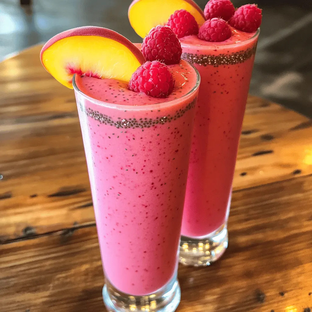 Once blended, taste your smoothie. If you think it needs more sweetness, add a bit of honey or syrup. Blend again briefly to mix it in. Pour your smoothie into tall glasses. For a nice touch, garnish with whole raspberries and a peach slice on the rim. You can also sprinkle some chia seeds on top for extra flair. Enjoy this Peach Raspberry Chia Smoothie, perfect for a refreshing treat!