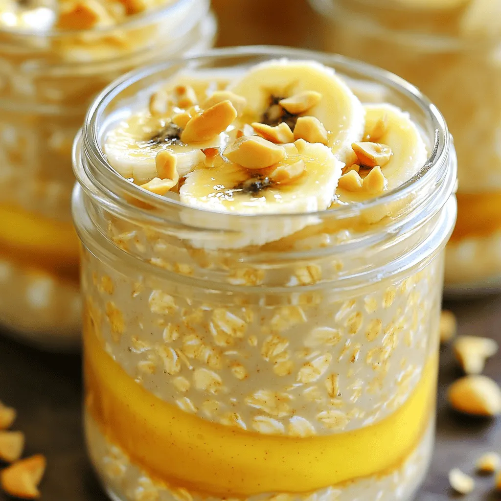 ![- 1 cup rolled oats - 1 cup almond milk (or your choice of milk) - 1 ripe banana, mashed - 2 tablespoons natural peanut butter - 1 tablespoon honey or maple syrup (optional for sweetness) - 1/2 teaspoon vanilla extract - 1/4 teaspoon cinnamon - A pinch of salt - Sliced banana and chopped peanuts for topping The main ingredients for peanut butter banana overnight oats are simple. I love using rolled oats because they absorb liquid well. Almond milk creates a creamy texture, but any milk works. A ripe banana adds natural sweetness and flavor. Natural peanut butter is my go-to for richness. Honey or maple syrup can sweeten it up if you like. Vanilla extract adds warmth, while cinnamon gives a nice spice. Finally, a pinch of salt brightens all the flavors. - Alternatives for almond milk: You can use oat milk, soy milk, or regular cow's milk. Each option brings a different flavor and creaminess. - Options for sweeteners: If you don’t have honey or maple syrup, try agave syrup or stevia. You can even skip sweeteners if you prefer less sugar. - Variations in nut butter choices: While peanut butter is classic, almond or cashew butter also works. Sunflower seed butter is great for nut-free options. These substitutions keep the dish flexible for your taste and diet. Feel free to mix and match based on what you have at home! For the full recipe, check the section above. - Step 1: Combine oats and milk In a medium bowl or jar, add 1 cup of rolled oats and 1 cup of almond milk. Mix well. Make sure the oats soak in the milk. - Step 2: Mix in banana and peanut butter Next, add 1 ripe banana, mashed, and 2 tablespoons of natural peanut butter. Stir until smooth. The banana gives sweetness, while the peanut butter adds creaminess. - Step 3: Incorporate additional ingredients For extra flavor, mix in 1 tablespoon of honey (if you want it sweeter), 1/2 teaspoon of vanilla extract, 1/4 teaspoon of cinnamon, and a pinch of salt. This step makes the oats taste amazing. - Transfer to jars for individual servings Pour the mixture into jars or containers with lids. This makes for easy grab-and-go breakfasts. - Seal containers properly Make sure to seal each container tightly. This keeps the oats fresh and prevents spills. - Recommended refrigeration time Place the jars in the refrigerator overnight. If you’re in a hurry, let them sit for at least 4 hours. This allows the oats to soak up all the flavors. - Stirring before serving When ready to eat, stir the oats well. This ensures an even mix of flavors. - Adjusting consistency with milk If the oats are too thick, add a splash of milk. This helps you reach your preferred texture. - Topping ideas Top your oats with sliced banana and chopped peanuts. You can also drizzle a little extra honey or peanut butter on top for added flavor. Enjoy! For the complete recipe, visit the [Full Recipe]. To enhance the peanut butter flavor, use natural peanut butter. It has a richer taste than processed kinds. You can also add a bit more peanut butter if you want a stronger taste. For perfectly ripe bananas, look for bananas with yellow skin and a few brown spots. They should be soft but not mushy. This ripeness adds sweetness and creaminess to your oats. Adjust spices to your liking. A pinch of salt can bring out the flavors. You might also try adding a bit more cinnamon or even a dash of nutmeg for a warm touch. Making these oats ahead is a smart choice for busy mornings. You can mix them up the night before. Just place the jars in the fridge, and they are ready when you wake up. Layering works well for meal prep. Start with oats and milk. Then, add the banana and peanut butter. Finish with your spices. This helps keep flavors separate until you are ready to eat. For optimal freshness, store your oats in airtight containers. This keeps them from drying out. They stay good for up to five days in the fridge. If you want to add protein, try adding Greek yogurt or protein powder. This makes your breakfast even more filling. You can swap out bananas for other fruits. Try berries, apples, or even peaches. Each one gives a different taste and nutrition. Adjust portion sizes based on your needs. If you want a smaller snack, use half the ingredients. For a bigger meal, double the recipe. This makes it easy to fit your hunger. {{image_2}} You can play with flavors to keep your peanut butter banana overnight oats exciting. Here are a few tasty ideas: - Chocolate peanut butter banana overnight oats: Just add 2 tablespoons of cocoa powder to the mix. This option gives your oats a rich, chocolatey twist. - Berry-infused overnight oats: Mix in 1/2 cup of fresh or frozen berries. Blueberries, strawberries, or raspberries work well. They add natural sweetness and color. - Tropical coconut and pineapple option: Swap almond milk for coconut milk. Add 1/2 cup of diced pineapple. This variation brings a sunny flavor to your breakfast. You can adapt this recipe to fit different diets. Here are some suggestions: - Gluten-free alternatives: Use certified gluten-free rolled oats. This way, everyone can enjoy your oats without worry. - Nut-free variations using seeds: Replace peanut butter with sunflower seed butter. This option keeps the creaminess without nuts. - Vegan substitutions: Use maple syrup instead of honey. Also, make sure to choose a plant-based milk. This keeps your oats fully vegan. Add seasonal ingredients for a fun twist. Here are some ideas: - Adding pumpkin or apple in fall: Mix in 1/2 cup of pumpkin puree or chopped apple. This adds warmth and seasonal flavor. - Incorporating berries in summer: Fresh berries add a bright touch. Try adding them right before serving for a burst of freshness. - Using dried fruits in winter: Dried apricots or raisins can bring sweetness during colder months. Just chop them small and mix in with the oats. These variations make your peanut butter banana overnight oats fun and unique every time! For the full recipe, check out the detailed instructions 