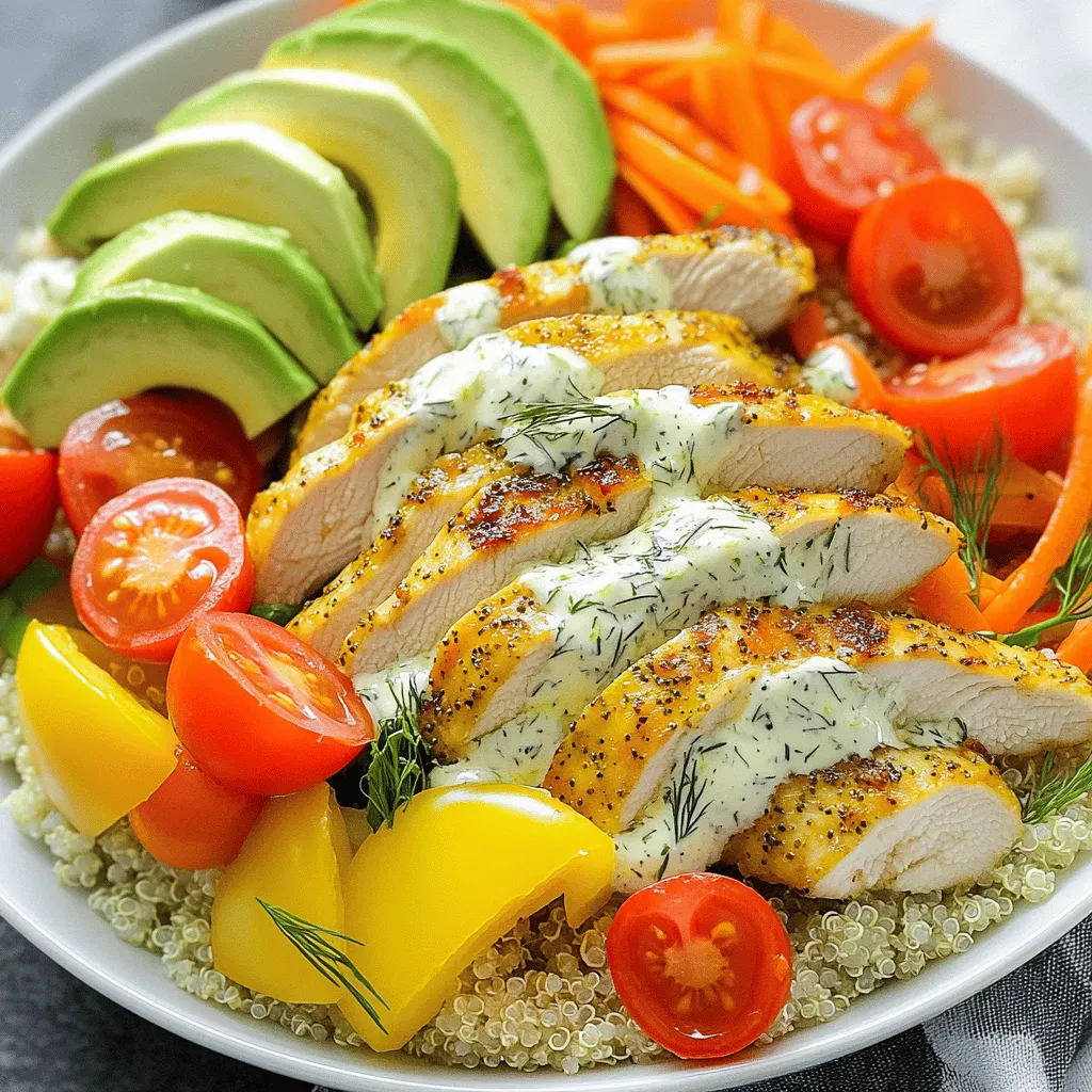 Now comes the fun part: assembling the power bowls! I start by scooping a portion of quinoa into each bowl. This serves as the base. Then, I layer on sliced chicken, diced bell peppers, halved cherry tomatoes, shredded carrots, and avocado slices. Each ingredient adds color and nutrition. To finish, I drizzle any remaining ranch dressing over the toppings. If I want, I can thin the Greek yogurt with a little water for a smoother finish. A sprinkle of fresh dill on top adds a nice touch and flavor.