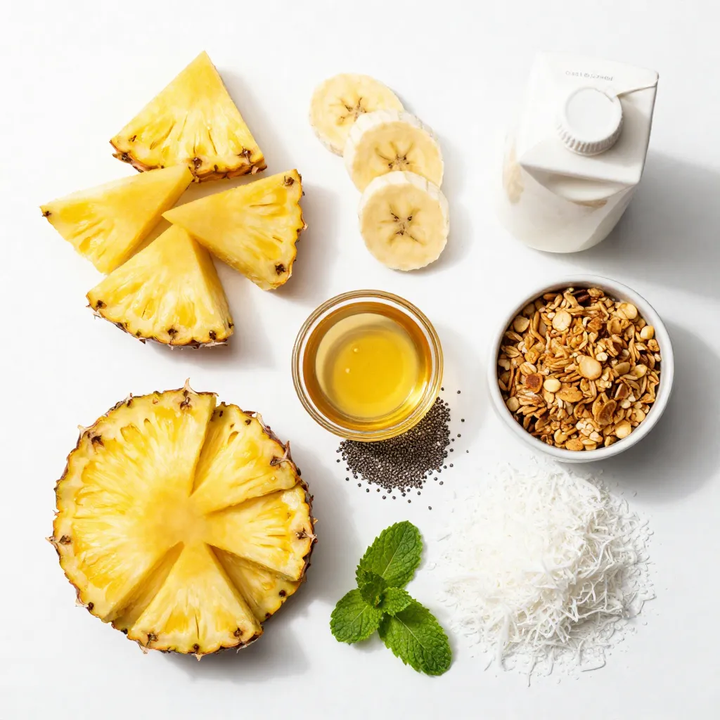 - 1 cup frozen pineapple chunks - 1 banana, sliced - 1 cup coconut milk (or any plant-based milk) - 1 tablespoon maple syrup (optional) - 1 tablespoon chia seeds - ¼ cup granola (for topping) - 2 tablespoons shredded coconut (for garnish) - Fresh mint leaves (for garnish) To start, you need some key ingredients for this smoothie bowl. Frozen pineapple chunks give your bowl a cool, tropical taste. A banana adds a creamy texture and natural sweetness. Coconut milk makes it rich and smooth. If you like it sweeter, you can add maple syrup. Chia seeds are great for nutrition and add a nice crunch. Granola gives a delightful topping, adding a nice bite. Shredded coconut on top brings extra flavor and texture. Finally, fresh mint leaves add a pop of color and freshness. These ingredients work together to create a vibrant, tasty dish. You can mix and match based on your taste. The pineapple and coconut make this bowl feel like a vacation in your mouth! Enjoy the bright flavors and healthy benefits with every spoonful. {{ingredient_image_1}} To start, gather your ingredients. You need frozen pineapple chunks, a sliced banana, and coconut milk. If you like sweetness, add some maple syrup. In a blender, mix the frozen pineapple, banana, coconut milk, and maple syrup. Blend this mix on high speed. Make sure it turns smooth and creamy. If it's too thick, add more coconut milk. Blend again until you get your ideal texture. Once the smoothie base is ready, pour it into a bowl. Take your time to make it look nice. Next, sprinkle chia seeds over the top. These seeds add a nice crunch and are good for you. Now comes the fun part! Sprinkle granola and shredded coconut on the smoothie. Make sure to spread them evenly for a great look. Finally, add fresh mint leaves on top. They give a nice touch and smell wonderful. Serve your smoothie bowl right away. Enjoy the fresh and tasty flavors! To get a creamy smoothie, blend frozen pineapple chunks with a sliced banana. Use one cup of coconut milk for a rich texture. If your smoothie is too thick, add more coconut milk. Blend on high speed until smooth. This helps break down the fruit well. No lumps should remain for a perfect bowl. If you want it sweeter, add maple syrup. You can also use other natural sweeteners. Honey or agave syrup works too. Start with one tablespoon and taste. Adjust to your liking. This will enhance the tropical flavor and balance the tartness of the pineapple. Serving your smoothie bowl well makes it fun. Pour the smoothie into a bowl, then sprinkle chia seeds on top. Add granola for crunch and shredded coconut for a touch of flair. Finish with fresh mint leaves for a pop of color. This makes your bowl look inviting and fresh. Enjoying your creation is part of the fun! Pro Tips Use Fresh Ingredients: For the best flavor, opt for fresh pineapple and ripe bananas when possible, as they enhance the natural sweetness and taste of your smoothie bowl. Adjust Consistency: If you prefer a thicker smoothie bowl, reduce the amount of coconut milk. For a thinner consistency, gradually add more until you reach your desired texture. Experiment with Toppings: Get creative with your toppings! Consider adding nuts, seeds, or different fruits to customize your smoothie bowl to your taste. Chill Your Bowl: For an extra refreshing experience, chill your bowl in the freezer for 10-15 minutes before serving. This keeps your smoothie bowl cold and enjoyable. {{image_2}} You can mix in other tropical fruits for fun. Try adding mango, kiwi, or papaya. Each fruit brings its own taste and color. These fruits blend well with the pineapple and banana. They also add extra vitamins and nutrients. You can even use berries for a twist. Strawberries or blueberries can add a nice tart flavor. Don't be afraid to experiment with your favorites! Toppings make your bowl special. You can use nuts like almonds, cashews, or walnuts. They add a nice crunch. Seeds like pumpkin or sunflower seeds also work well. They boost the health factor too. Dried fruits, like raisins or cranberries, add sweetness. You can mix and match to find your perfect combo. The choices are endless, so get creative! If you want to try different milks, go for it! Almond milk or oat milk can change the flavor. Coconut milk gives a rich, creamy taste. You can also try cashew milk for a nutty twist. Each milk brings its unique style. This way, you can make the smoothie bowl fit your taste. Choose what you love best! To store any leftover smoothie, pour it into a clean jar. Seal it tightly. Place it in the fridge. It keeps well for up to two days. If you want to save it longer, consider freezing. Smoothies lose some creaminess after being stored, so give it a good stir before serving. Yes, you can freeze the smoothie base! Just pour it into an ice cube tray or a freezer-safe bag. If you use a bag, flatten it for easy storage. When you want to enjoy it, thaw it in the fridge overnight. You can also blend the frozen cubes with a little coconut milk for a quick treat. The smoothie bowl stays fresh for about 24 hours in the fridge. If you freeze it, it can last up to a month. However, for the best taste and texture, enjoy it fresh! Always check for changes in smell or color before consuming leftovers. A smoothie bowl is a thick smoothie served in a bowl. You eat it with a spoon, not a straw. It has a creamy texture and is often topped with fruits, seeds, and nuts. Smoothie bowls are colorful and fun to make. They let you get creative with your toppings. You can use any fruit you like, such as bananas, berries, or mangoes. The base is usually made from blended fruits and liquids like coconut milk. Yes, you can make a smoothie bowl ahead of time. Blend your ingredients and store them in the fridge. It stays fresh for about one day. However, it’s best to top it right before serving. If you want to freeze it, pour the mixture into a freezer-safe container. It can last for a month. When you’re ready to eat, let it 