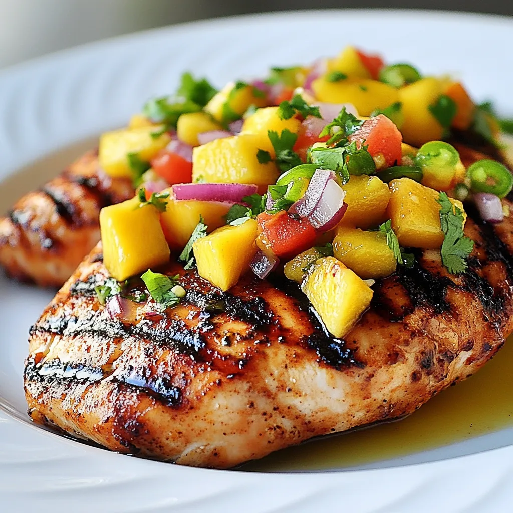 - Serve: Place the grilled chicken breasts on a serving platter. Top each piece with a generous scoop of the pineapple mango salsa.
