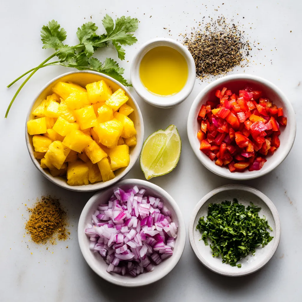 - Prepare the Salsa: In a medium bowl, combine the diced mango, pineapple, red bell pepper, red onion, jalapeΓ±o, and cilantro. Drizzle with lime juice and season with salt and pepper. Mix gently and set aside for the flavors to meld.