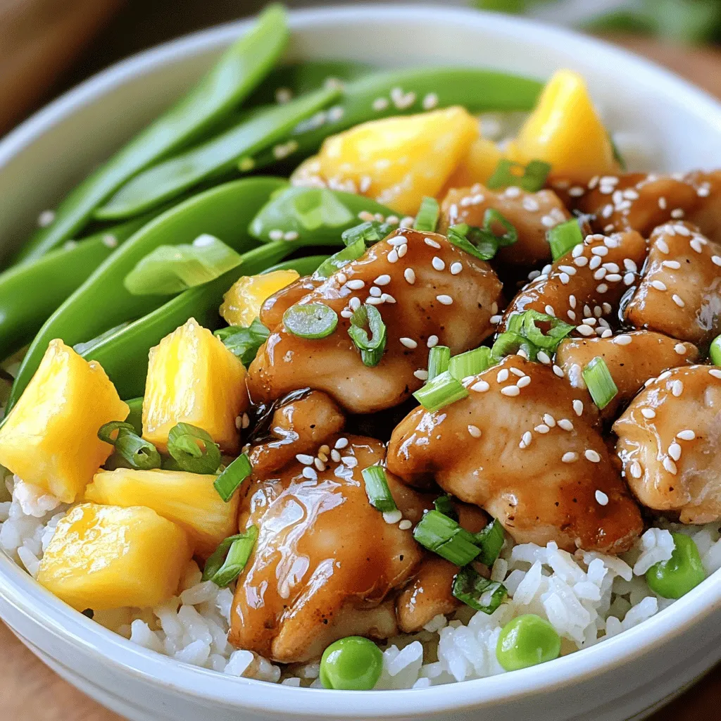 ![Gather these essential ingredients for your Pineapple Teriyaki Chicken Bowls. Each item adds to the meal's bright flavors. - 1 lb boneless, skinless chicken thighs - 1 cup fresh pineapple, diced - ½ cup teriyaki sauce - 1 tablespoon olive oil - 2 cups cooked jasmine rice - 1 bell pepper (red or yellow) - 1 cup snow peas - 2 green onions - Sesame seeds for garnish - Salt and pepper to taste Using fresh ingredients makes all the difference. The chicken thighs provide a juicy base for the dish. Fresh pineapple brings sweetness that pairs well with the salty teriyaki sauce. Jasmine rice serves as a lovely, fluffy base. For crunch and color, the bell pepper and snow peas are perfect. Green onions add a fresh bite while sesame seeds give a nice finish. This recipe is simple yet satisfying. You can find the full recipe in the provided link. Enjoy creating your own Pineapple Teriyaki Chicken Bowls! Start by taking your chicken thighs and cutting them into bite-sized pieces. In a bowl, combine the chicken pieces with ½ cup of teriyaki sauce. Add a pinch of salt and pepper for flavor. It’s best to let the chicken marinate for at least 20 minutes. For even more flavor, marinate it for up to 2 hours in the fridge. Next, heat 1 tablespoon of olive oil in a large skillet or wok over medium-high heat. Once the oil is hot, add in the marinated chicken. Cook for about 5-7 minutes. You want the chicken to turn a lovely golden brown while cooking through. Stir occasionally to ensure it cooks evenly. After the chicken is cooked, it’s time to add the veggies. Toss in the sliced bell pepper and snow peas. Cook them for another 3-4 minutes until they are tender-crisp. Now, stir in the diced pineapple and the remaining ¼ cup of teriyaki sauce. Cook for an additional 2-3 minutes. This helps the flavors meld together and warms the pineapple. Now for the fun part! In serving bowls, layer the cooked jasmine rice first. Then, top it with the teriyaki chicken and vegetable mixture. For a touch of flair, sprinkle sliced green onions and sesame seeds on top. This adds a nice crunch and a pop of color to your dish. For the complete recipe, check out the [Full Recipe]. To make the best Pineapple Teriyaki Chicken Bowls, focus on flavor. I recommend marinating the chicken for at least 20 minutes. If you have more time, let it sit for up to 2 hours. This extra time helps the chicken soak up the teriyaki sauce. When it comes to teriyaki sauce, choose one that you love. You can use store-bought or homemade. A good sauce adds depth to the dish. Look for sauces with natural ingredients to keep it fresh and tasty. For the chicken to shine, cook it right. Start with a hot skillet or wok. Use medium-high heat to get that golden brown color. This takes about 5 to 7 minutes. Make sure to stir occasionally so the chicken cooks evenly. The goal is to achieve a juicy texture. Avoid overcooking, as this can dry out the chicken. Keep an eye on it. If your stove has different settings, set it to medium-high for the best results. When serving, think about what pairs well with these bowls. Jasmine rice is a great base, but feel free to explore other options like brown rice or quinoa. Add colorful veggies like bell peppers and snow peas for a vibrant look. Setting the table is just as important. Use bowls that showcase the colorful layers. Garnish with green onions and sesame seeds. This makes the meal inviting and fun. Don't forget to add some chopsticks for a playful touch! {{image_2}} To make this dish gluten-free, swap the teriyaki sauce for a gluten-free alternative. Many brands offer tasty options. You can also make your sauce at home. For a low-carb version, use cauliflower rice instead of jasmine rice. This keeps the meal light but still full of flavor. You can change the protein in this dish. Try using tofu for a vegetarian option. Turkey is also a lean choice that works well. For the veggies, feel free to mix it up! Broccoli, carrots, or snap peas can add color and crunch. To give your Pineapple Teriyaki Chicken Bowls an extra kick, add some spices like ginger or garlic. Fresh herbs like cilantro or basil can brighten the dish. For a fun twist, try using different fruits. Mango or kiwi can add sweetness and a tropical feel. For the full recipe, check out the [Full Recipe]. To keep your Pineapple Teriyaki Chicken Bowls fresh, store leftovers in an airtight container. Make sure they cool down first. You can safely eat them within three days. After that, the flavor and texture may fade. When reheating, avoid the microwave if possible. Instead, use a skillet over low heat. This helps maintain the dish's texture and keeps the pineapple juicy. Stir occasionally until everything is warmed through. Yes, you can freeze Pineapple Teriyaki Chicken Bowls. To do this, pack the chicken and rice in a freezer-safe container. Leave out any fresh toppings, like green onions. When you're ready to eat, thaw it overnight in the fridge. Reheat in a skillet for the best results. To make homemade teriyaki sauce, you need just a few simple ingredients. Combine: - ½ cup soy sauce - ¼ cup brown sugar - 1 tablespoon rice vinegar - 1 tablespoon sesame oil - 1 teaspoon garlic (minced) - 1 teaspoon ginger (minced) Mix these together in a saucepan over medium heat. Stir until the sugar dissolves. Let it simmer for about 5 minutes until it thickens slightly. This sauce adds a rich flavor to your Pineapple Teriyaki Chicken Bowls. Yes, you can use chicken breasts instead of thighs. Chicken breasts cook faster and are leaner. They may dry out if cooked too long. Adjust your cooking time to about 4-6 minutes for chicken breasts. Cut them into smaller pieces for even cooking. If you prefer a different grain, try these options: - Brown rice - Quinoa - Cauliflower rice Brown rice gives a nutty flavor. Quinoa adds protein. Cauliflower rice is a low-carb choice. Each adds a unique twist to your bowl. Yes, this recipe is very kid-friendly. The sweet pineapple and
