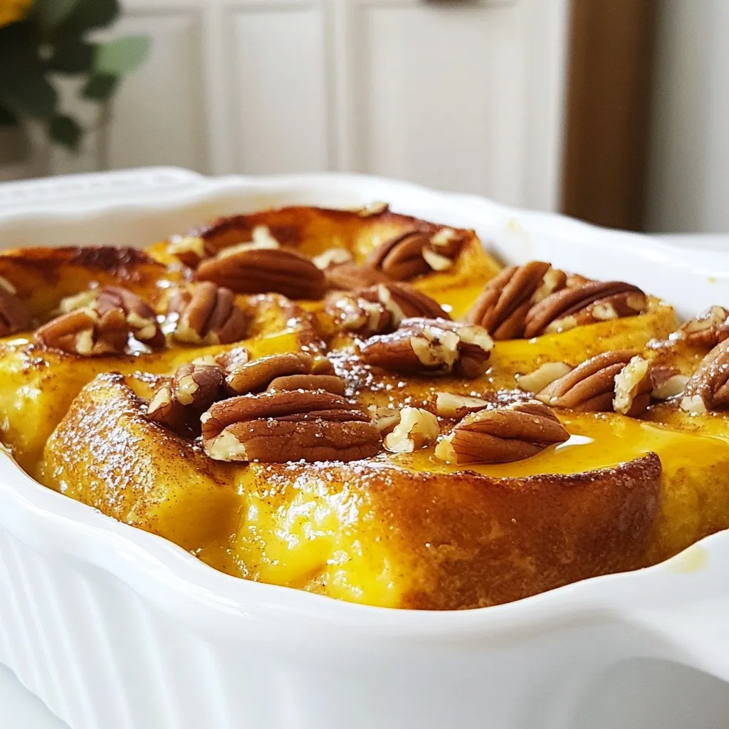 When you serve your pumpkin spice French toast bake, do it warm. Drizzle maple syrup over the top for a sweet touch. You can also add extra chopped pecans or a dollop of whipped cream for a special treat. This dish is perfect for breakfast or brunch, and it brings a cozy feel to any meal. Enjoy each bite!