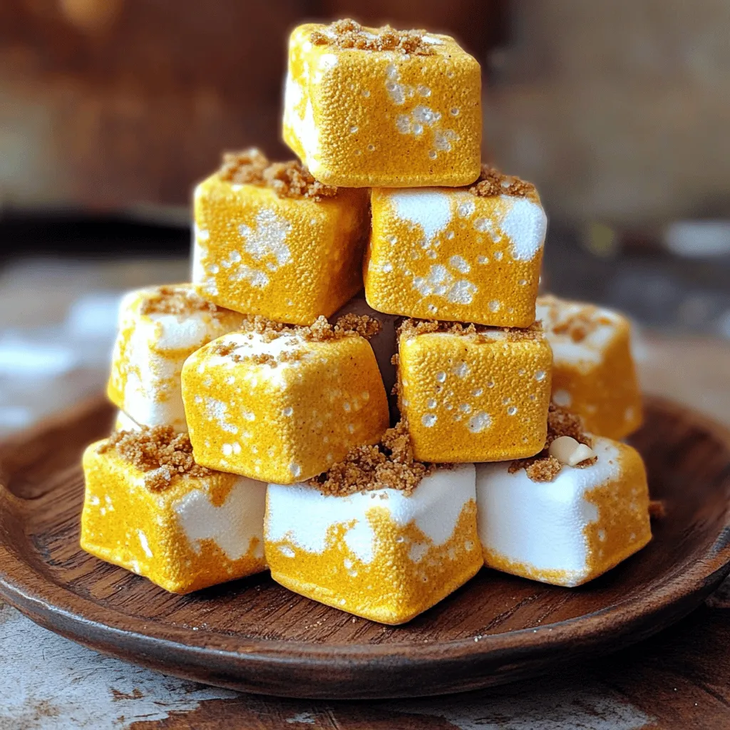 - 4 cups rice cereal - 3 cups mini marshmallows - 3 tablespoons unsalted butter - 1 teaspoon pumpkin pie spice - 1 teaspoon vanilla extract - 1/4 cup canned pumpkin puree - Pinch of salt - 1/2 cup white chocolate chips (optional) - 1/4 cup crushed graham crackers (for topping) To make my pumpkin spice marshmallow treats, you need a few simple ingredients. I love using rice cereal for its crunch. The mini marshmallows create a sweet base. Unsalted butter adds richness. Pumpkin pie spice gives that warm fall flavor. The vanilla extract enhances the taste. Canned pumpkin puree adds moisture and nutrition. A pinch of salt balances the sweetness. If you want, you can include white chocolate chips for extra creaminess. Finally, crushed graham crackers work great on top for a fun crunch. This list makes it easy to gather your items. I always check my pantry first to avoid extra trips to the store. You can find most ingredients in any grocery store. For the full recipe, follow the steps after gathering these tasty ingredients. 1. Melt butter and marshmallows Start by melting three tablespoons of unsalted butter in a large saucepan over low heat. Stir it gently until the butter is completely melted. Next, add in three cups of mini marshmallows. Keep stirring until the marshmallows melt and become smooth. This step is key for a gooey treat! 2. Mix in pumpkin and spices Once the marshmallows are melted, stir in one teaspoon of pumpkin pie spice, one teaspoon of vanilla extract, and a quarter cup of canned pumpkin puree. Add a pinch of salt for balance. This mix brings that classic pumpkin flavor to your treats! 3. Combine with rice cereal Remove the saucepan from the heat. Immediately add four cups of rice cereal to the melted mixture. Stir well to make sure all the cereal is coated. This will give your treats their delightful crunch. 1. Press into a baking dish Prepare a greased 9x13-inch baking dish. Pour the mixture into the dish and press it down evenly. Use a spatula or your hands (lightly greased) to flatten the top. This helps the treats hold their shape. 2. Garnish with graham crackers Sprinkle a quarter cup of crushed graham crackers over the top. This adds a nice texture and a hint of sweetness. It makes your treats look festive! 3. Cut into squares Let your treats cool completely for about 30 minutes. Once cooled, cut them into squares or bars. You can stack them in a pyramid on a plate for a fun presentation. Enjoy your delicious Pumpkin Spice Marshmallow Treats! For more details, check out the Full Recipe. To make the best pumpkin spice marshmallow treats, focus on texture. You want them soft yet firm. Use fresh mini marshmallows for better melting. Also, mix quickly once you add the rice cereal. This helps keep the treats light and fluffy. Avoid sticking when pressing the mixture into the dish. Lightly grease your hands or spatula with butter. This simple step helps you shape the treats without a mess. One big mistake is overheating the marshmallows. Heat them slowly and keep stirring. If they get too hot, they can turn into a gooey mess. Another common error is not letting the treats cool enough. Give them at least 30 minutes to set. If you cut them too early, they won't hold their shape. For tips on making these treats, check out the Full Recipe. {{image_2}} You can make your Pumpkin Spice Marshmallow Treats even better with some simple swaps. If you need a gluten-free option, use gluten-free rice cereal. If you want a nut-free version, skip any nuts you might add. You can also replace the white chocolate chips with carob chips for a twist. For a richer flavor, try adding a few tablespoons of caramel sauce. This adds a sweet touch that pairs well with pumpkin spice. Chopped nuts, like pecans or walnuts, give a nice crunch. Just remember to mix them in gently to keep the treats soft. Want to make your treats more festive? Add candy corn on top for color and fun. It gives a great fall look and a little added sweetness. You can also use seasonal spices. Instead of just pumpkin pie spice, try a dash of nutmeg or cinnamon for extra warmth. Using different extracts can also change the flavor. Almond extract can give a nice twist if you want something unique. These variations help you personalize your treats for any occasion. Plus, they keep your guests guessing and excited for more! To keep your pumpkin spice marshmallow treats fresh, store them in an airtight container. This helps to lock in moisture and flavor. Line the container with parchment paper to prevent sticking. Keep the treats at room temperature for up to a week. If you live in a humid area, place them in the fridge. This will help them stay firm. Avoid placing the treats near strong-smelling foods. Marshmallows can absorb odors, which can change their taste. For the best texture, enjoy the treats within a few days. If you want to save some treats for later, freezing is a great option. Wrap each treat in plastic wrap. Then, place them in a freezer-safe bag or container. Make sure to remove as much air as possible. This prevents freezer burn. To thaw, simply take out the treats and let them sit at room temperature for about 20 minutes. You can also pop them in the microwave for a few seconds to soften them up. They can last for up to three months in the freezer. Enjoy the sweet taste of fall even when it's not pumpkin season! Can I make these treats in advance? Yes, you can make these treats ahead of time. They taste great after a day or two. Just store them in an airtight container. This keeps them fresh and soft. What can I substitute for marshmallows? If you need a substitute, try using a vegan marshmallow or rice syrup. These options work well, but the texture may be slightly different. They won’t fluff up like regular marshmallows. How long do these treats last? These treats last about a week at room temperature. If you want to keep them longer, store them in the fridge. They may harden a bit in the fridge, so let them 