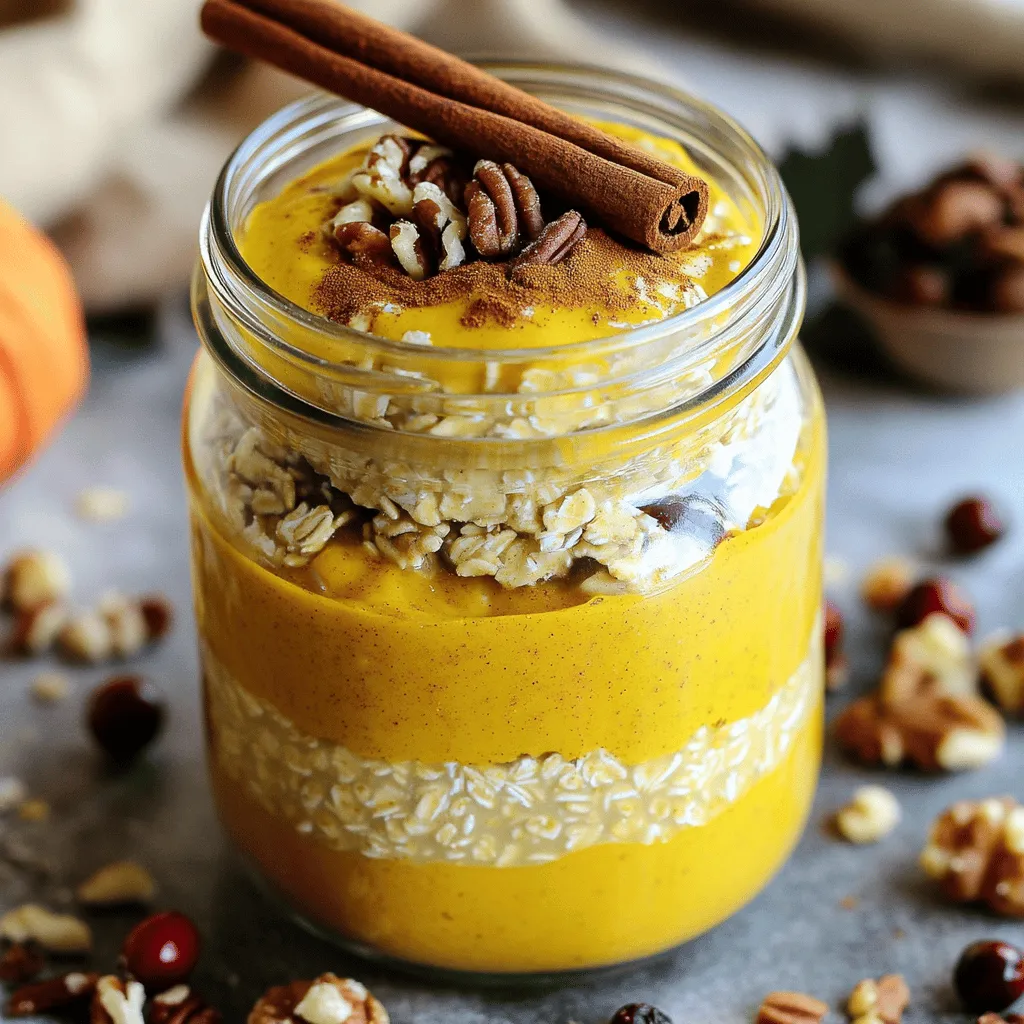 - 1 cup rolled oats - 1 cup almond milk (or any milk of your choice) - 1/2 cup canned pumpkin puree - 1 tablespoon maple syrup - 1 teaspoon pumpkin pie spice - 1/2 teaspoon vanilla extract - Pinch of salt - Optional toppings: chopped nuts, dried cranberries, coconut flakes, or yogurt To make pumpkin spice overnight oats, you need a few simple ingredients. Rolled oats form the base. They soak up the milk and flavor well. I love using almond milk, but feel free to choose your favorite. Canned pumpkin puree adds creaminess and a rich taste. The maple syrup gives it a sweet touch. Pumpkin pie spice adds that warm, cozy flavor we all love. A dash of vanilla makes everything better. Lastly, a pinch of salt balances the sweetness. You can also add toppings for extra crunch and flavor. Chopped nuts give a nice texture. Dried cranberries offer a sweet and tangy bite. Coconut flakes add a tropical twist, while yogurt can make it creamy. Check the [Full Recipe] for more details on preparation and serving ideas. - Combine ingredients in a mixing bowl or mason jar. - Stir well until fully incorporated. - Cover and refrigerate overnight. Making pumpkin spice overnight oats is easy and fun. First, gather all your ingredients. You will need rolled oats, almond milk, pumpkin puree, maple syrup, pumpkin pie spice, vanilla extract, and a pinch of salt. This mix creates a creamy and flavorful base. Next, place your rolled oats in a bowl or a mason jar. Add the almond milk and pumpkin puree. Then, pour in the maple syrup and sprinkle the pumpkin pie spice. Don’t forget the vanilla extract and salt! Now, stir everything together until it’s well mixed. You want all the oats to soak in the liquid. This step is key for flavor. Once it looks good, cover your bowl or seal the jar. Finally, pop it in the fridge. Let it chill overnight. This soaking time is where the magic happens! - Give the oats a good stir before serving. - Add desired toppings for flavor and texture. In the morning, your oats will be ready. Take them out of the fridge and give the mixture a good stir. If it looks too thick, don’t worry. Just add a splash of almond milk to get your preferred texture. Now it’s time to serve! You can enjoy your oats in a bowl or right from the jar. For extra fun, add toppings. Some great choices are chopped nuts, dried cranberries, coconut flakes, or a dollop of yogurt. These toppings add crunch and sweetness. - Reference for detailed ingredient quantities and preparation methods. If you want the exact amounts and all the steps, check out the Full Recipe. It provides all the details to make this delightful dish perfectly! You can make this recipe your own. Try different milk options, like oat or soy milk. This can change the flavor and texture. Adjust the sweetness by using more or less maple syrup. Taste as you go to get it just right. To change the thickness, add more milk if you want it thinner. If you like a richer flavor, let it soak longer. The oats will absorb more pumpkin and spice, making each bite tasty. Serving your oats in clear jars makes them look great. You can see the layers, which is fun! Add extra spices on top for a nice touch. A sprinkle of cinnamon can bring out the fall vibe, making your breakfast even more inviting. {{image_2}} You can change the flavor of your oats easily. Try using apple puree instead of pumpkin. This adds a sweet and fruity taste that feels like fall. Another idea is to swap pumpkin spice for chai spice. This gives your oats a warm, spicy kick that's perfect for cozy mornings. Get creative with your ingredients! You can blend in chia seeds or flaxseeds for a nutrient boost. These seeds add fiber and healthy fats to your oats. If you prefer a different sweetener, use honey instead of maple syrup. Honey gives a nice floral note that pairs well with pumpkin. If you're vegan, simply use a plant-based yogurt. This keeps your oats creamy without dairy. For those who need gluten-free options, use certified gluten-free oats. This ensures you can enjoy this tasty dish without worry. To keep your pumpkin spice overnight oats fresh, store them in airtight containers in the refrigerator. This method prevents the oats from drying out or absorbing unwanted odors. You should enjoy them within 3-5 days for the best taste and texture. If you made a big batch, you can freeze the oats. Portion them into freezer-safe containers or bags. When you’re ready to eat, thaw them overnight in the fridge. This way, you can have a quick breakfast ready to go. You can enjoy your oats cold straight from the fridge. If you prefer warm oats, reheat them gently in the microwave. Just heat in short bursts, stirring in between to ensure even warmth. To make great overnight oats, start with a bowl or jar. Mix your rolled oats, almond milk, pumpkin puree, maple syrup, pumpkin pie spice, vanilla, and a pinch of salt. Stir well to combine everything. Make sure the oats are fully covered in the liquid. Cover the jar or bowl tightly. Then, place it in the fridge overnight. This soaking time helps the oats absorb the flavors. Yes, you can use instant oats, but the texture will be different. Instant oats cook faster and will be softer. You need less soaking time, around 30 minutes to 1 hour. Rolled oats keep a nice chewiness that many enjoy. If you like creamy oats, instant oats work well. But for a heartier bite, stick with rolled oats. Pumpkin spice overnight oats stay fresh for 3 to 5 days in the fridge. Proper storage is key. Use an airtight container to keep them safe. After a few days, the flavor may fade, but they stay safe to eat. If you want the best taste, enjoy them within the first couple of days. This keeps the oats fresh and flavorful. In this blog post, we explored making delicious pumpkin spice overnight oats. You learned about the key ingredients, preparation steps, and how to customize your oats. We also shared storage tips to keep them fresh and tasty. These oats are flexible and fun to m