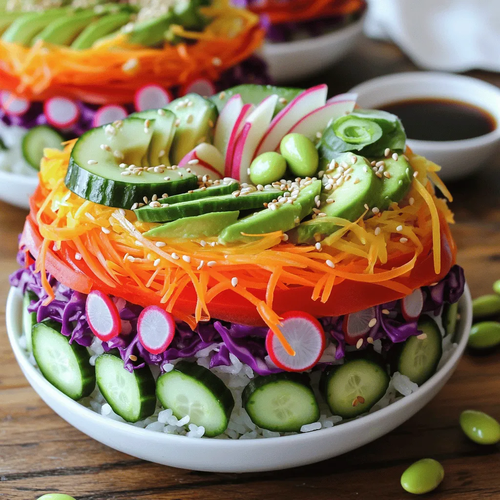 To make your Rainbow Veggie Sushi Bowls, you need some key ingredients. These ingredients create the base and flavors of your dish. Here’s what you need: - 1 cup sushi rice - 1 ¼ cups water - 1 tablespoon rice vinegar - 1 tablespoon sugar - 1 teaspoon salt These ingredients help you prepare the sushi rice, which is the heart of the bowl. The best part of these bowls is the colorful fresh veggies. You can use a variety of vegetables to make your dish vibrant and tasty. Here are my favorites: - 1 small cucumber, julienned - 1 medium carrot, grated - 1 ripe avocado, sliced - 1 small red bell pepper, thinly sliced - ½ cup purple cabbage, shredded - 1 small radish, thinly sliced - ¼ cup edamame (shelled) These vegetables not only add color but also nutrients and crunch. Feel free to mix and match based on what you like! For a fun twist, add some optional toppings to elevate your sushi bowls. These enhancements can bring extra flavor and texture: - 2 sheets nori, cut into strips - Sesame seeds for garnish - Soy sauce for serving These toppings will make your sushi bowls even more delicious. You can explore different flavors and textures with each bite. For the complete recipe, check out the Full Recipe section. To start, rinse the sushi rice under cold water. Rinse until the water runs clear. This step removes excess starch. Next, drain the rice well. In a medium pot, combine the rinsed rice and 1 ¼ cups of water. Bring this mixture to a boil. Once it boils, reduce the heat to low. Cover the pot and let it simmer for 15 minutes. After 15 minutes, remove it from the heat. Let the rice sit covered for another 10 minutes. This resting time helps the rice become fluffy. In a small bowl, mix 1 tablespoon of rice vinegar, 1 tablespoon of sugar, and 1 teaspoon of salt until dissolved. Gently fold this mixture into the warm rice. This adds flavor and a slight tang to your sushi rice. Grab a serving bowl and spoon in a generous portion of the seasoned sushi rice. Start by creating a base for your veggies. Next, artfully arrange the vegetables over the rice. Use the julienned cucumber, grated carrot, sliced avocado, thinly sliced red bell pepper, shredded purple cabbage, thinly sliced radish, and shelled edamame. Aim for a rainbow effect with your colors. To add a fun twist, place nori strips between the veggies. This adds texture and flavor. Finally, sprinkle sesame seeds on top for a nice crunch. Use fresh, crisp vegetables for the best taste. Cut them into even shapes for a pretty look. When assembling, take your time to create a colorful display. This makes the dish inviting. If you want extra flavor, serve the bowl with soy sauce on the side for dipping. Remember, you can customize your bowl based on what you have at home. Check out the Full Recipe for more details on ingredients and steps! To get perfect sushi rice, start with high-quality rice. Rinse it well under cold water. This removes excess starch and helps it cook evenly. Use a 1:1.25 rice-to-water ratio for best results. Once cooked, let it sit covered for 10 minutes. This keeps it fluffy. Mix in rice vinegar, sugar, and salt gently. This adds flavor without crushing the grains. Make your sushi bowl eye-catching by arranging the veggies in a rainbow pattern. Use bright colors like red bell pepper and purple cabbage. Place the green avocado and cucumber against the rice for contrast. Nori strips can add a nice touch. Sprinkle sesame seeds on top for extra flair. Remember, we eat with our eyes first! One common mistake is overcooking the rice. This makes it mushy. Stick to the cooking times mentioned in the Full Recipe. Another mistake is not letting the rice rest. This step is key to achieving the right texture. Lastly, avoid overcrowding your bowl. Each ingredient should shine on its own. {{image_2}} You can switch up the veggies in your Rainbow Veggie Sushi Bowl. Try using fresh spinach for a leafy crunch. Radishes add a spicy kick, while sweet corn brings brightness. You could also use steamed broccoli for a tender bite. Keep experimenting with colors and textures to make each bowl unique. Adding protein boosts your sushi bowl’s nutrition. Cooked shrimp or crab meat gives a seafood twist. Grilled chicken adds heartiness, while tofu provides a great plant-based option. You can also use chickpeas for a nutty flavor. These proteins not only fill you up but also enhance the dish. The right sauce can elevate your sushi bowl. Try a spicy mayo for a creamy kick. You can mix mayo with sriracha for heat. A tangy ponzu sauce adds brightness. For a sweet touch, drizzle some teriyaki sauce over the top. These sauces bring extra flavor and excitement to your meal. Check the Full Recipe for more ideas! To keep your leftover sushi bowls fresh, store them in an airtight container. Place the container in the fridge. This will help keep the veggies crisp and the rice moist. Try to eat the leftovers within two days for the best taste and quality. When reheating sushi rice, add a splash of water to keep it moist. Use a microwave-safe bowl and cover it with a damp paper towel. Heat for about 30 seconds at a time. Stir and check until the rice is warm. Avoid heating too long to prevent it from getting dry. Always use the freshest veggies for your sushi bowls. Store them in the fridge to keep them crisp. Wrap leafy greens like cabbage in a damp towel to keep them fresh longer. Check your ingredients often and use them up to avoid waste. This way, you enjoy vibrant flavors in every bite. For the complete recipe, check out the Full Recipe. Yes, you can use brown rice for sushi bowls. Brown rice adds a nutty flavor and more fiber. However, it has a different texture than white sushi rice. Brown rice takes longer to cook too. So, adjust the cooking time. It usually takes about 40-45 minutes to cook brown rice. Still, the result is healthy and tasty. You can keep sushi bowls in the fridge for about 2-3 days. Store them in an airtight container. This keeps t