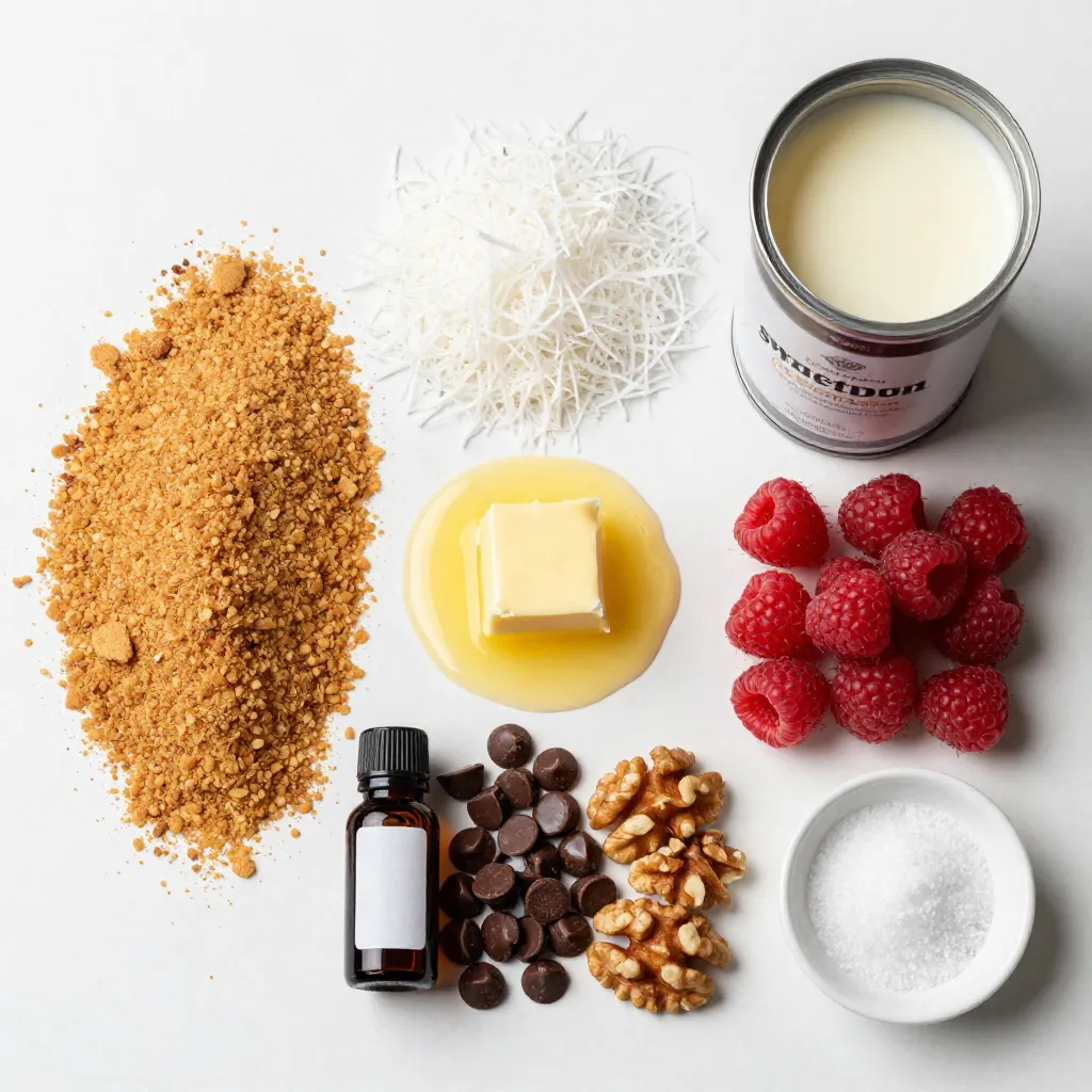 For this recipe, you will need precise measurements to get the best results. Use 1 ½ cups of graham cracker crumbs to form a solid base. You will also need ½ cup of unsweetened shredded coconut to add flavor and texture. Melt ½ cup of unsalted butter to bind the crust together. The sweetened condensed milk requires 1 cup to make the layers creamy and sweet. Fresh raspberries bring a burst of flavor, so make sure to use 1 cup. You will want 1 cup of semi-sweet chocolate chips for that rich taste. If you like nuts, add ½ cup of chopped walnuts or pecans. Lastly, you will need ½ teaspoon of vanilla extract and a pinch of salt to enhance the flavors.