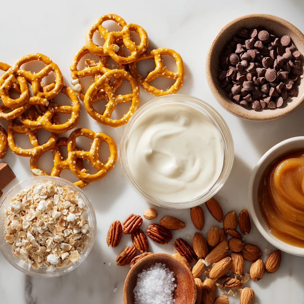 To make the best salted caramel pretzel bark, you need simple and tasty ingredients. Here’s what you’ll gather: