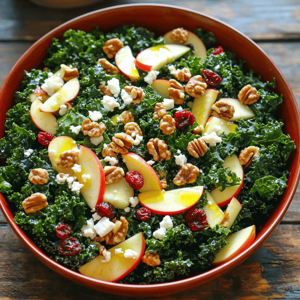 . Start by prepping the kale. Remove the stiff stems and chop the leaves. Place the kale in a large bowl. Add a pinch of salt and massage the leaves for 2-3 minutes. This makes the kale softer and brighter. Massaging also enhances the flavor. Seasoning is key during this step. The salt helps break down the tough fibers in kale. It makes the leaves tender and ready to absorb the dressing. Now it’s time to mix in the fruits and nuts. Add the diced apple to the kale. The sweet crunch of the apple pairs well with the greens. Next, toss in the toasted walnuts. Their nutty flavor adds a nice contrast. If you like, sprinkle in some crumbled feta cheese for creaminess. It’s optional but adds a great taste. You can also mix in dried cranberries or cherries. They bring a burst of sweetness to the salad. For the dressing, whisk together olive oil, apple cider vinegar, honey or maple syrup, cinnamon, salt, and pepper in a small bowl. Whisking helps blend all the ingredients smoothly. To ensure an even coat, pour the dressing over the salad. Gently toss the salad until everything is covered. Let the salad sit for about 5-10 minutes. This allows the flavors to meld nicely before serving. For the full recipe, refer to the previous sections. To make your Apple Walnut Kale Salad pop, try adding fresh herbs like parsley or mint. You can also sprinkle some black pepper or a pinch of cayenne for a kick. Letting the salad sit for a bit is key. This resting time helps the flavors mix and the kale to soften more. Aim for about 5 to 10 minutes before serving. When it comes to presentation, use a large, colorful bowl. The bright greens of kale and the reds of apples make a lovely mix. Garnish with extra walnuts and apple slices on top. This adds a nice look and texture. Pair the salad with grilled chicken, fish, or a warm loaf of bread. These options make it a full meal. If you have leftovers, store the salad and dressing separately. This keeps the kale fresh and crunchy. Use an airtight container for the salad and a small jar for the dressing. You can keep the salad in the fridge for up to two days. For longer freshness, try to store ingredients like walnuts and apples in cool, dry places. This way, they stay crisp and tasty. For the complete recipe, check out the Full Recipe section. {{image_2}} If you want to switch things up, consider using different fruits and nuts. For apples, pears or peaches work well. They bring a nice sweetness and crunch. Instead of walnuts, try pecans or almonds; each adds a unique flavor. For those avoiding dairy, you can skip the feta cheese. Try using avocado for creaminess or a sprinkle of nutritional yeast for a cheesy flavor. Both options keep the salad tasty and fresh. To make your salad more filling, add grains like quinoa or farro. They boost protein and fiber. You can also toss in other fruits, like sliced strawberries or mandarin oranges. These fruits add color and flavor, making the salad even more appealing. Nuts can also vary; try pumpkin seeds or sunflower seeds for a different crunch. Each add-in can change the taste and texture of your dish. Vinaigrettes can bring new life to your salad. Instead of the basic dressing, try a balsamic vinaigrette for a tangy kick. A lemon vinaigrette adds brightness and zest, perfect for summer days. For a sweet and savory twist, mix maple syrup with your dressing. It pairs well with the apples and walnuts. You can also add spices like ginger or garlic for extra depth. Experiment with these ideas to find your favorite flavor combination. For the complete recipe, check out the Full Recipe section. To make kale less bitter, massage it. Take your chopped kale and sprinkle a pinch of salt on it. Use your hands to massage the kale for about 2-3 minutes. This softens the leaves and brightens their color. It also helps reduce bitterness. You can soak the kale in cold water for 10-15 minutes. After soaking, drain and dry the kale well. This helps make it taste milder. Yes, you can make this salad ahead of time. Prepare the salad without the dressing first. Store the salad in an airtight container in the fridge. This keeps it fresh for about 1-2 days. You can mix the dressing and keep it separate. Add the dressing just before serving. This way, the salad stays crisp and tasty. Apple Walnut Kale Salad pairs well with many dishes. It complements grilled chicken or salmon nicely. You can also serve it with roasted vegetables or a hearty soup. If you want a vegetarian option, try it with quinoa or lentils. This salad adds freshness and crunch to any meal. You can find the full recipe for this salad to explore more. Prep time is just 15 minutes. Total time is also 15 minutes. This recipe serves four. To start, prepare the kale. In a large bowl, massage the chopped kale with a pinch of salt. Do this for about 2-3 minutes. It should soften and turn bright green. This step makes the kale taste better. Next, add the diced apple, toasted walnuts, and dried cranberries or cherries. If you want, you can also add crumbled feta cheese. In a small bowl, whisk together the olive oil, apple cider vinegar, honey or maple syrup, cinnamon, salt, and pepper. Mix until everything is combined. Now pour the dressing over the salad. Gently toss everything together until it is evenly coated. Let the salad sit for about 5-10 minutes. This allows the flavors to blend together. When serving, present the salad in a colorful bowl. Garnish with extra walnuts and apple slices for a nice touch. Drizzle some extra dressing just before serving for added appeal. [Insert image of the finished Apple Walnut Kale Salad here] This Apple Walnut Kale Salad combines fresh flavors and great nutrition. You learned how to prepare the kale, mix in fruits and nuts, and create a tasty dressing. I shared tips for enhancing flavors and storage ideas. The salad is also versatile, allowing for ingredient swaps to suit your taste. Enjoy this healthy dish as a side or main meal. You can make it y